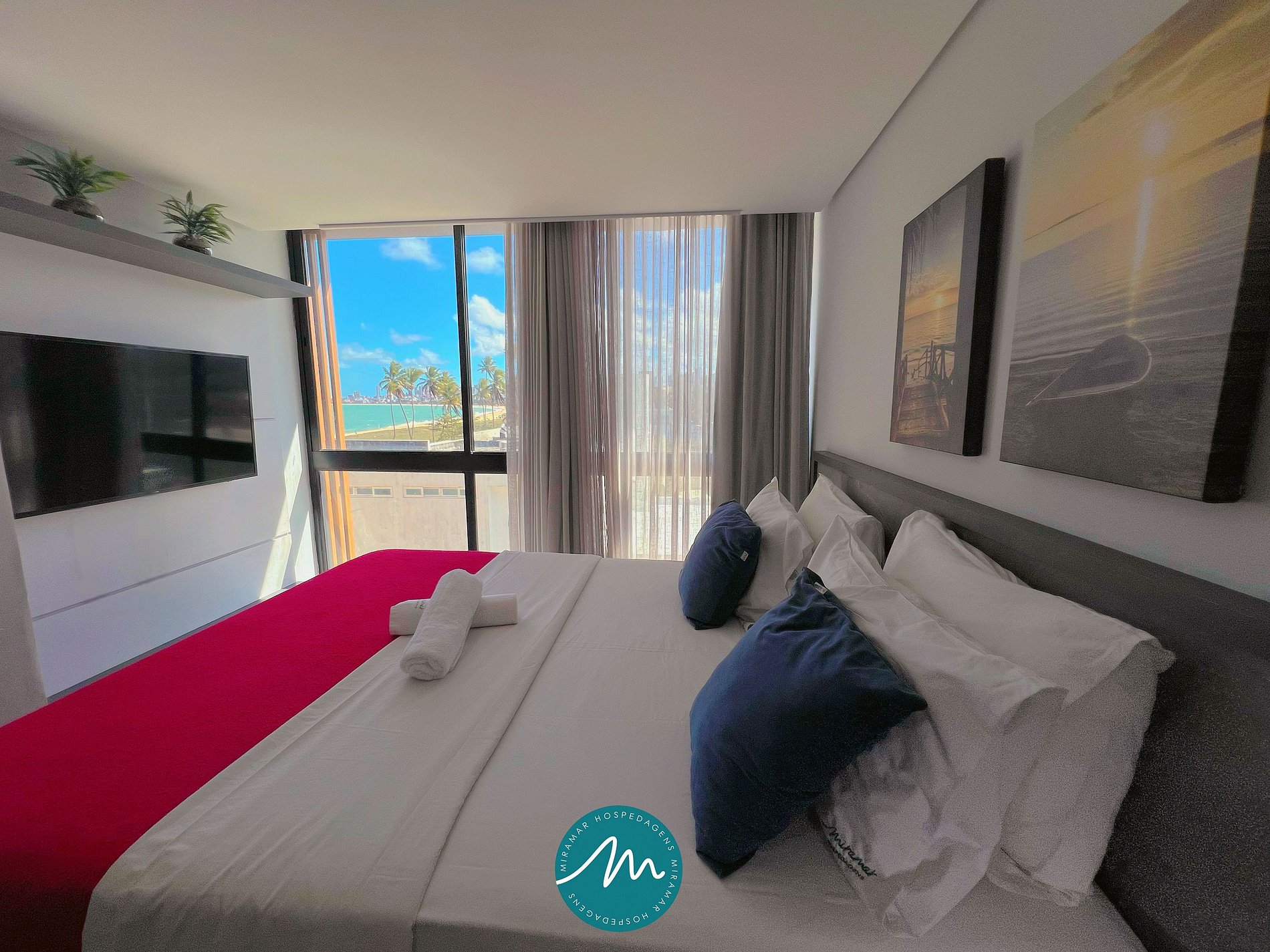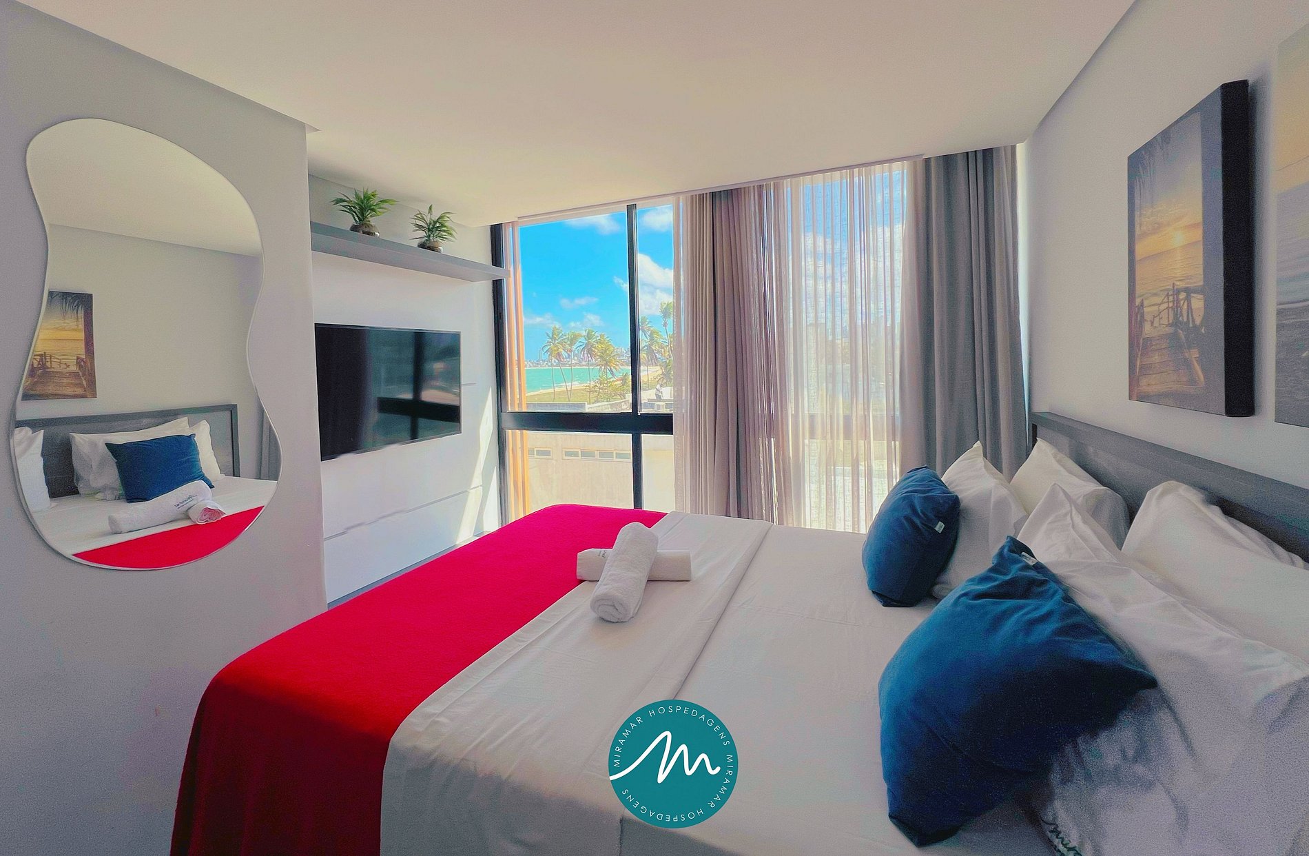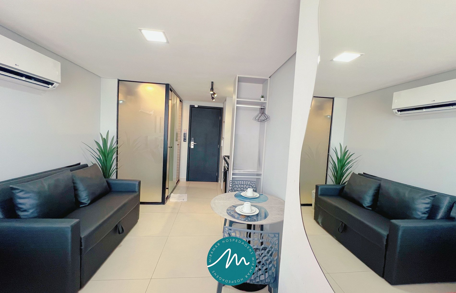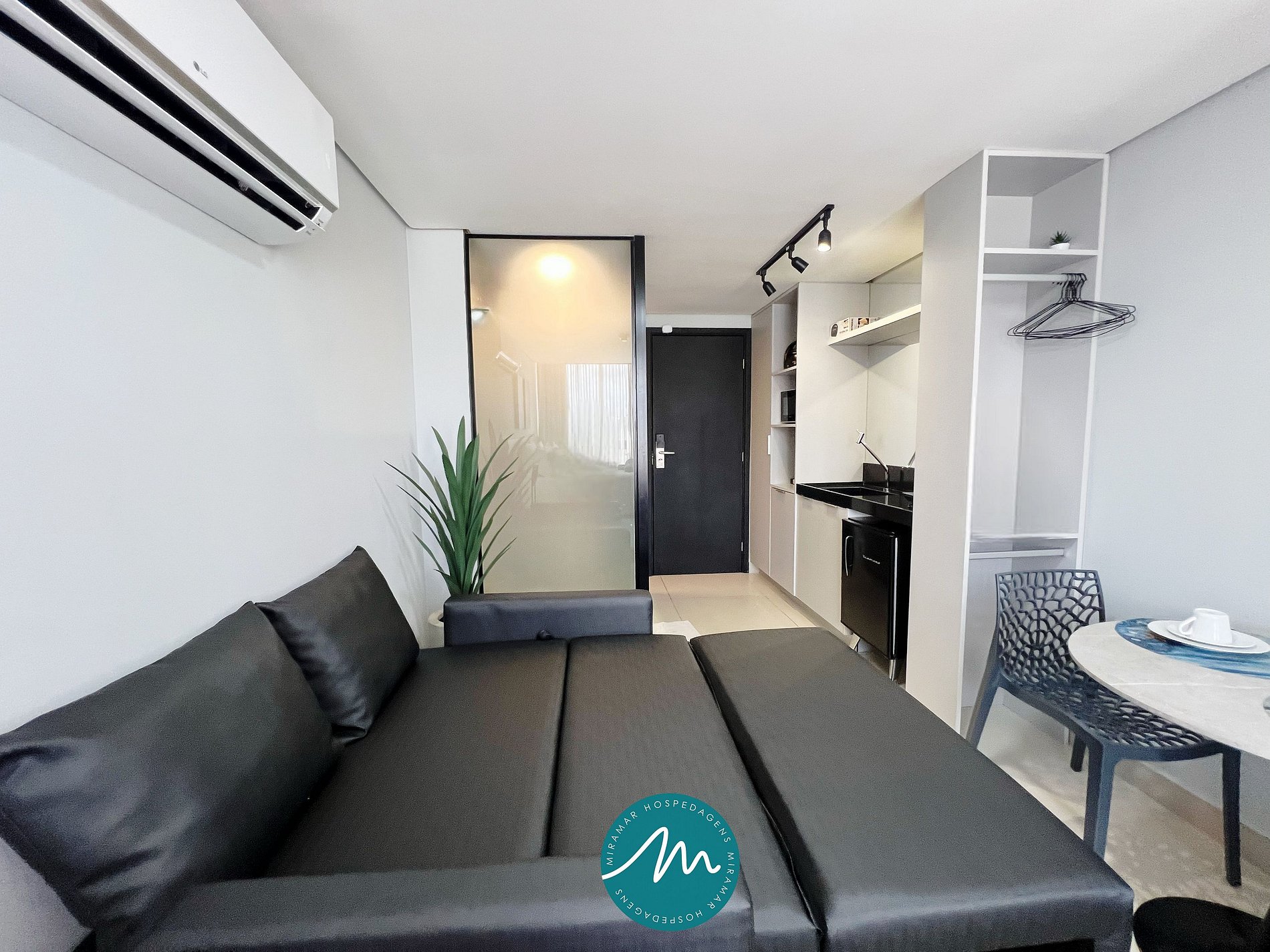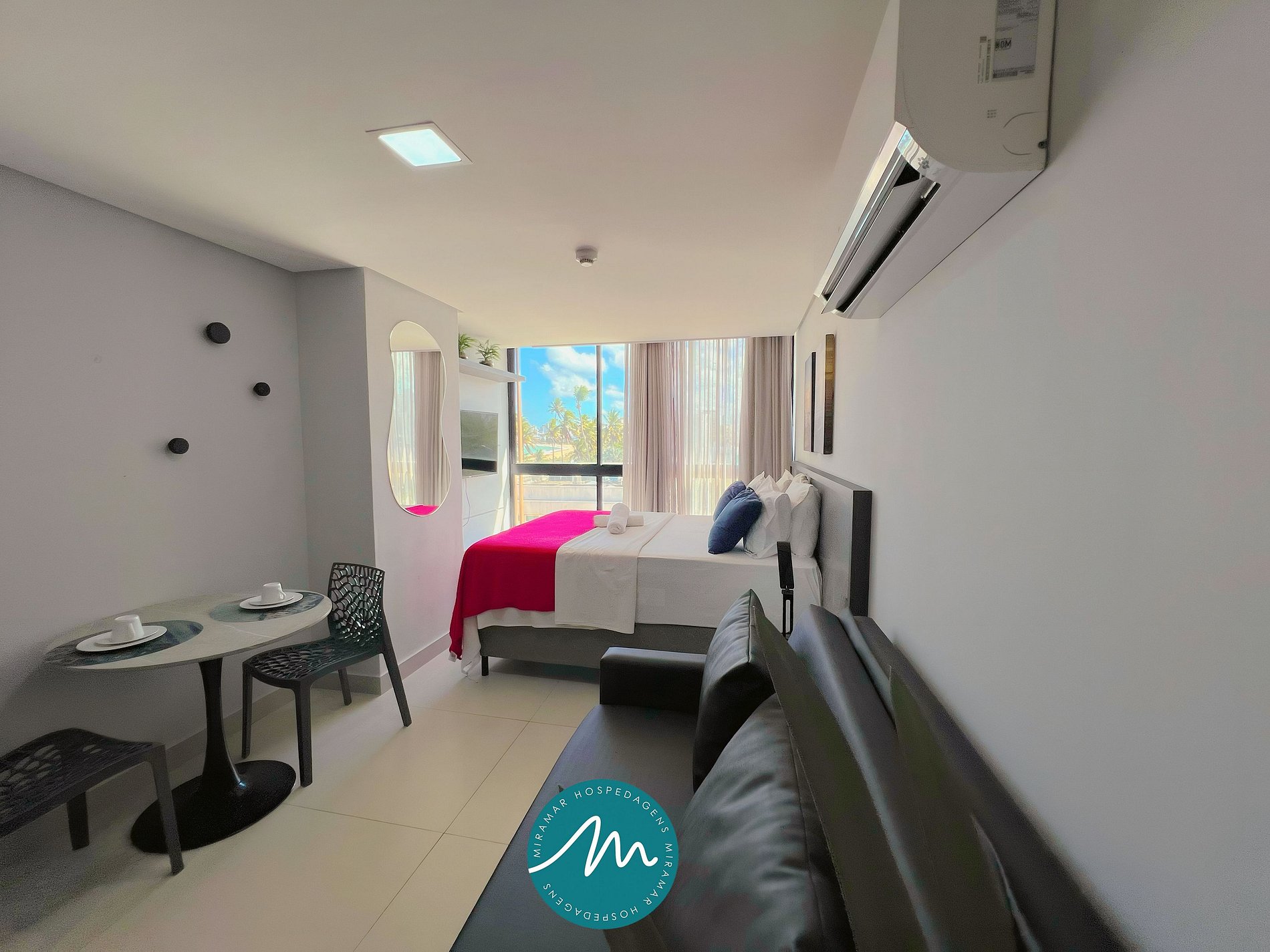 Flat confortável climatizado com ar-condicionado, ideal para acomodar até 4 hóspedes com praticidade e bem-estar. O espaço conta com cama de casal e sofá-cama, além de uma agradável vista lateral para o mar pela janela.