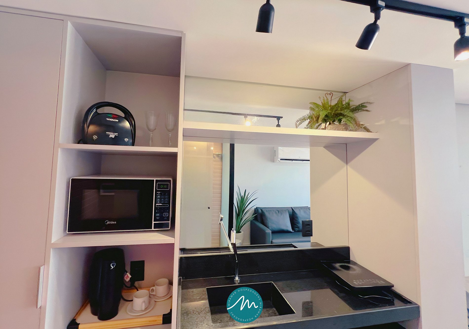 Para refeições e momentos de apoio, o ambiente dispõe de mesa com duas cadeiras e espelho. A área de cozinha é compacta e funcional, equipada com fogão de indução de uma boca, frigobar, sanduicheira, micro-ondas, louças e talheres, permitindo o preparo de refeições simples durante a estadia.