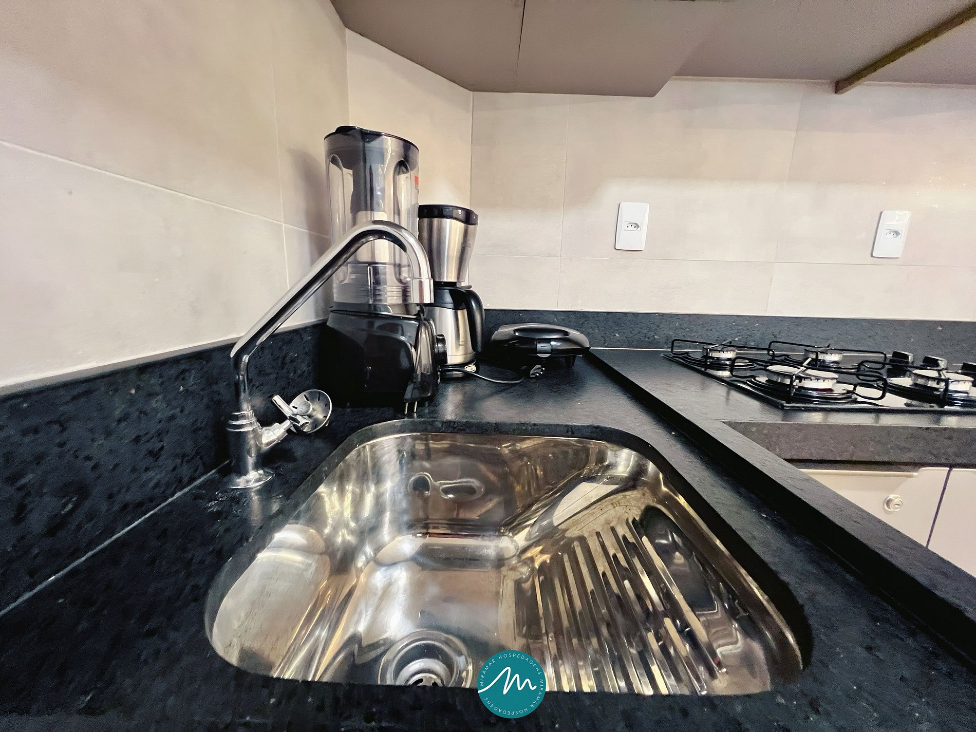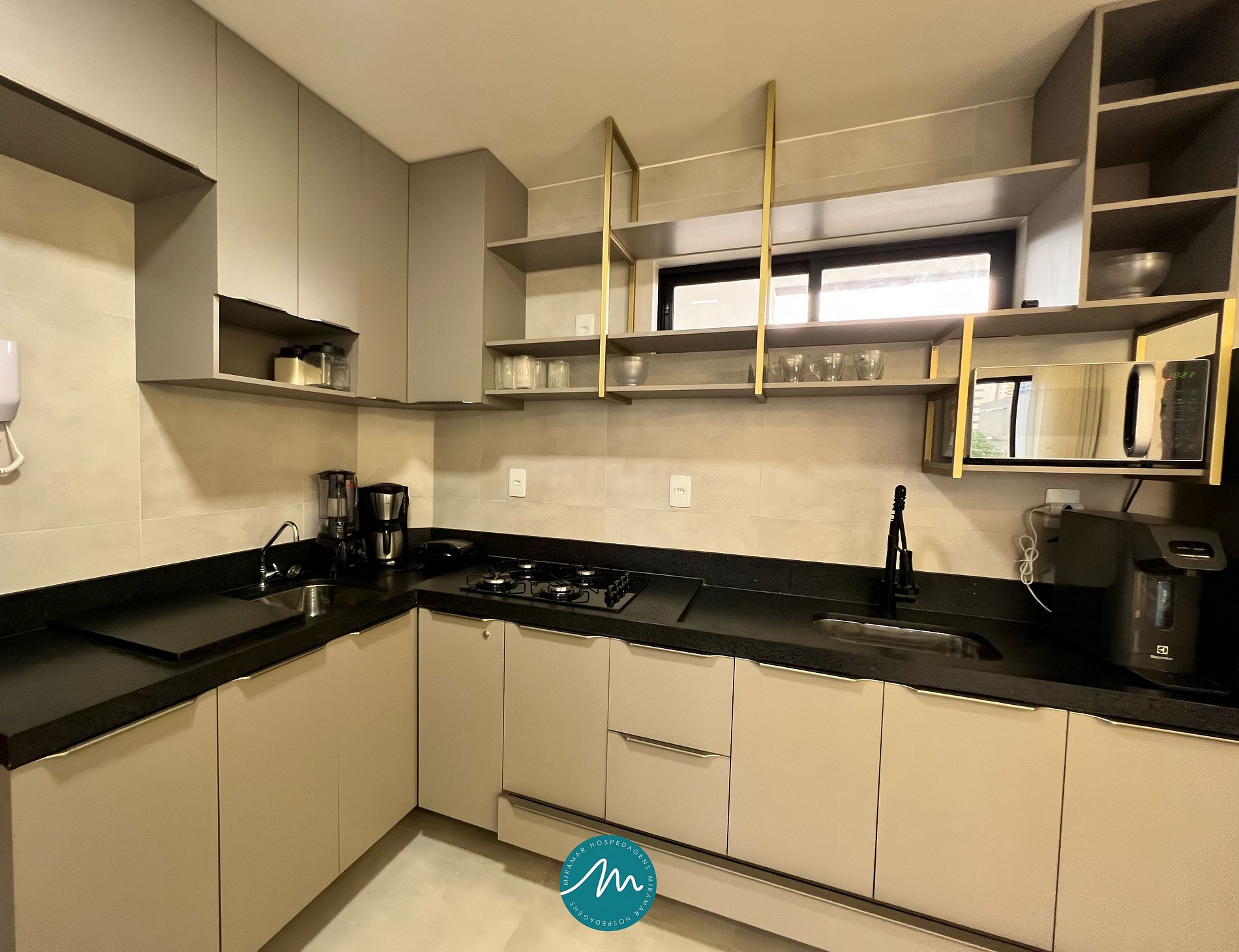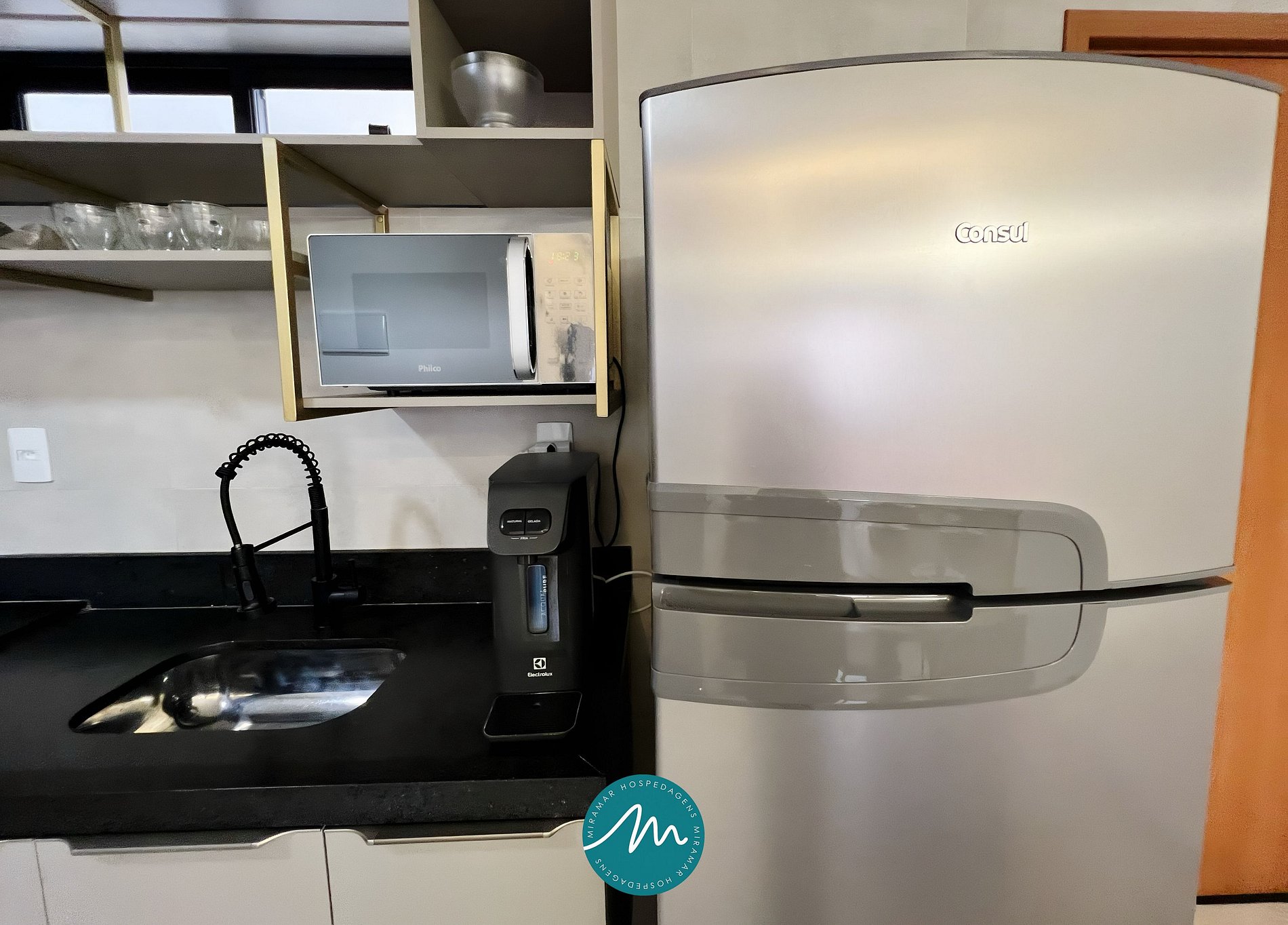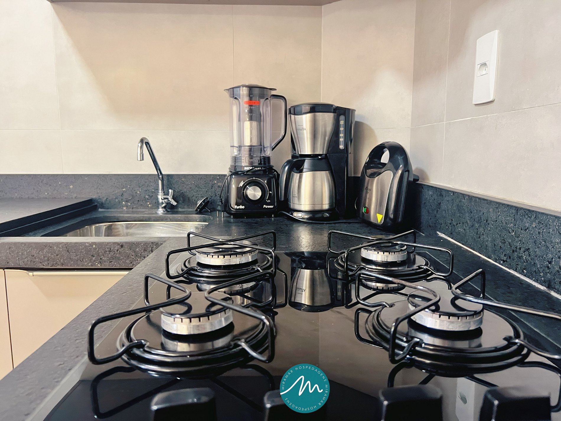 A cozinha compacta é completa — geladeira, fogão, micro-ondas, cafeteira, louças, talheres e utensílios essenciais — tudo pronto para quem gosta de preparar suas próprias refeições.