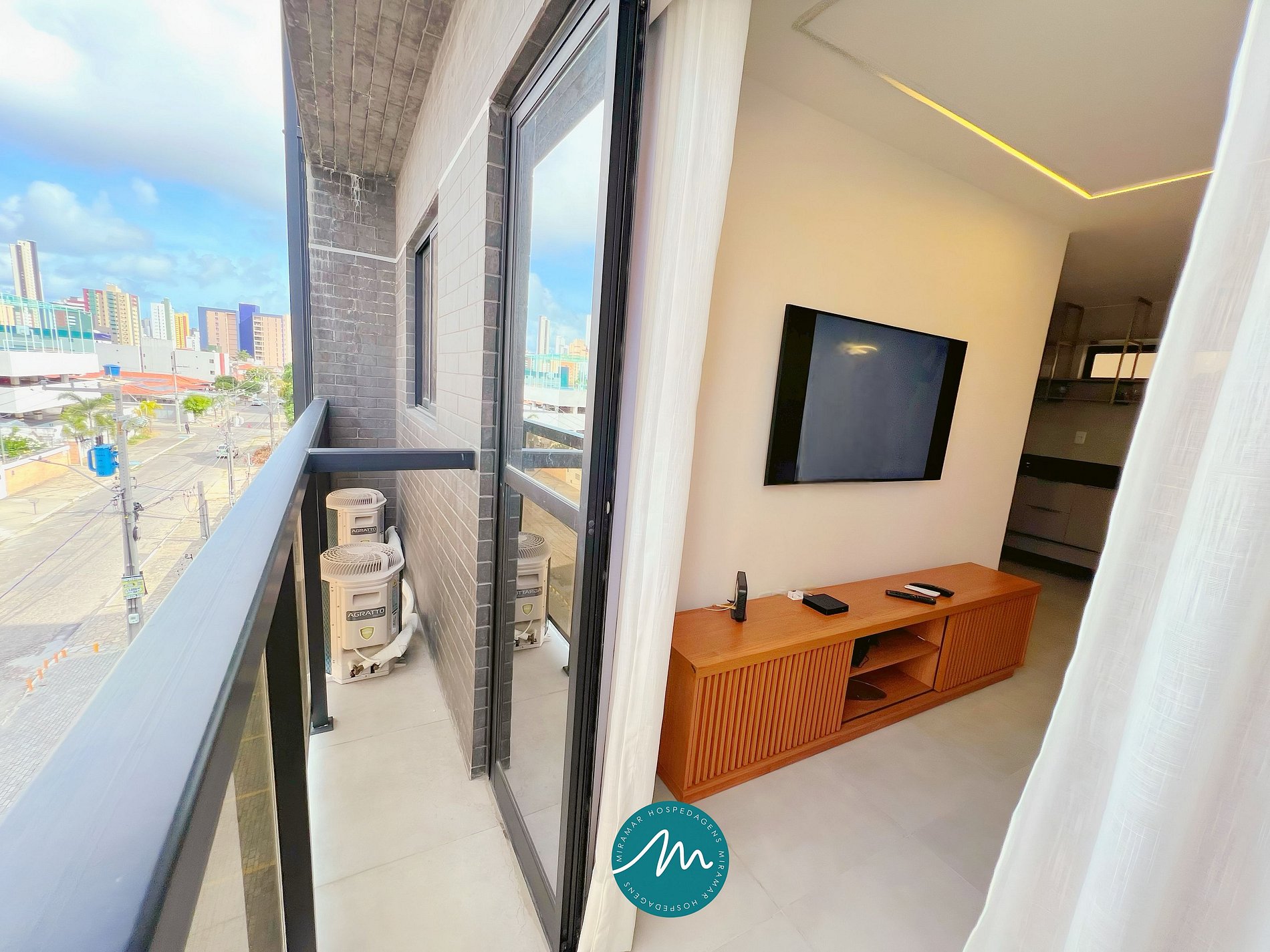 Apartamento completo e aconchegante com dois quartos, ambos com cama de casal. Totalmente climatizado, conta com ar-condicionado, Wi-Fi, sala de estar com mesa, cadeiras e sofá confortável. A cozinha compacta possui utensílios essenciais para o dia a dia, e a varanda oferece uma vista tranquila para a rua. Localizado em Manaíra, elevadores e uma agradável piscina no térreo. Não possui portaria física, precisa buscar Tag em outro endereço (passado no check-in).