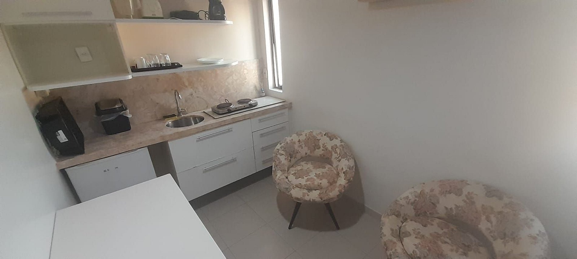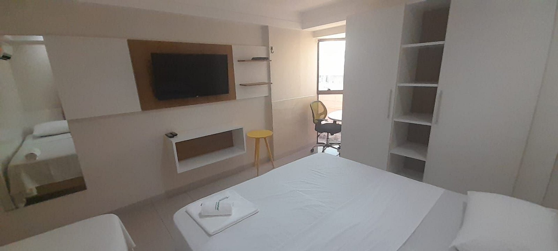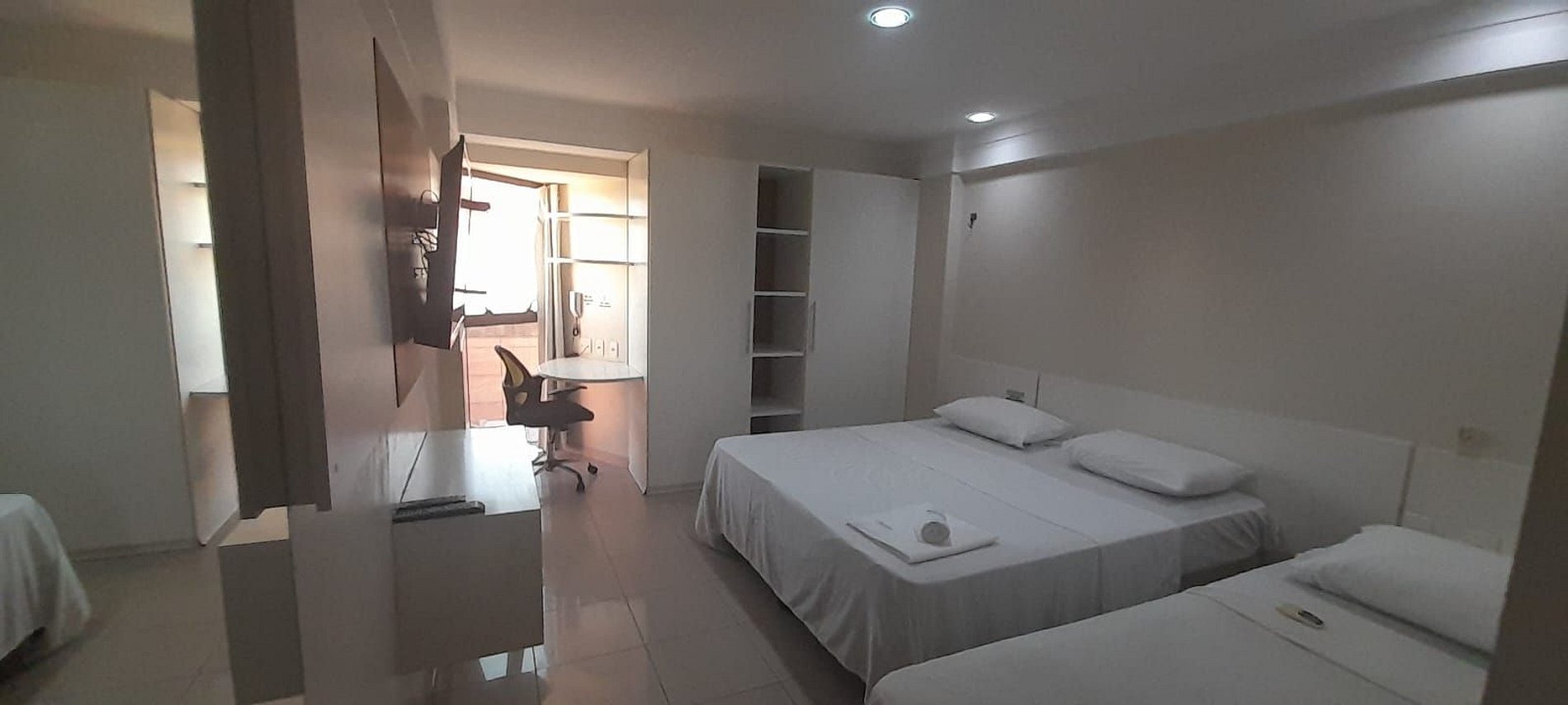 Flat de um quarto com três camas de solteiro, ventilador, cozinha compacta com utensílios básicos e domésticos, tv, eletrodomésticos, enxoval de cama e banho. O prédio possui recepção 24 horas, wi-fi e garagem rotativa.