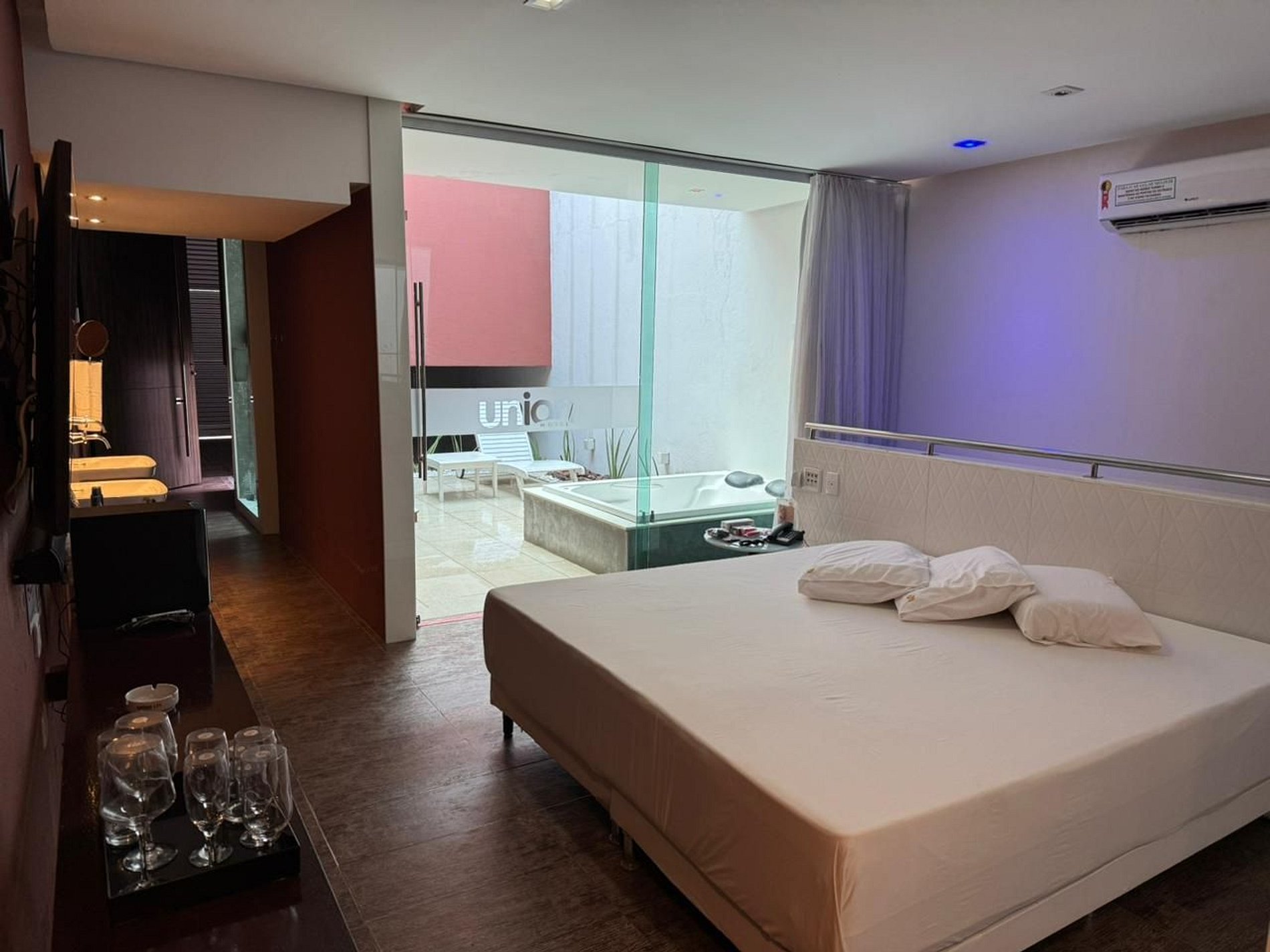 Suíte no Motel Premium Union: Um Super Café da Manhã para 2 INCLUSO, Hidro Aquecida Privada Com Vista pras Estrelas (banho de espuma grátis), Cozinha 24hs pratos assinados por chefs, Cama king, SmarTv Youtube Premium, Soundbar, Wi-Fi e ar-split. Fica no ponto turístico Praia do Jacaré onde há passeios de lancha. Pode entrar e sair a vontade como Hotel. Opcional: pacote romântico inesquecível com Lençóis vermelhos de cetim, pétalas, espumante, mesa posta etc. por mais 160,00 veja nas fotos
