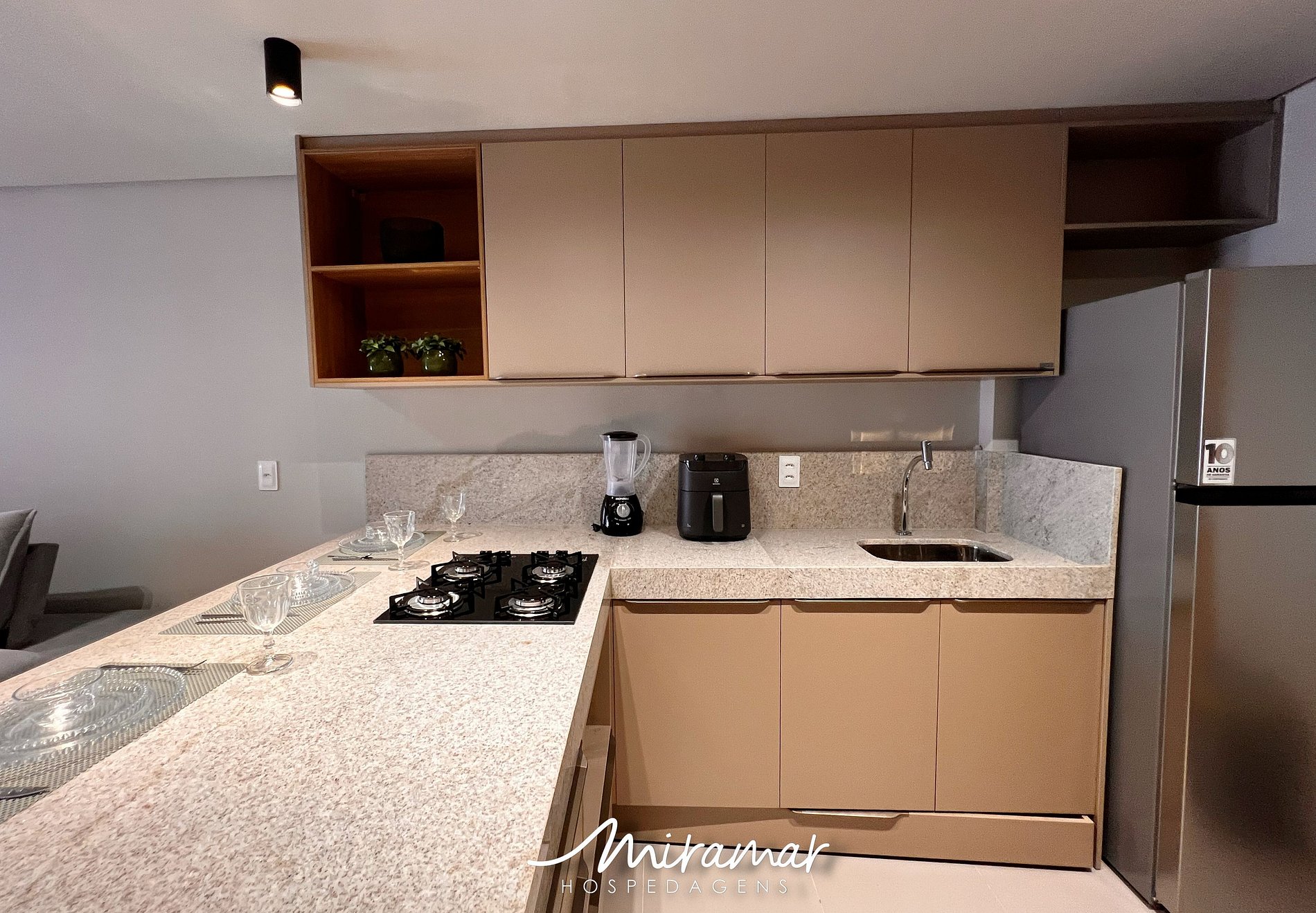 A cozinha completa está equipada com tudo o que você precisa para se sentir em casa: geladeira, fogão, sanduicheira, liquidificador e forno airfryer para preparar suas refeições. A mesa de jantar, entre a cozinha e a sala, é o lugar perfeito para compartilhar um café da manhã em família ou um jantar tranquilo.