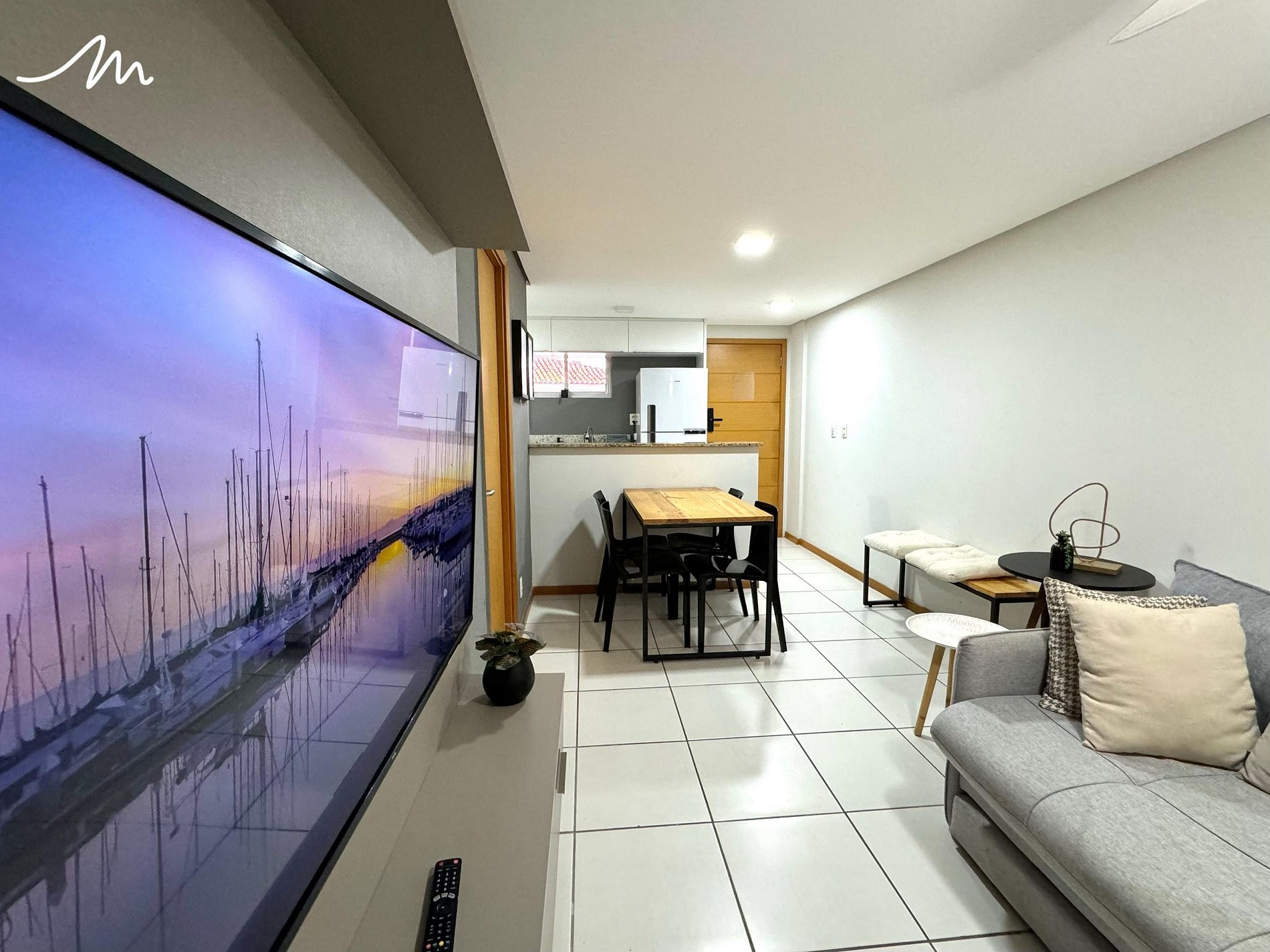 A sala de estar é acolhedora, com sofá-cama, TV, mesa de jantar e cadeiras, ideal para relaxar após um dia na praia. A varanda arejada, equipada com duas cadeiras confortáveis, é o local perfeito para aproveitar a brisa fresca.