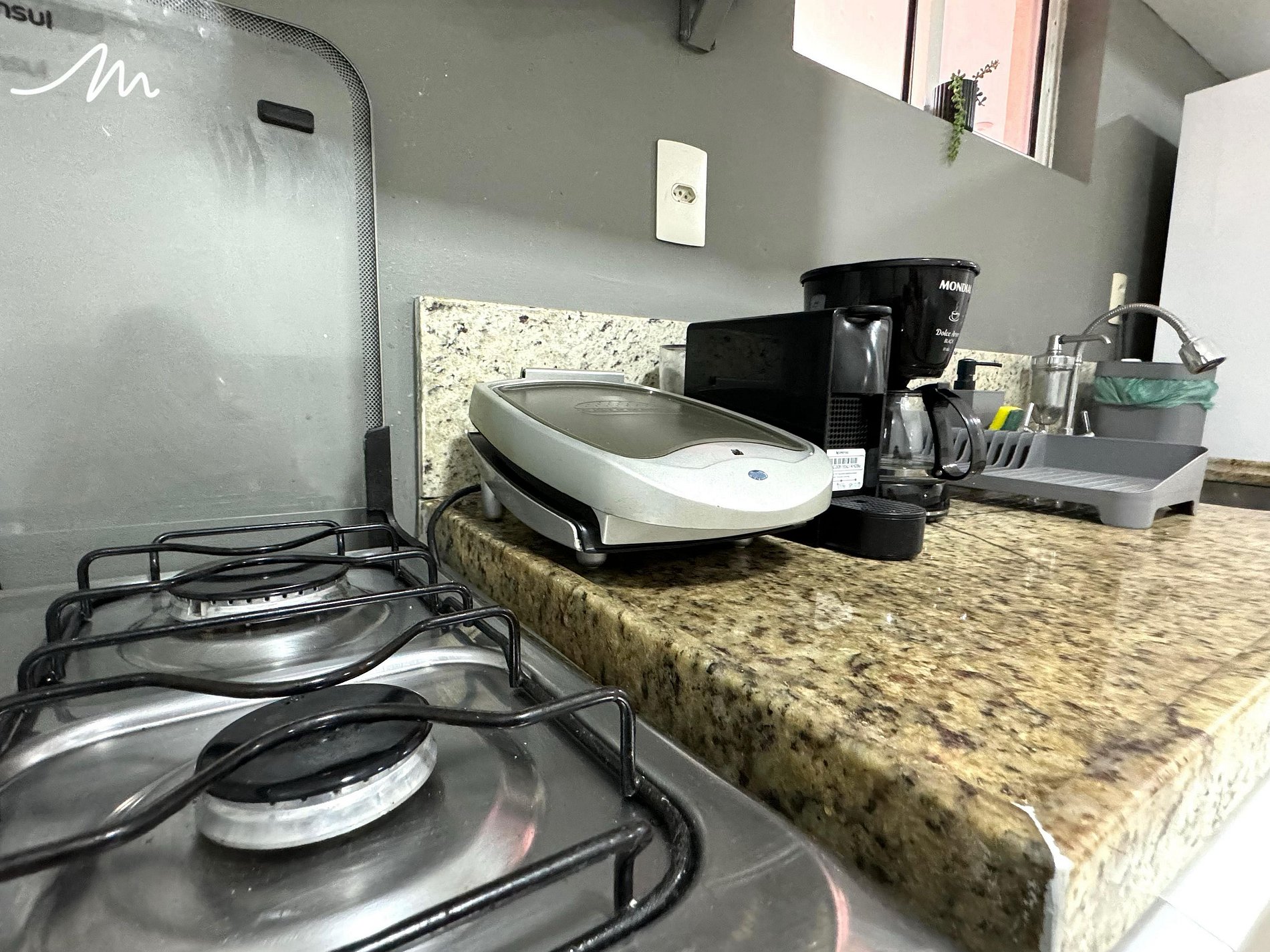 A cozinha compacta é totalmente equipada com utensílios essenciais, como geladeira, fogão, micro-ondas, sanduicheira, cafeteira, garantindo praticidade para quem deseja uma estadia independente e confortável.