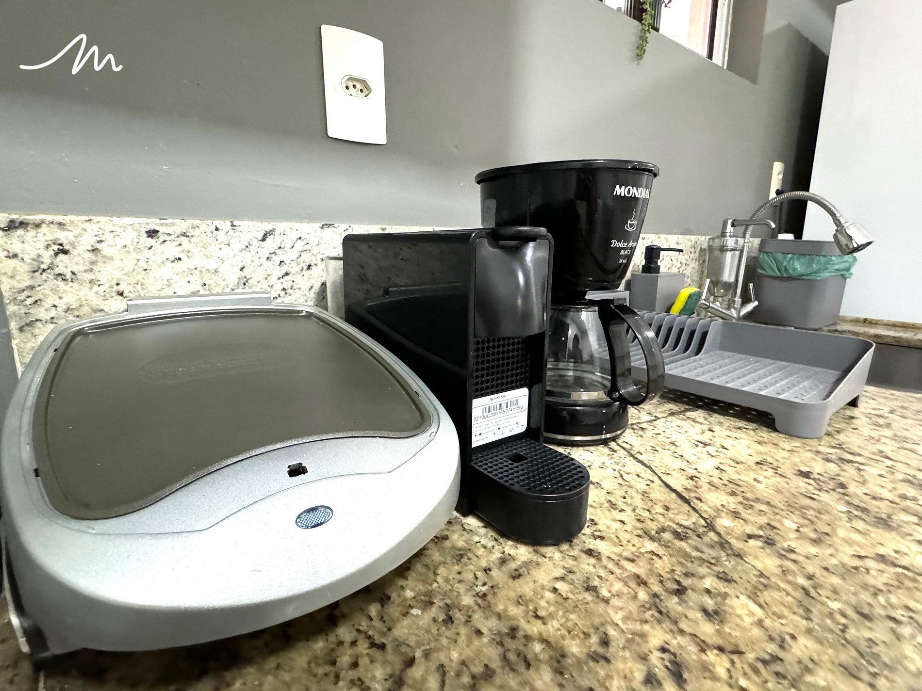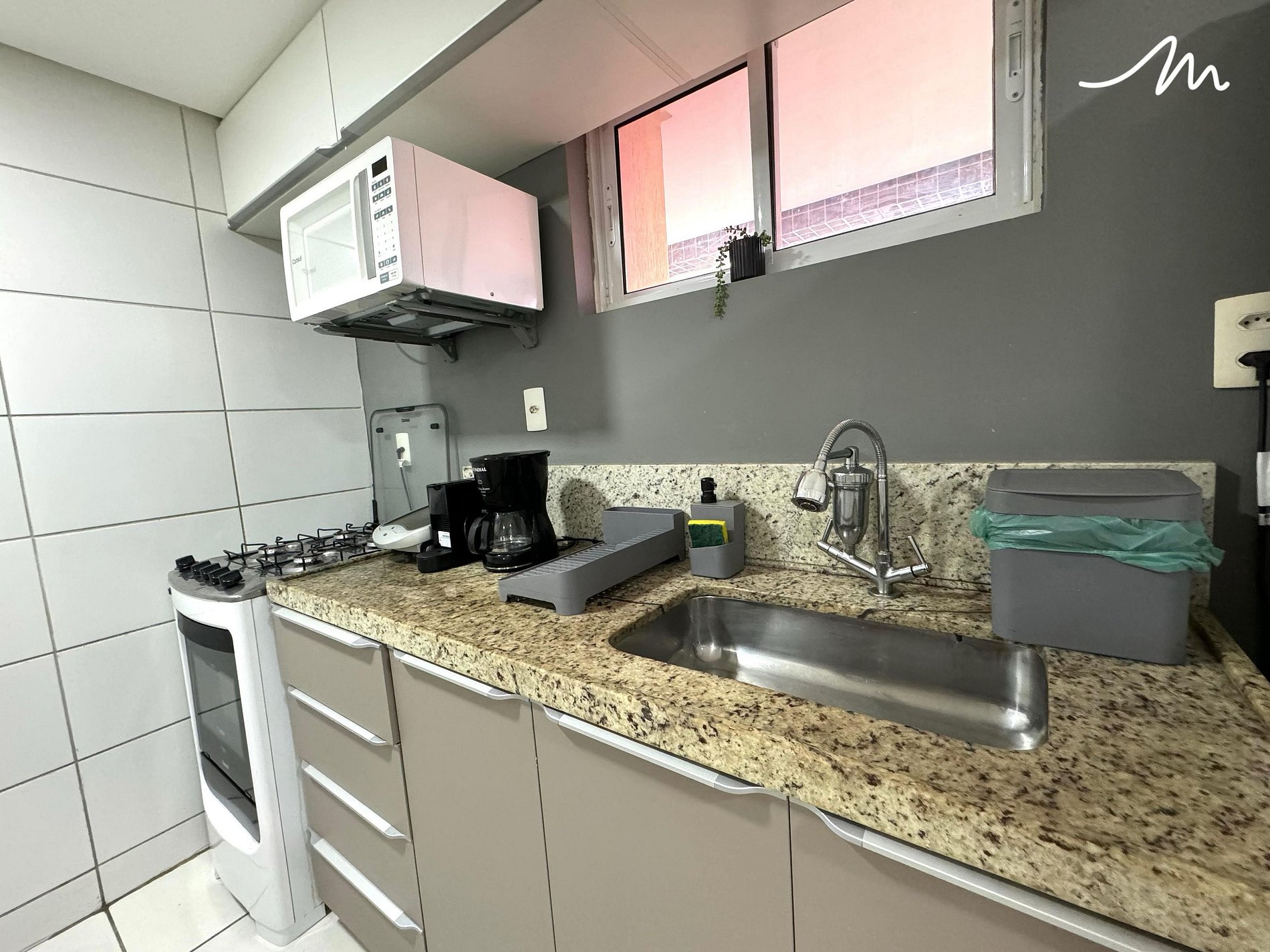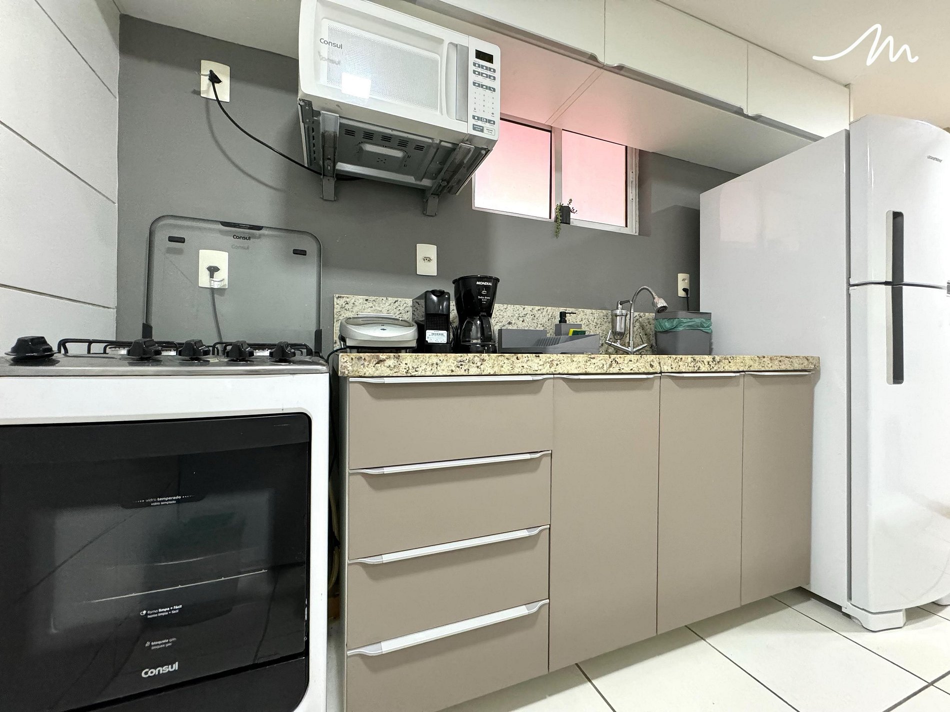 A cozinha compacta é totalmente equipada com utensílios essenciais, como geladeira, fogão, micro-ondas, sanduicheira, cafeteira, garantindo praticidade para quem deseja uma estadia independente e confortável.