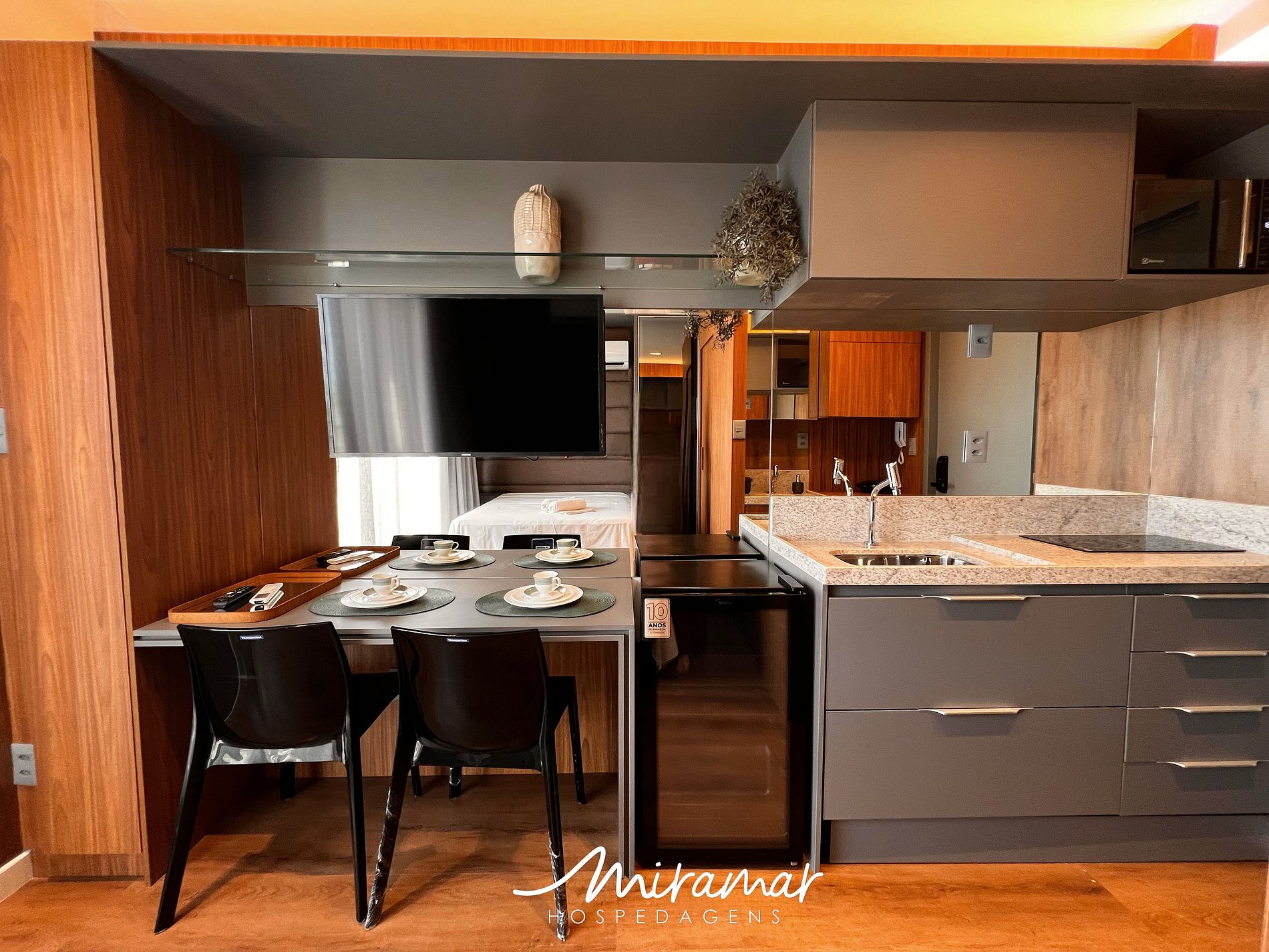 O ambiente é funcional e bem planejado: você terá uma TV, além de uma bancada com duas cadeiras, perfeita tanto para refeições quanto para trabalhar no notebook com praticidade.