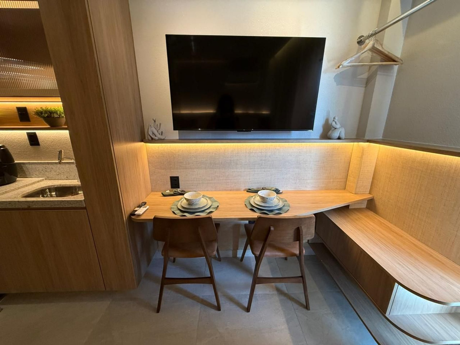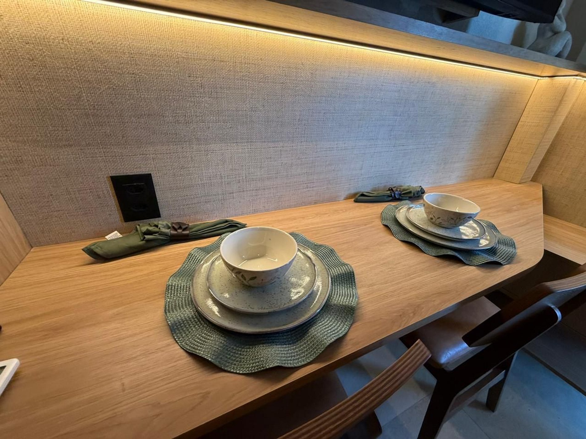 O ambiente é funcional e bem planejado: você terá uma TV, além de uma bancada com duas cadeiras, perfeita tanto para refeições quanto para trabalhar no notebook com praticidade.