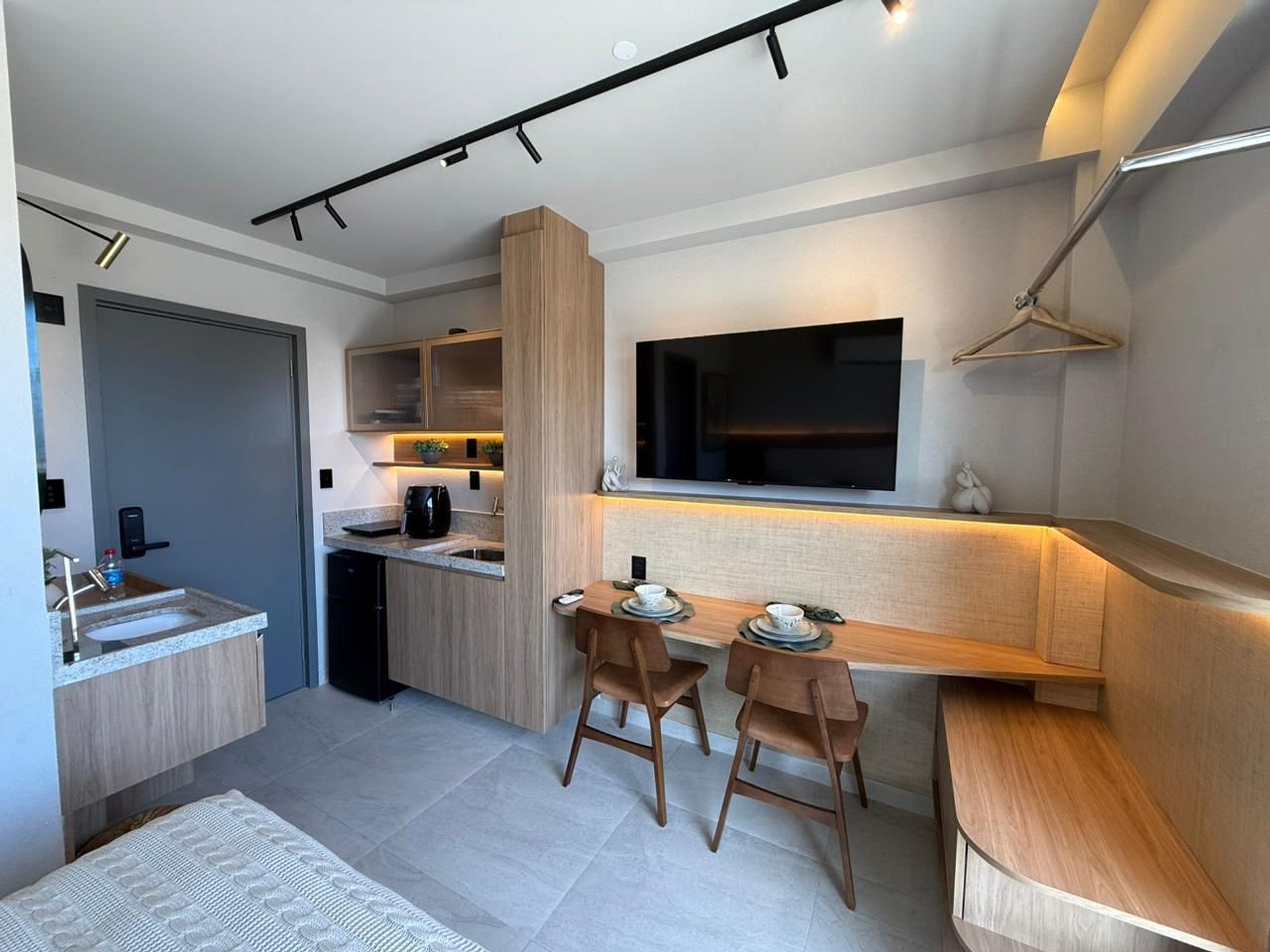 Venha se hospedar neste incrível flat no edifício Garden Haus. A unidade acomoda até 2 pessoas, com cama de casal. Climatizado com ar-condicionado, o ambiente oferece conforto e uma atmosfera agradável. Para sua praticidade, há uma arara para roupas e TV para seu entretenimento. A cozinha é compacta, mas equipada com os itens essenciais para preparar refeições rápidas. Conforto, praticidade e uma localização privilegiada te esperam!