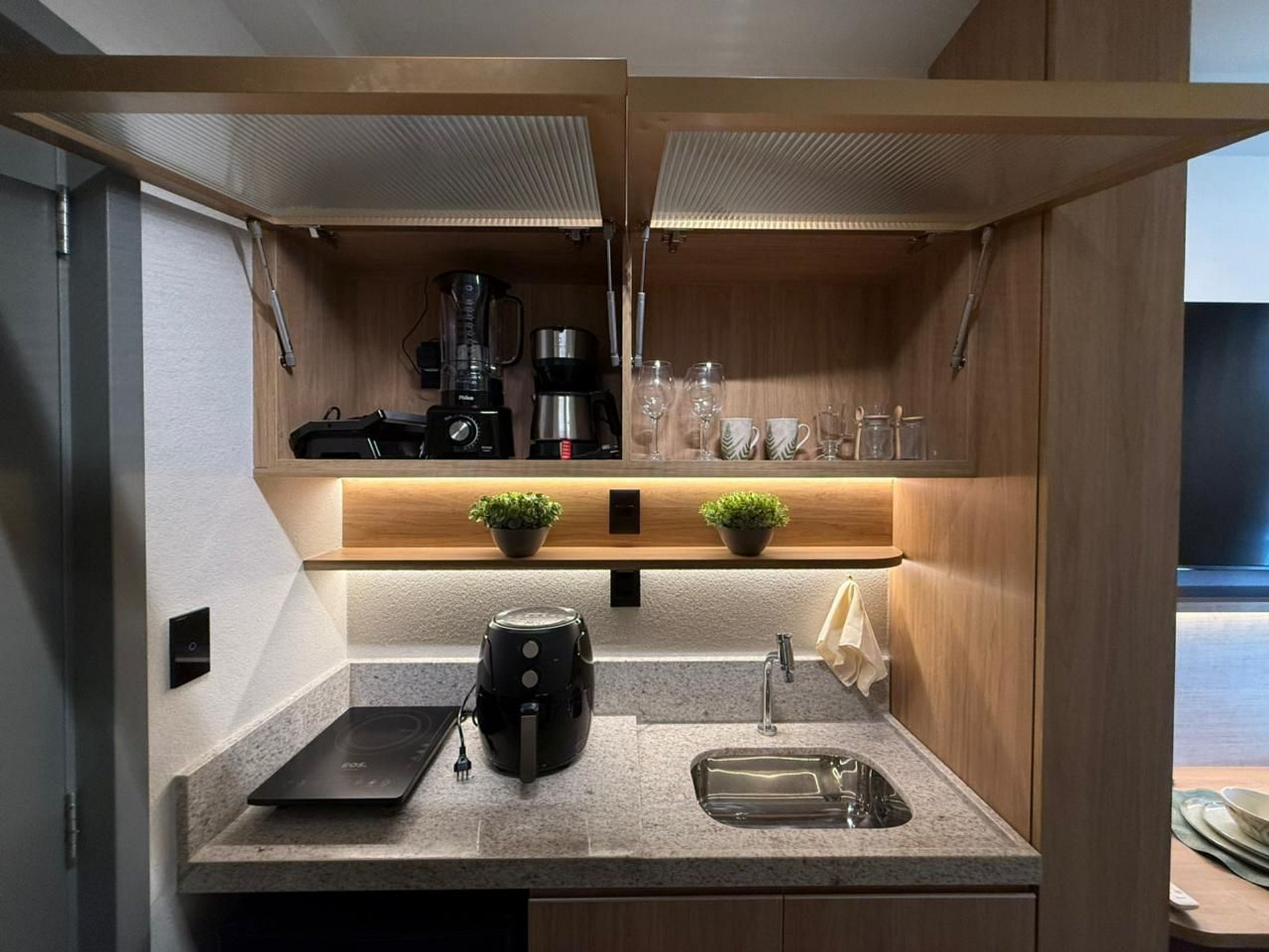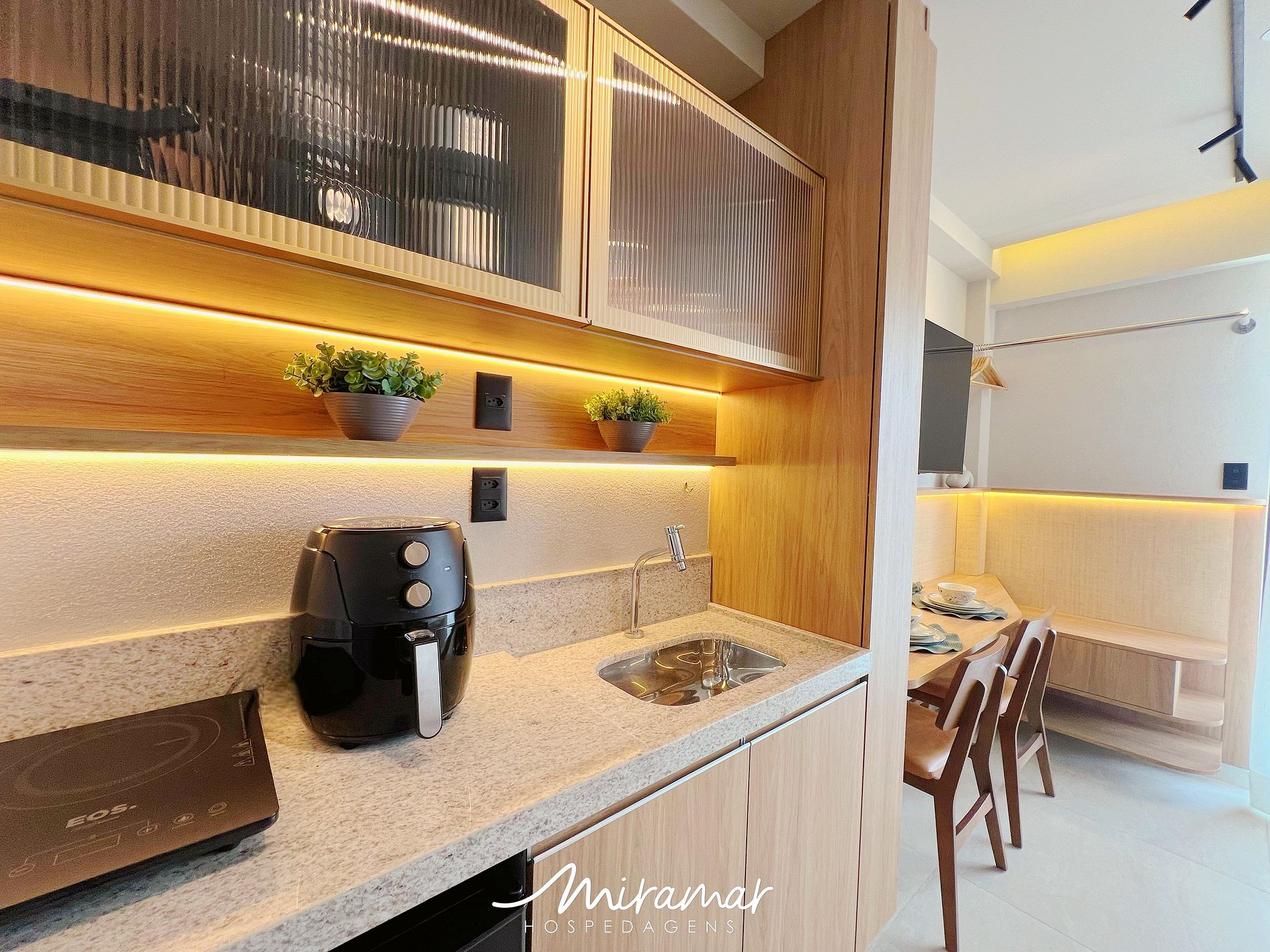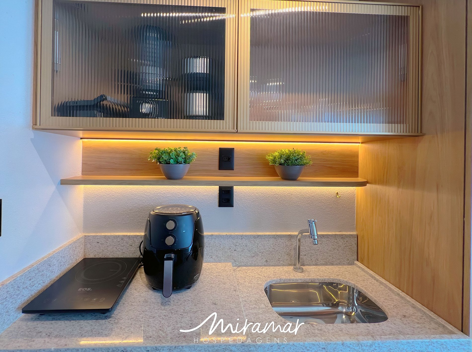 Na área destinada à cozinha, você encontrará tudo o que precisa para preparar lanches e refeições rápidas: armário, frigobar, sanduicheira, micro-ondas, liquidificador, cafeteira, louças e talheres e uma air fryer. Um kit completo para quem gosta de autonomia durante a estadia.