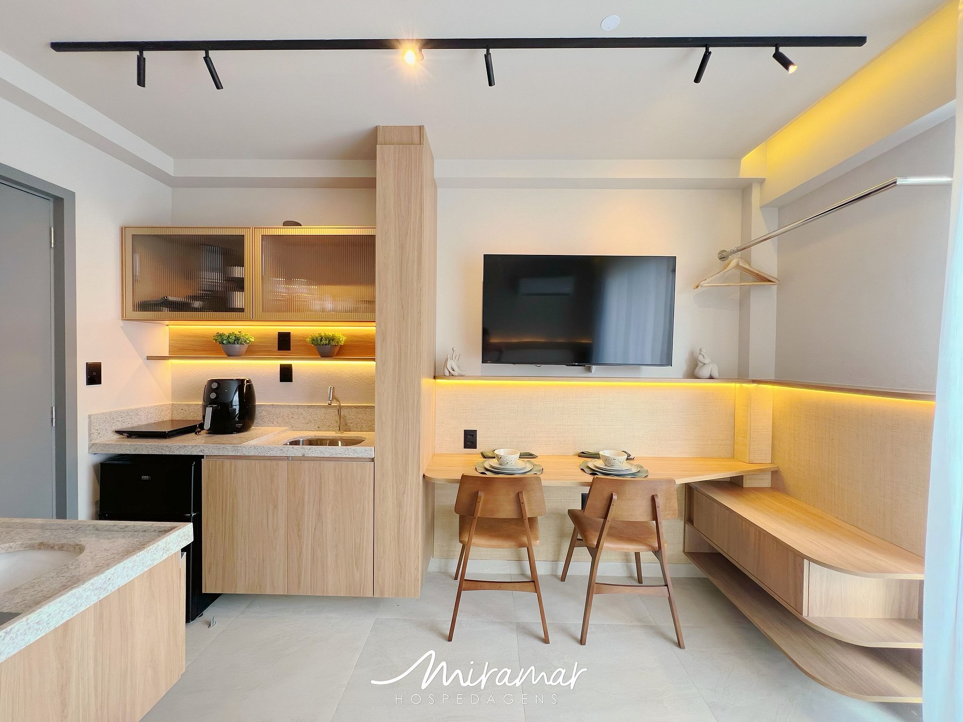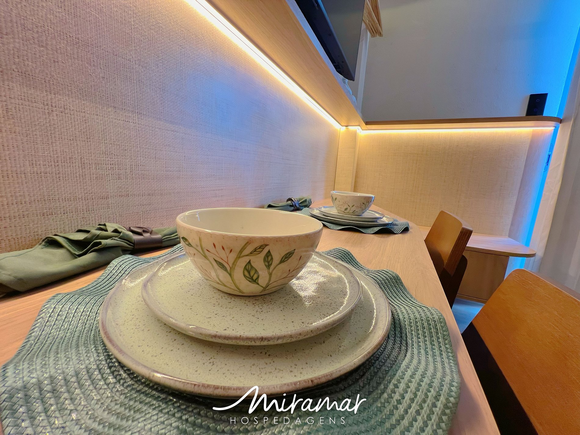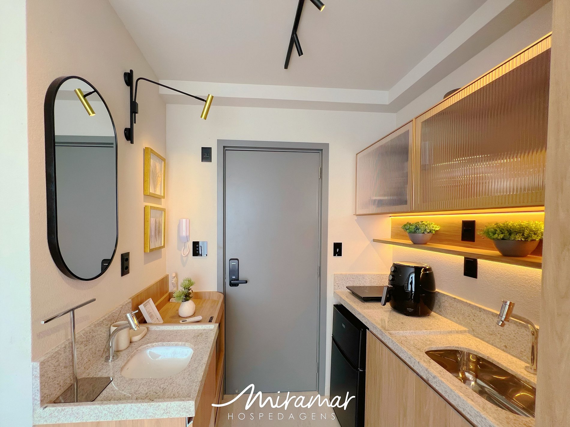 Na área destinada à cozinha, você encontrará tudo o que precisa para preparar lanches e refeições rápidas: armário, frigobar, sanduicheira, micro-ondas, liquidificador, cafeteira, louças e talheres e uma air fryer. Um kit completo para quem gosta de autonomia durante a estadia.