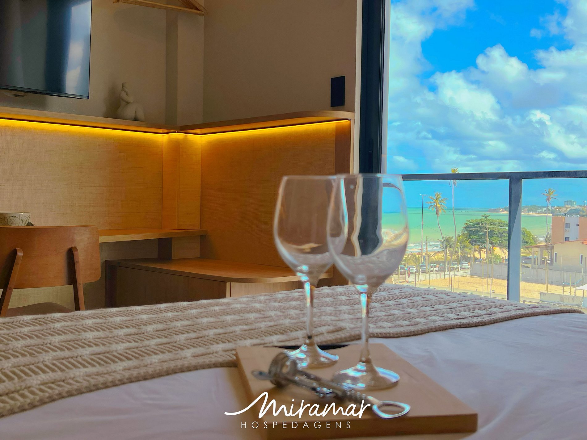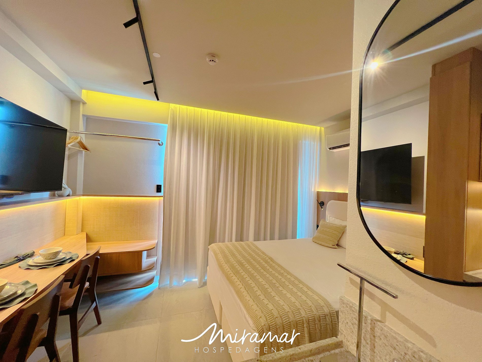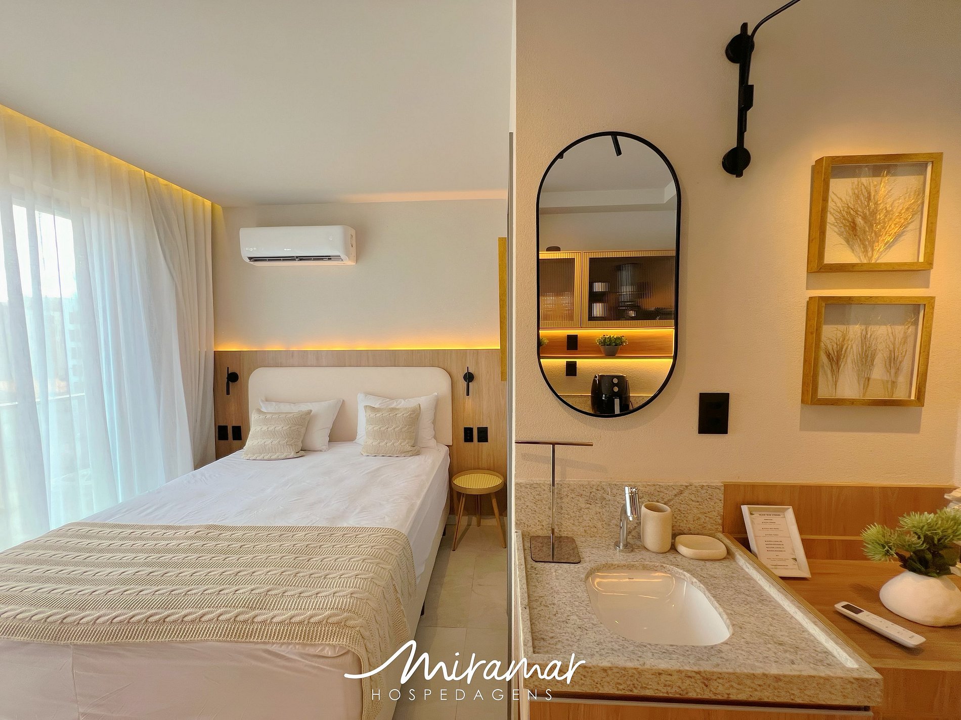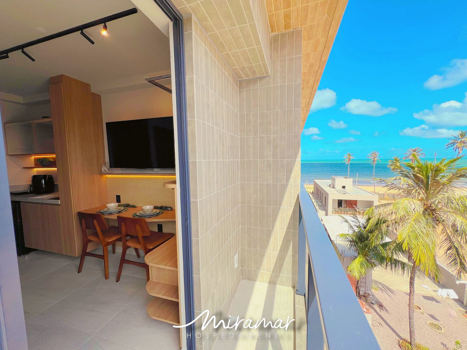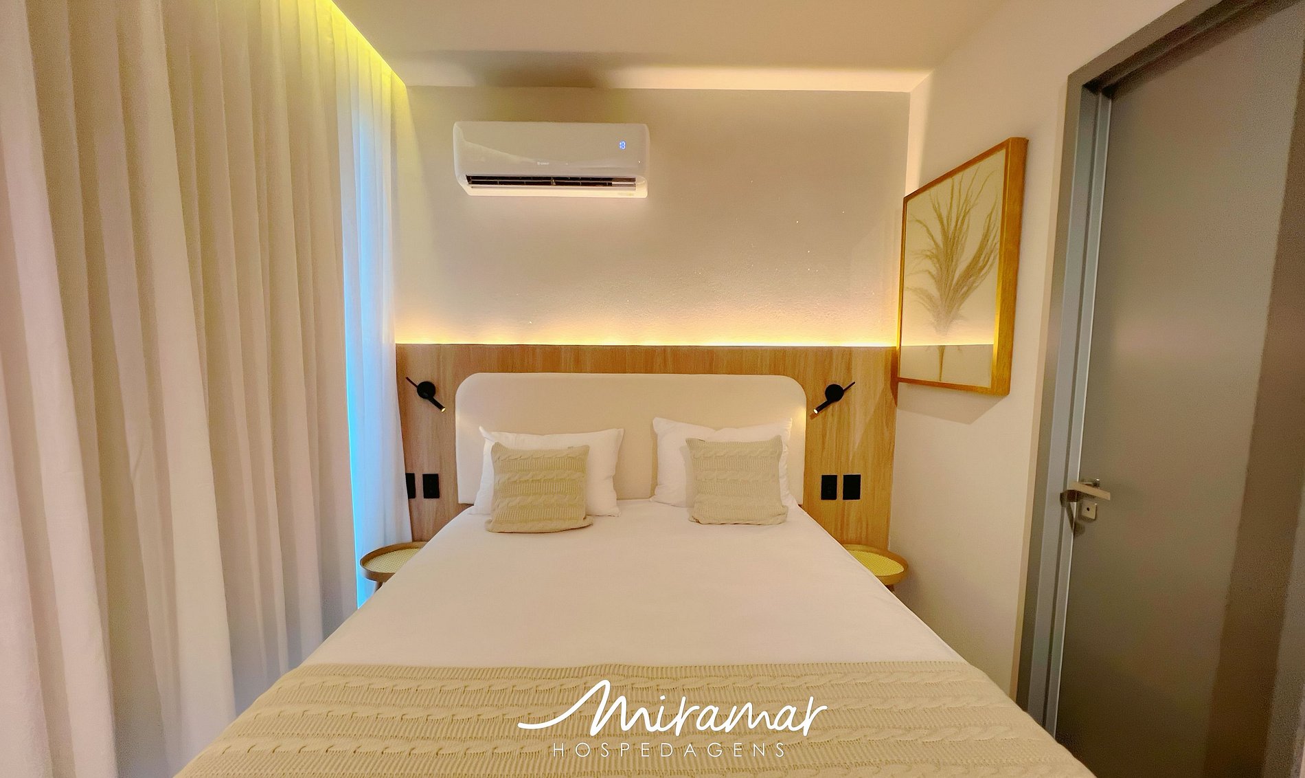 Pensado para acomodar até 2 hóspedes, o flat oferece uma cama queen para um casal, confortável, ar-condicionado para garantir noites fresquinhas e uma varanda com vista lateral para o mar, ideal para relaxar e apreciar a brisa oceânica.