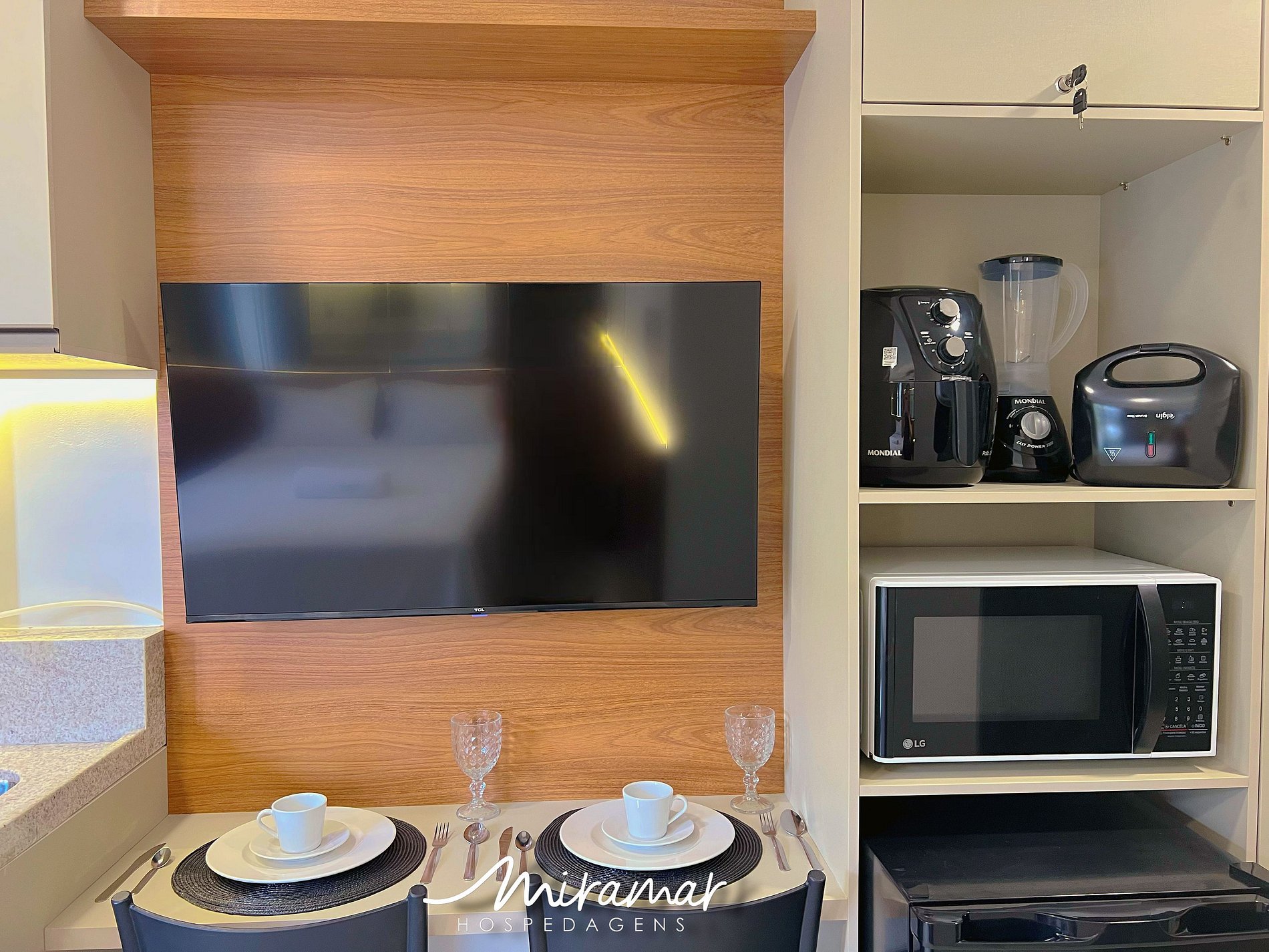 A cozinha compacta e bem equipada permite preparar refeições rápidas com praticidade, contando com sanduicheira, frigobar, cafeteira, microondas, liquidificador, utensílios essenciais, além de um filtro de água.