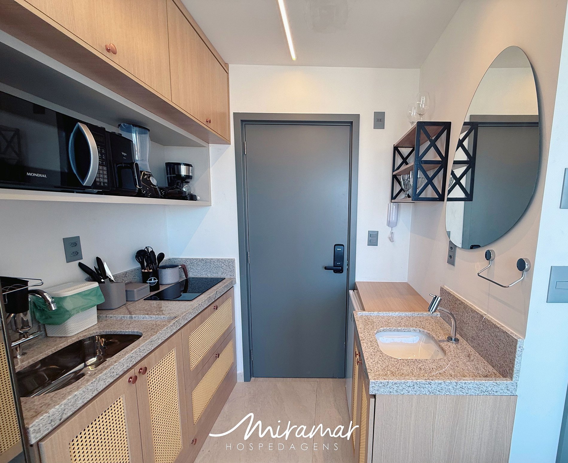 Na área destinada à cozinha, você encontrará tudo o que precisa para preparar lanches e refeições rápidas: armário, frigobar, sanduicheira, micro-ondas, liquidificador, cafeteira, louças e talheres. Um kit completo para quem gosta de autonomia durante a estadia.