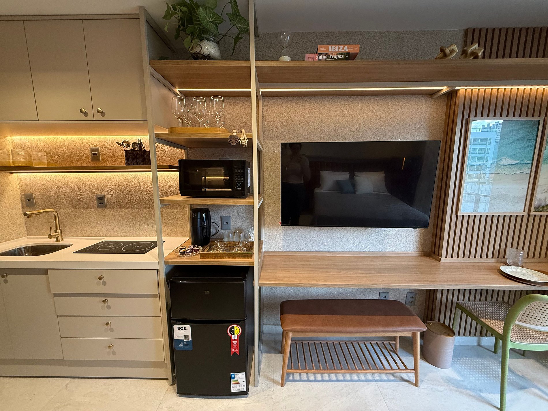 A cozinha compacta e bem equipada garante autonomia no dia a dia, com frigobar, micro-ondas, sanduicheira, liquidificador, cafeteira, air fryer, além de armários, louças e talheres. Perfeita para preparar lanches, refeições leves ou um café da manhã especial em família.
