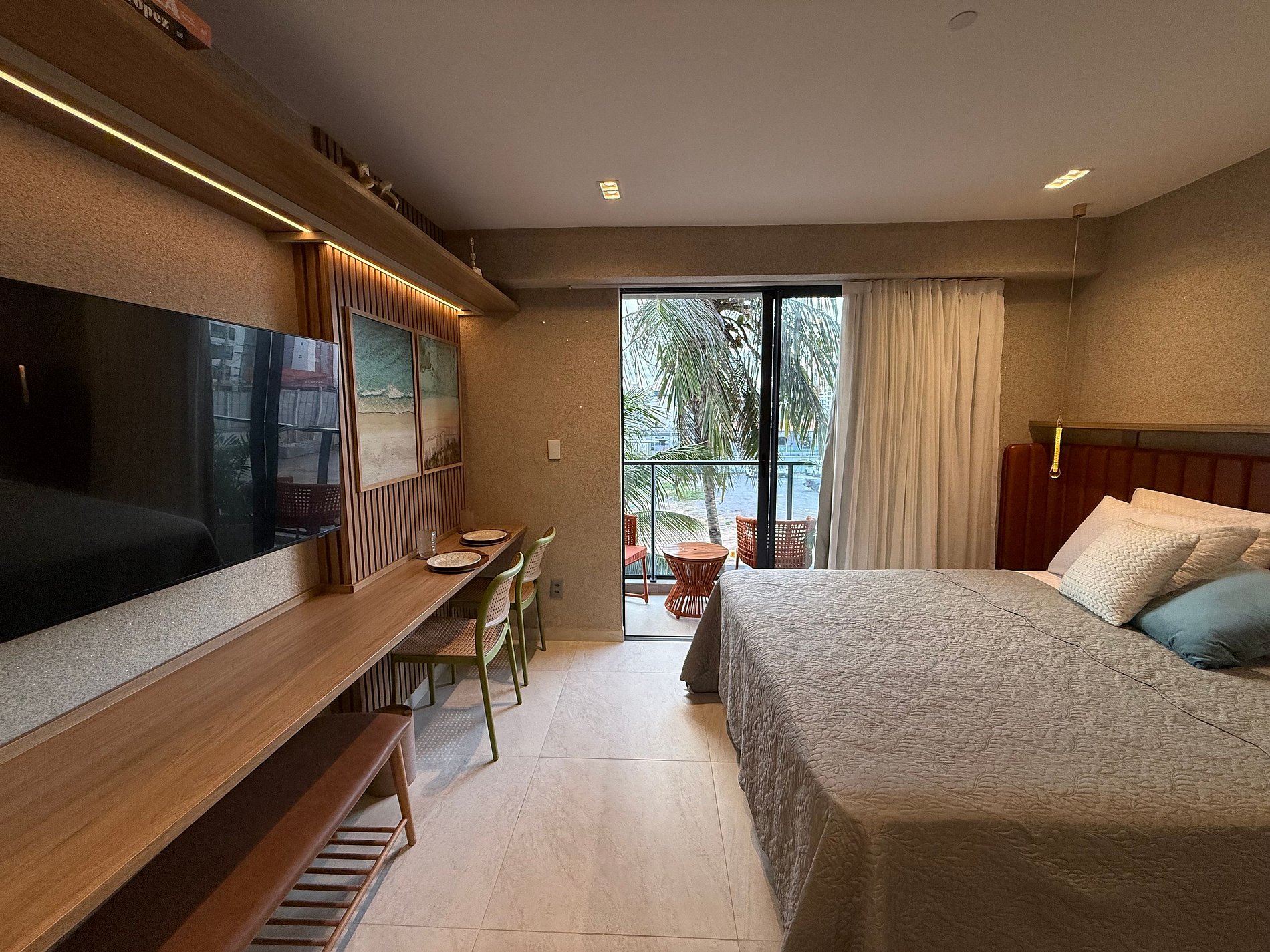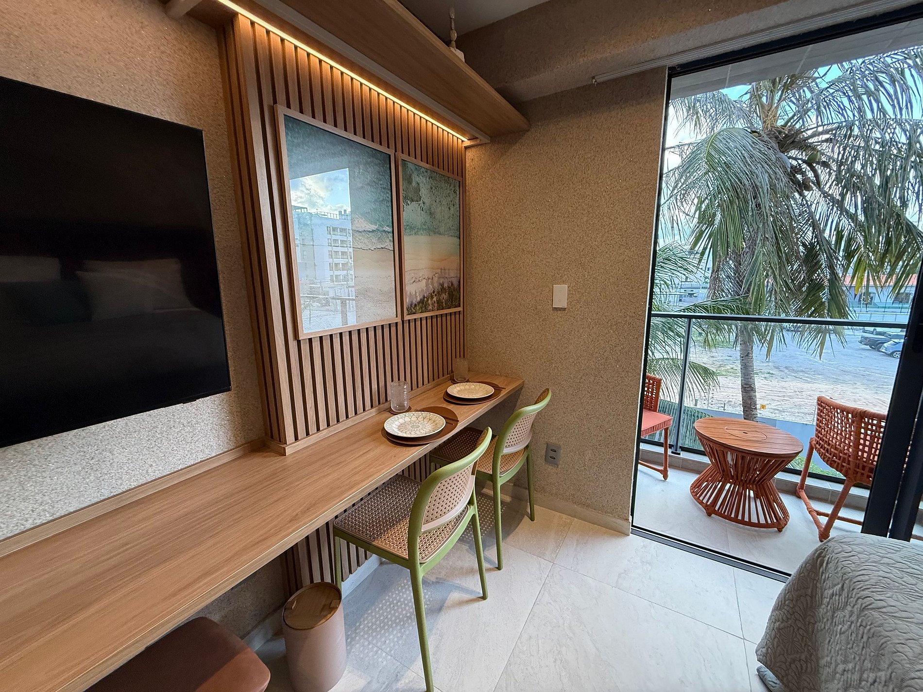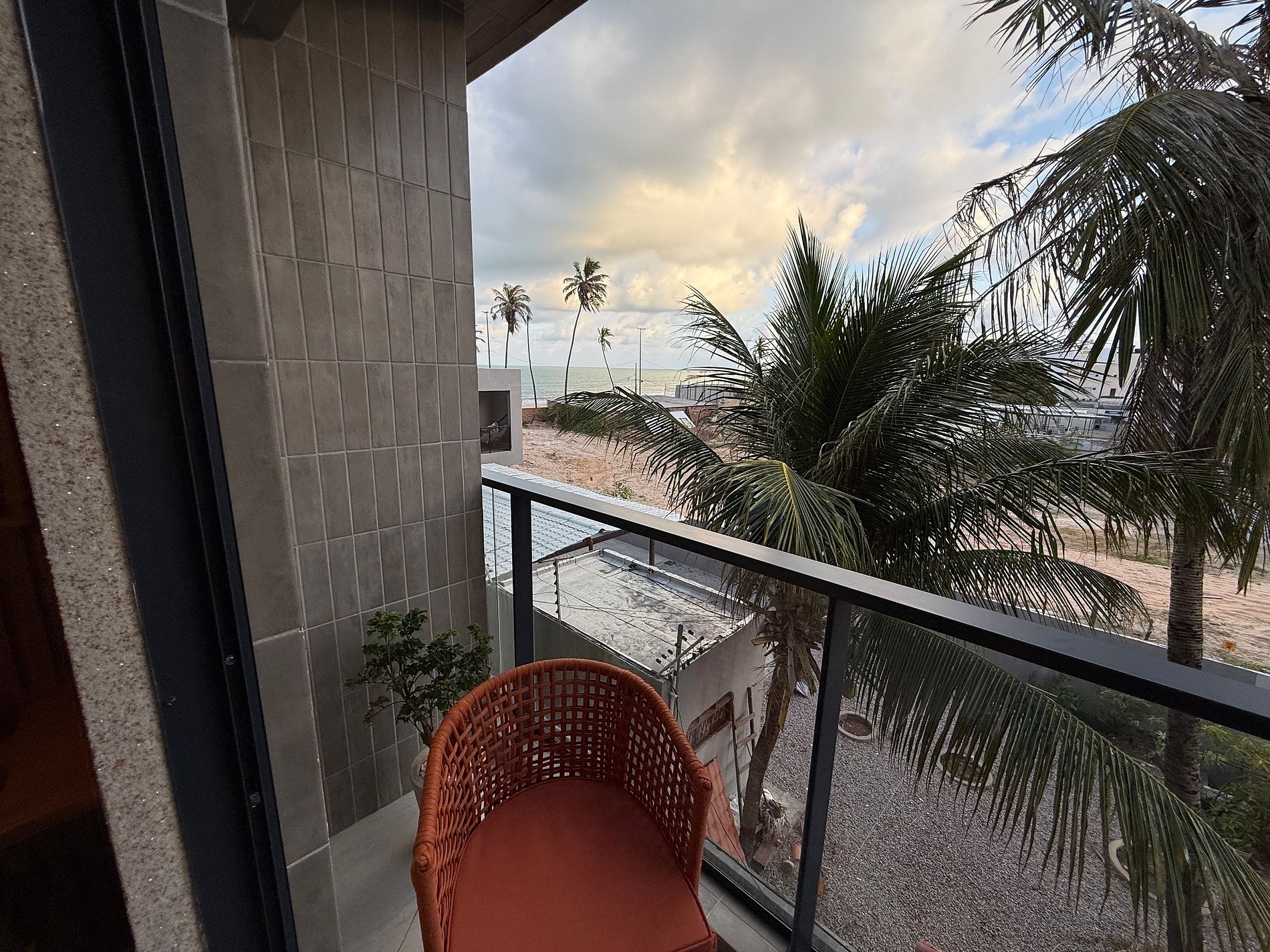 Na varanda, há mesa e cadeiras, perfeitas para aproveitar a vista, sentir a brisa oceânica e desfrutar de um drink ao entardecer ou uma taça de vinho em um clima leve e acolhedor.