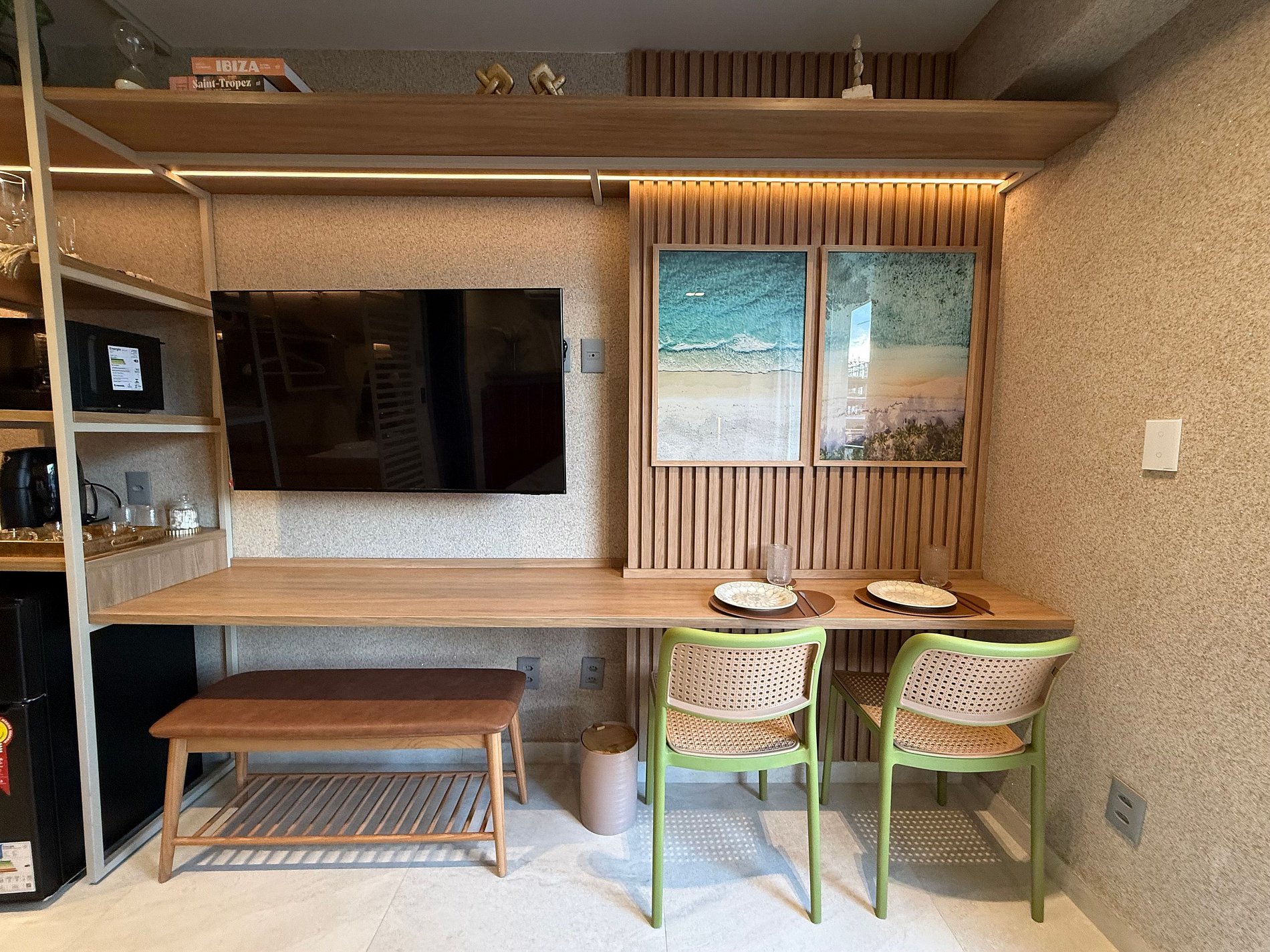 O espaço interno foi planejado para oferecer conforto e funcionalidade: você encontrará TV para momentos de descanso e uma bancada com duas cadeiras, ideal para refeições, cafés tranquilos ou para quem precisa trabalhar no notebook durante a estadia.
