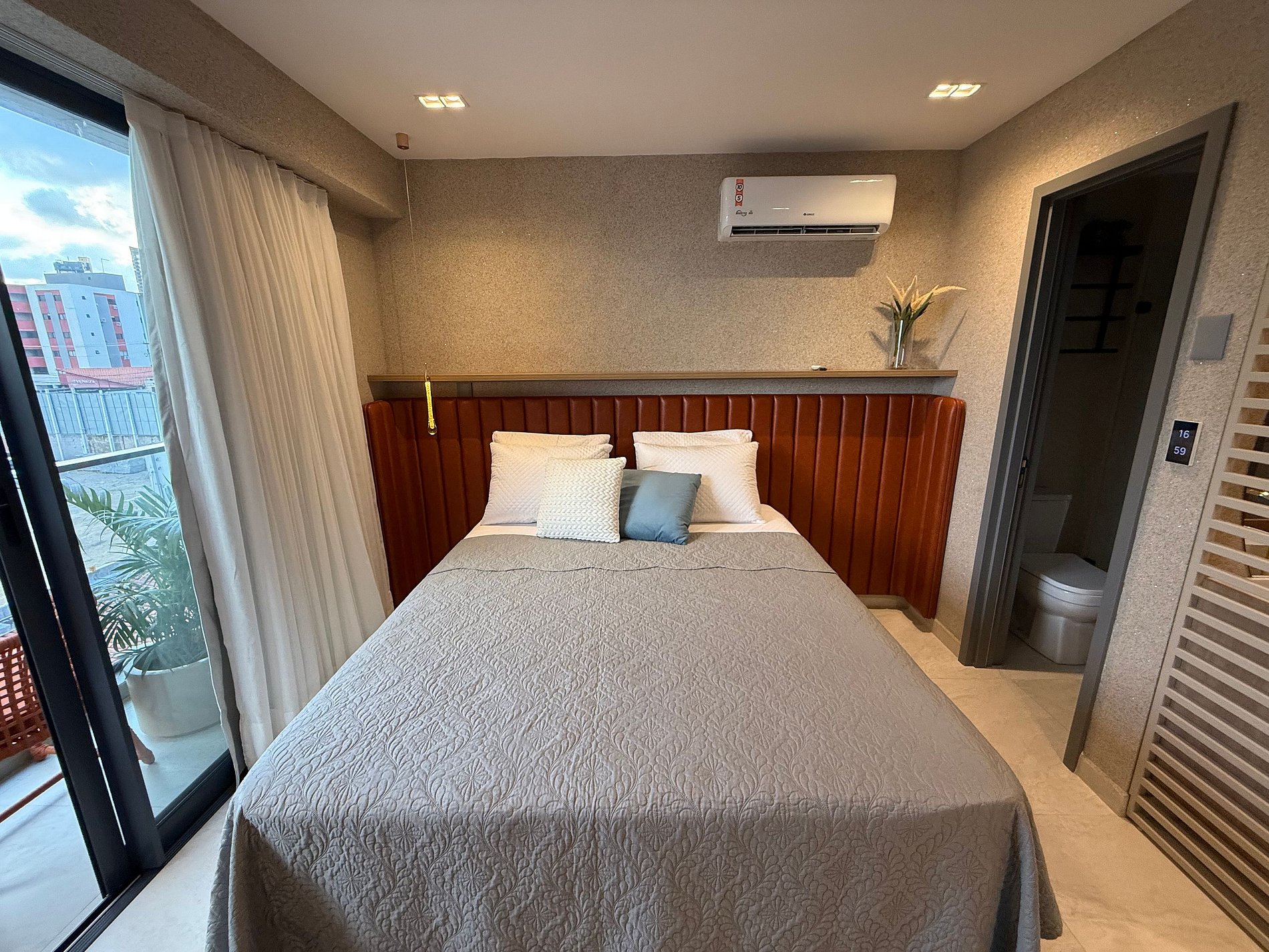 O flat acomoda confortavelmente até 4 hóspedes, com uma cama de casal aconchegante e duas camas de solteiro auxiliares, proporcionando descanso e bem-estar para todos. O ambiente é climatizado com ar-condicionado, ideal para relaxar após um dia de praia, e conta com uma agradável varanda com vista lateral para o mar.