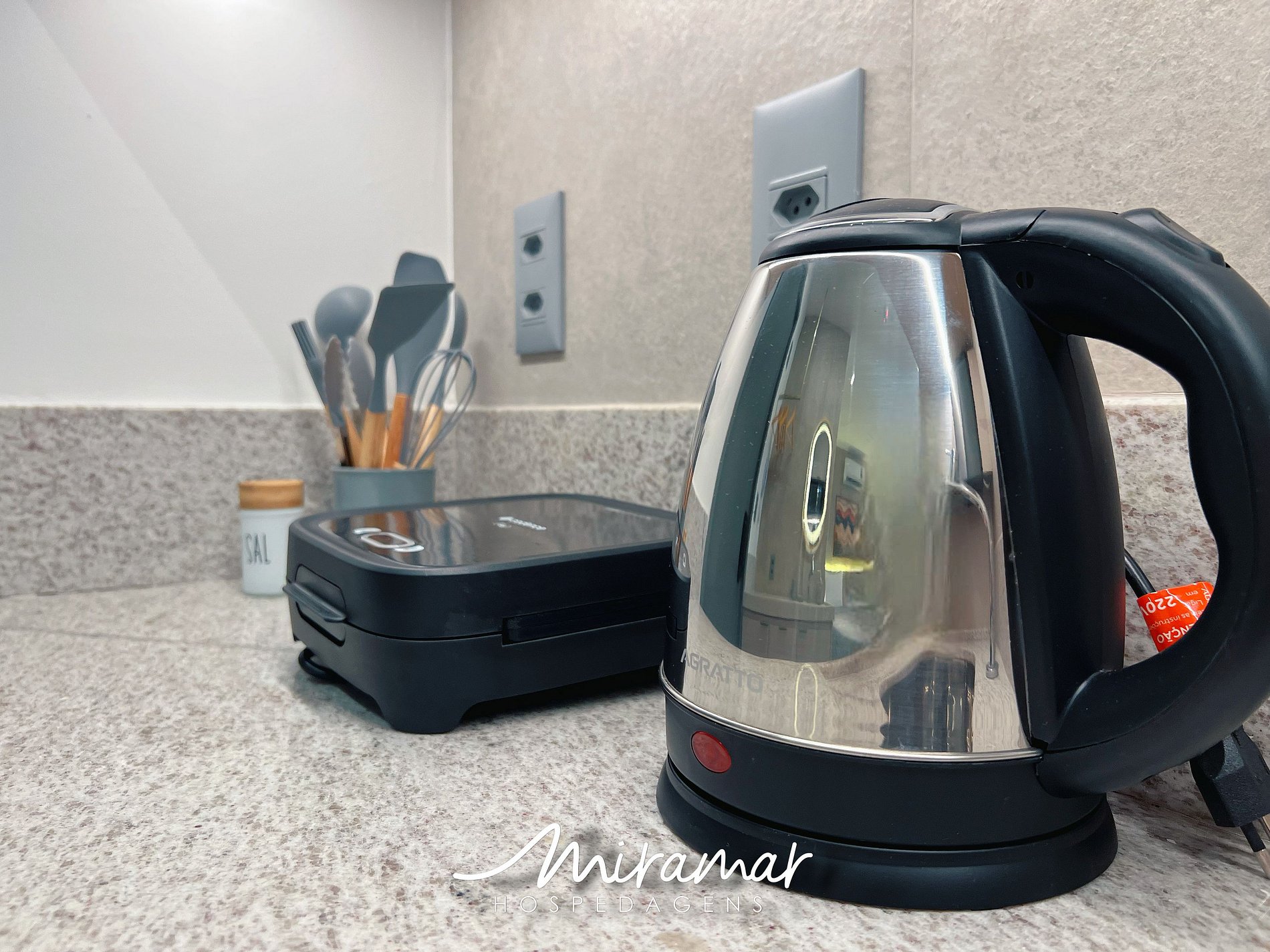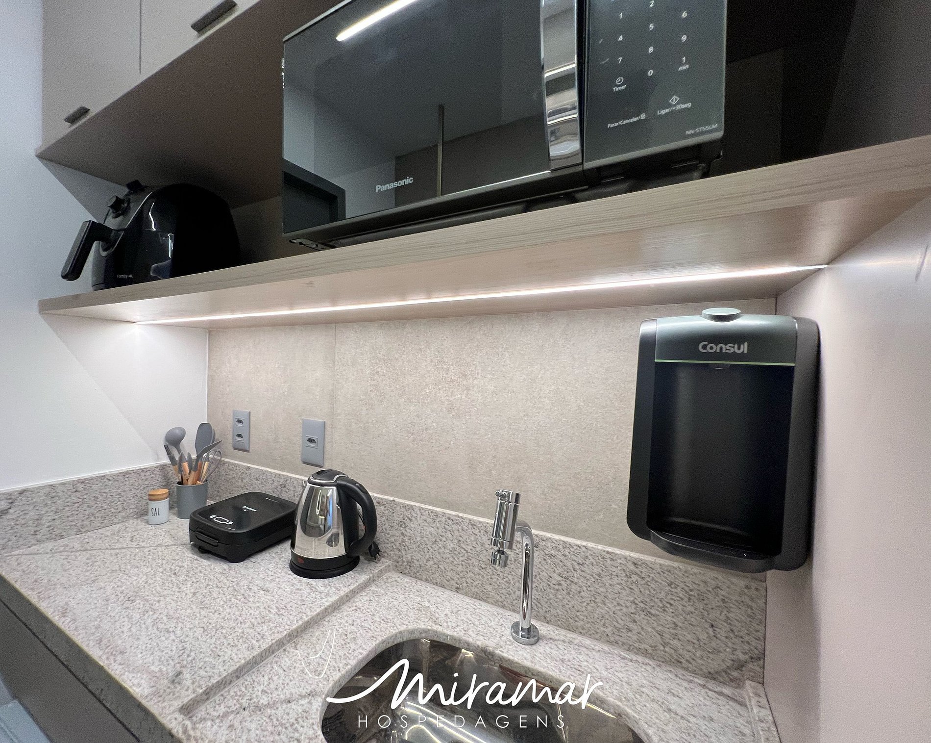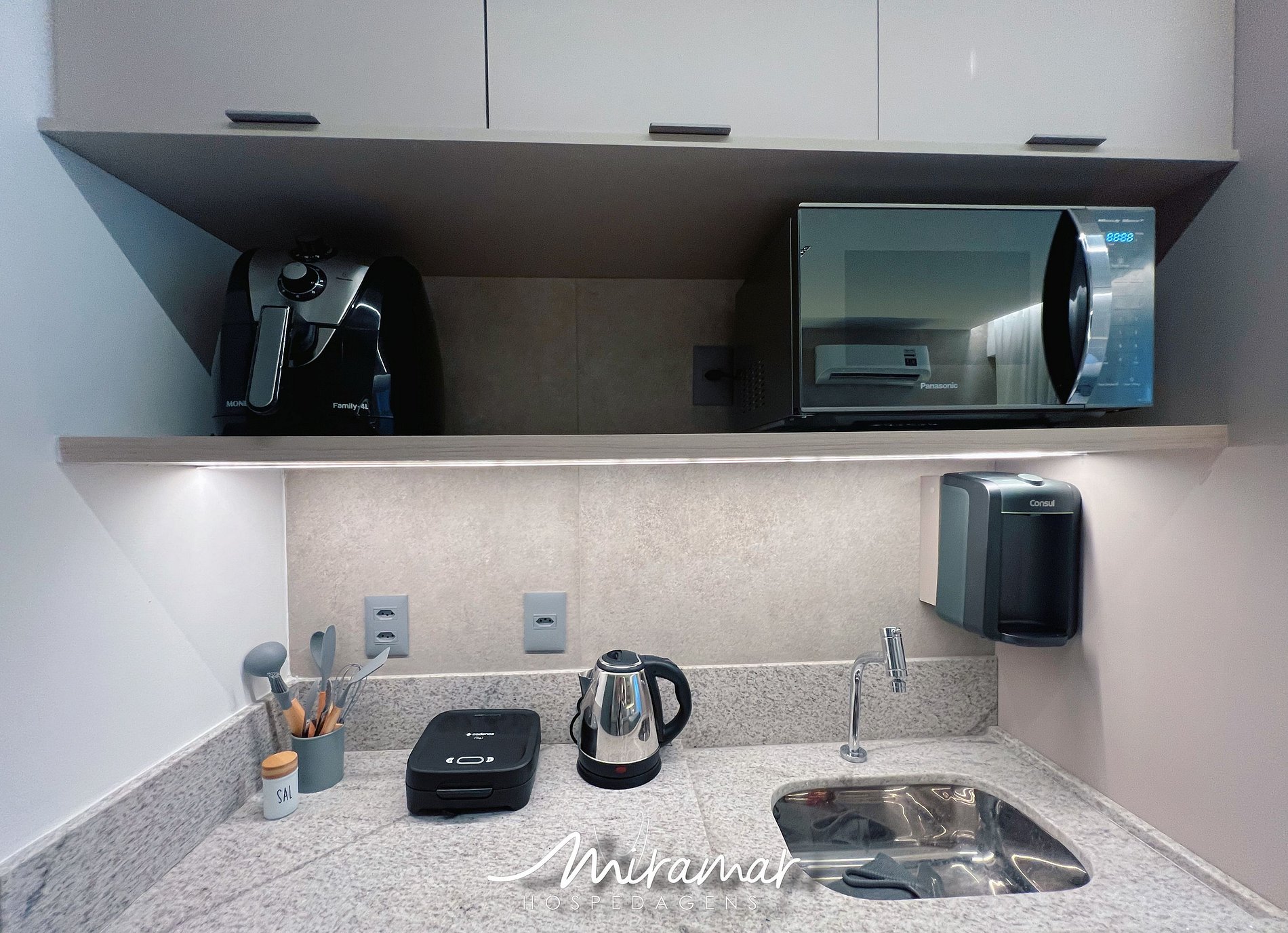 A cozinha compacta e bem equipada permite preparar refeições rápidas com praticidade, contando com fogão elétrico, sanduicheira, frigobar, cafeteira, airfryer, liquidificador, filtro de água, além de utensílios essenciais. O espaço também possui uma bancada com cadeiras, ideal para refeições e momentos de descanso.
