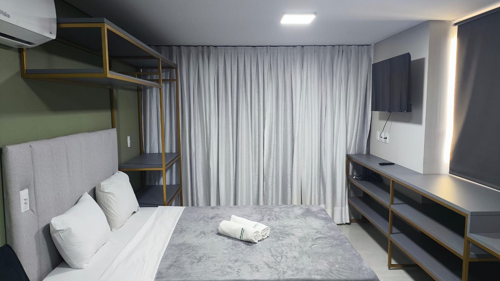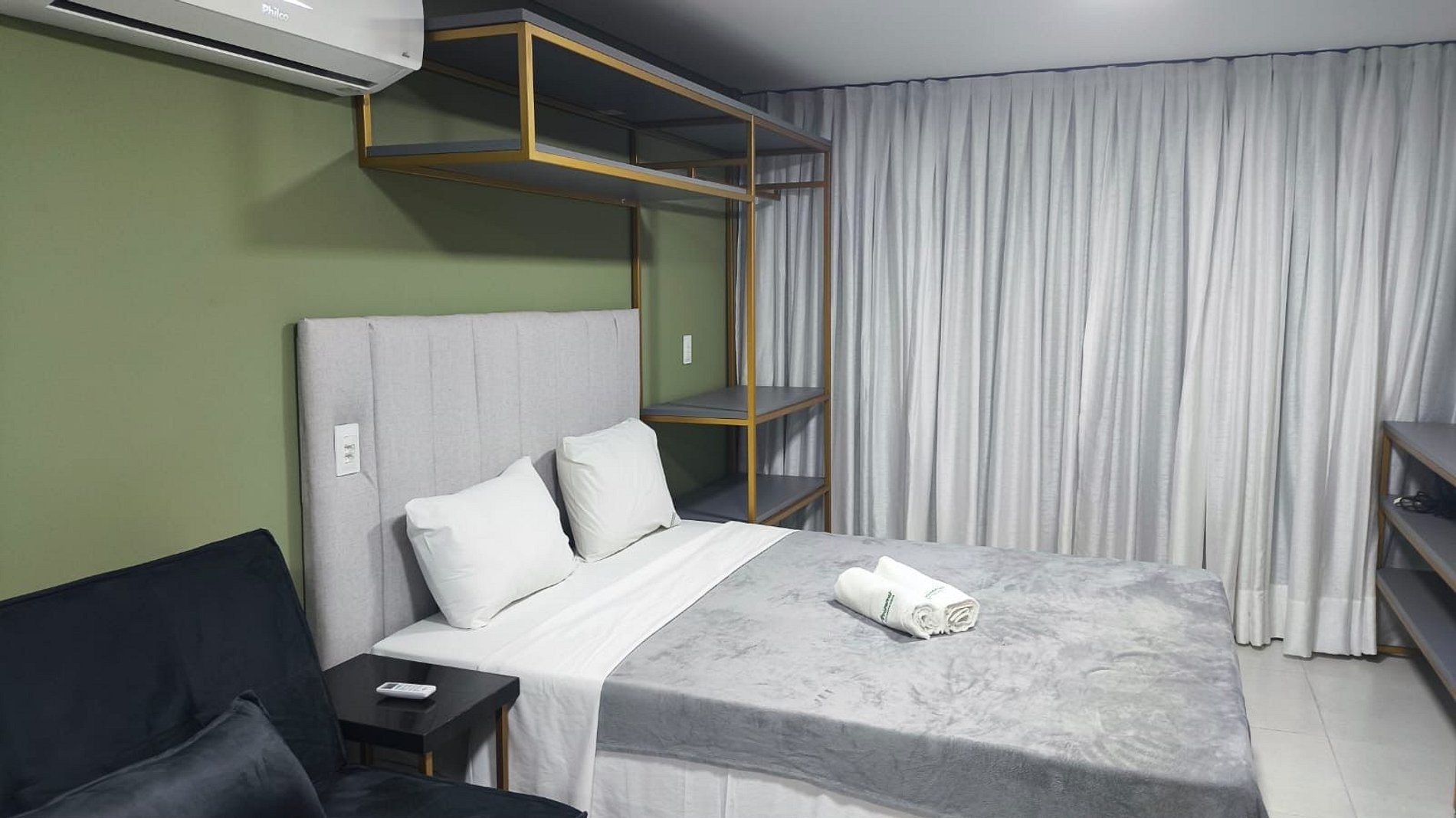 Venha se hospedar neste incrível flat no edifício Garden Haus. A unidade acomoda até 3 pessoas, com cama de casal e sofá-cama. Climatizado com ar-condicionado, o ambiente oferece conforto e uma atmosfera agradável. Para sua praticidade, há um guarda roupas para guardar seus pertences, cozinha compacta , equipada com eletrodomésticos essenciais. Conforto, praticidade e uma localização privilegiada!