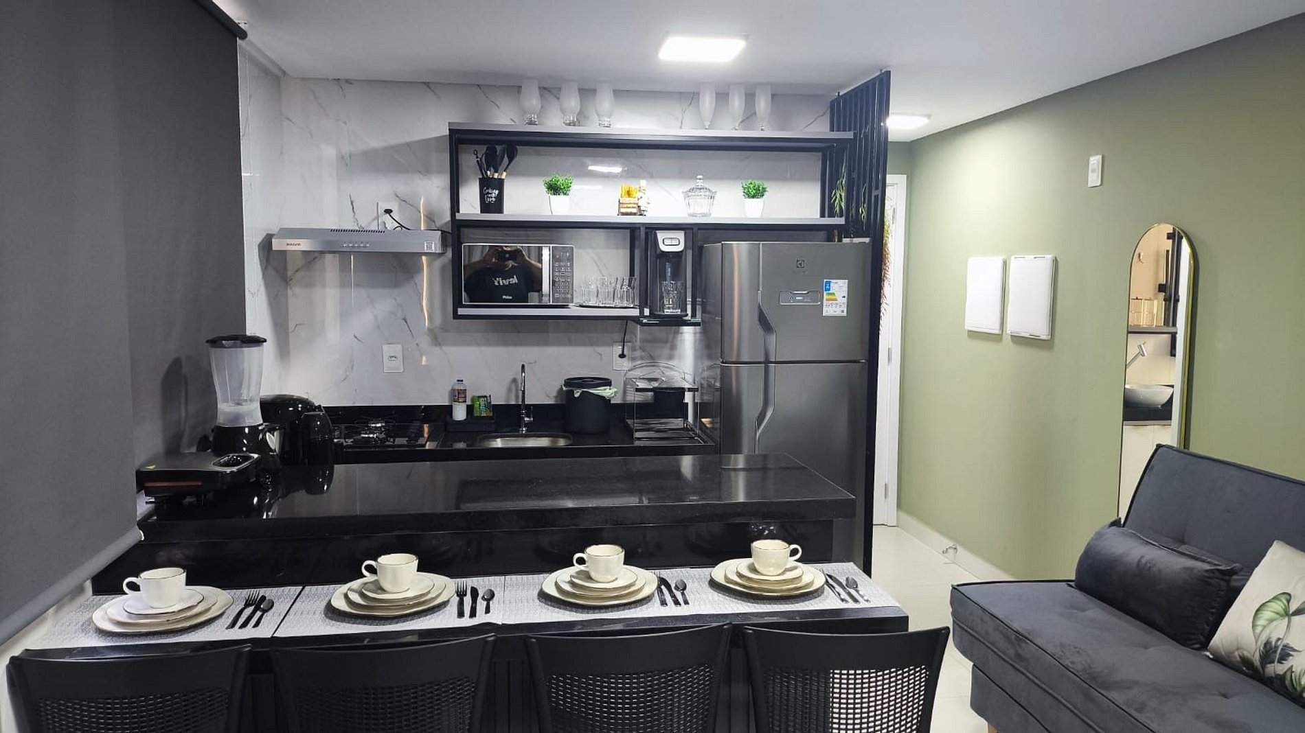 A cozinha compacta e funcional está equipada com fogão, micro-ondas, cafeteira, liquidificador, sanduicheira, além de louças e talheres, permitindo preparar refeições com facilidade durante a estadia.