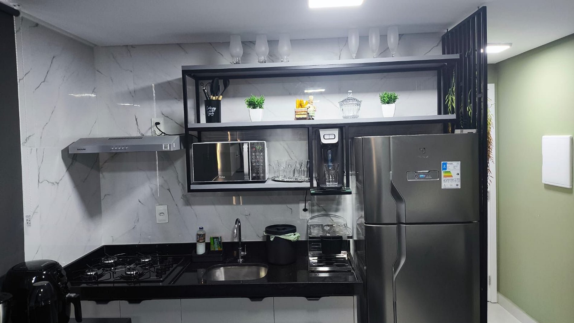 A cozinha compacta e funcional está equipada com fogão, micro-ondas, cafeteira, liquidificador, sanduicheira, além de louças e talheres, permitindo preparar refeições com facilidade durante a estadia.