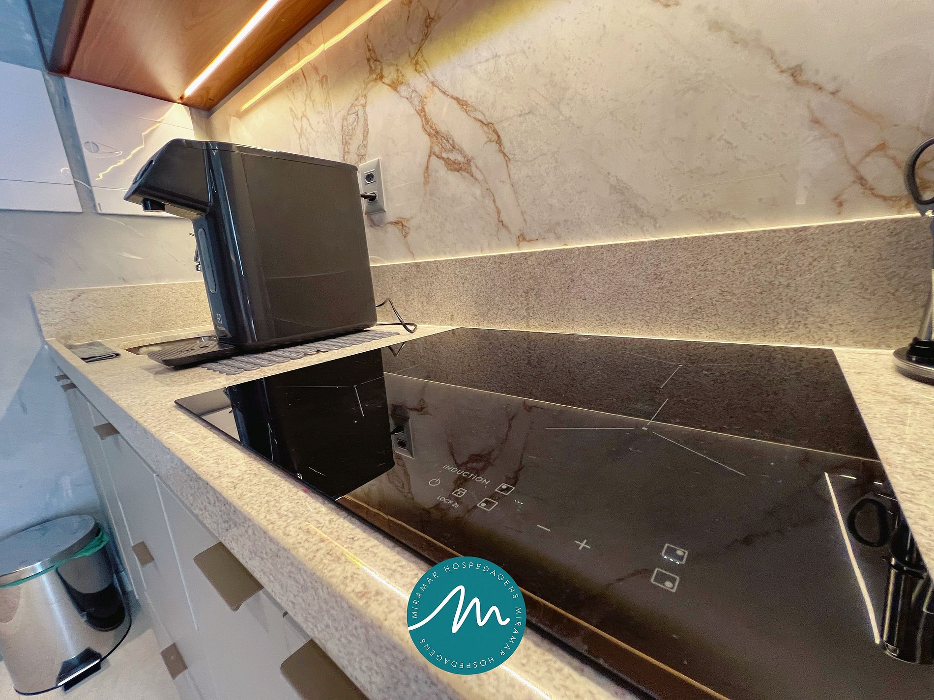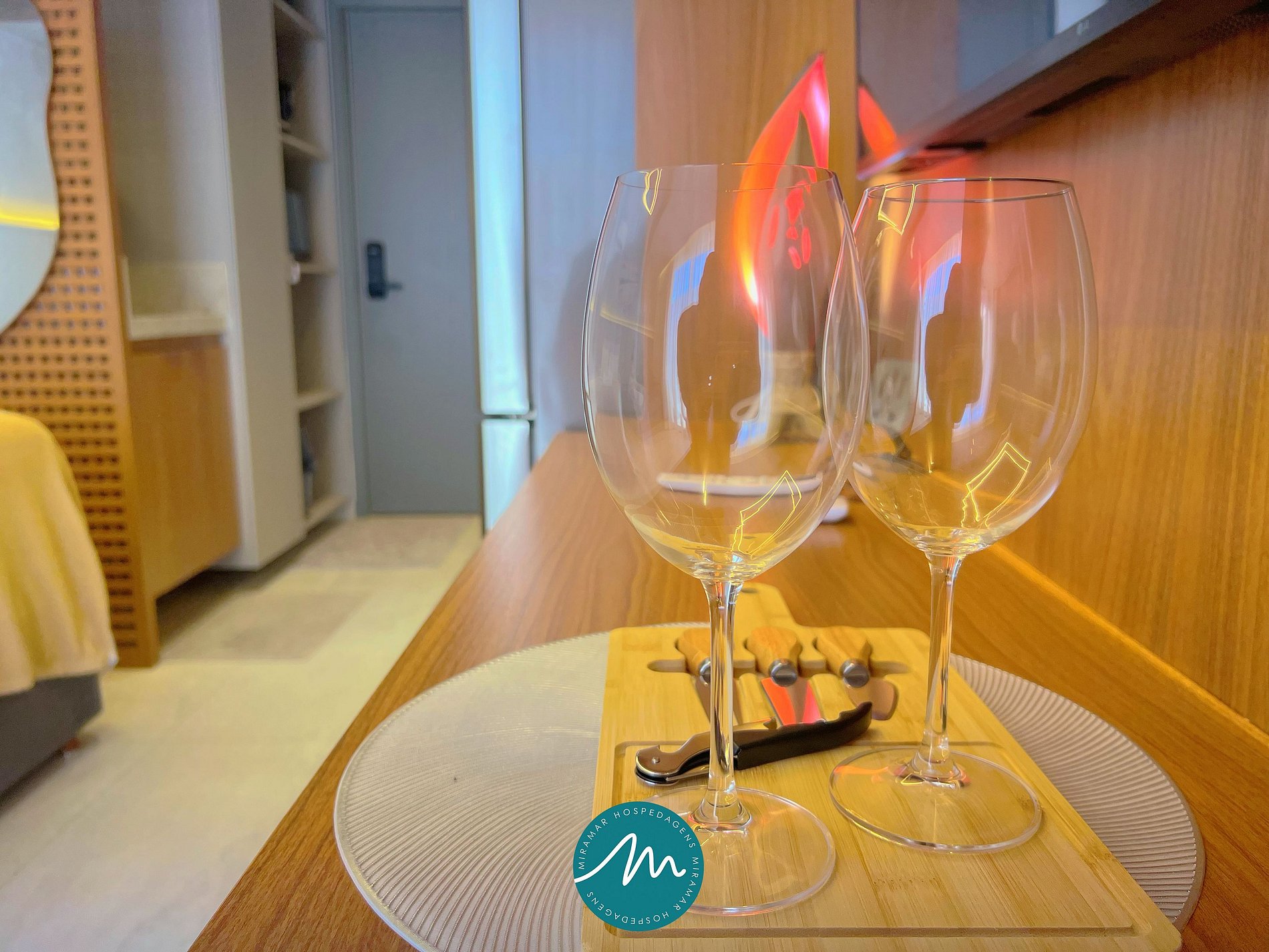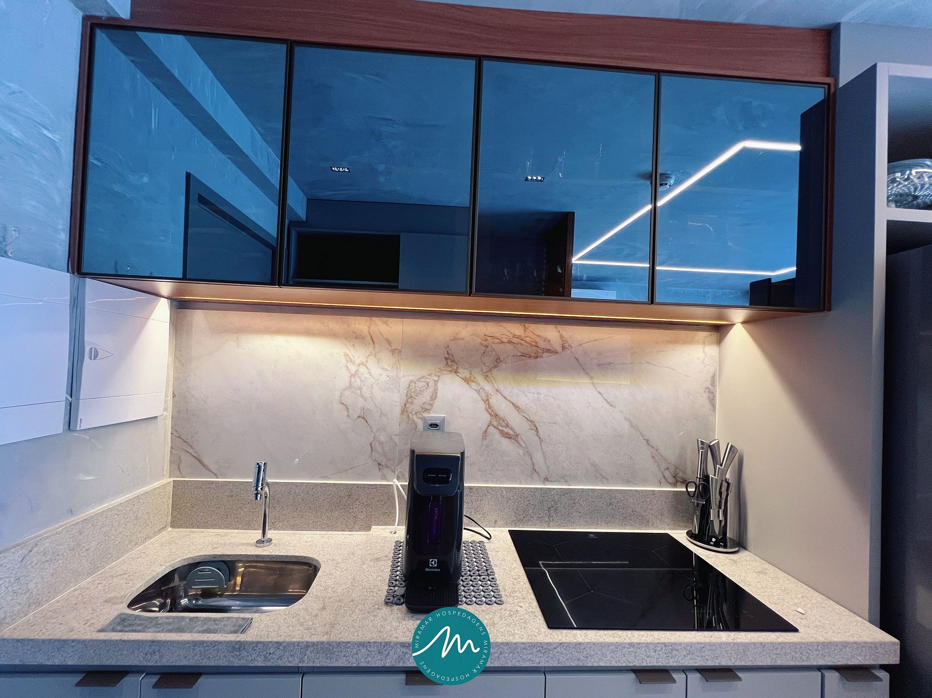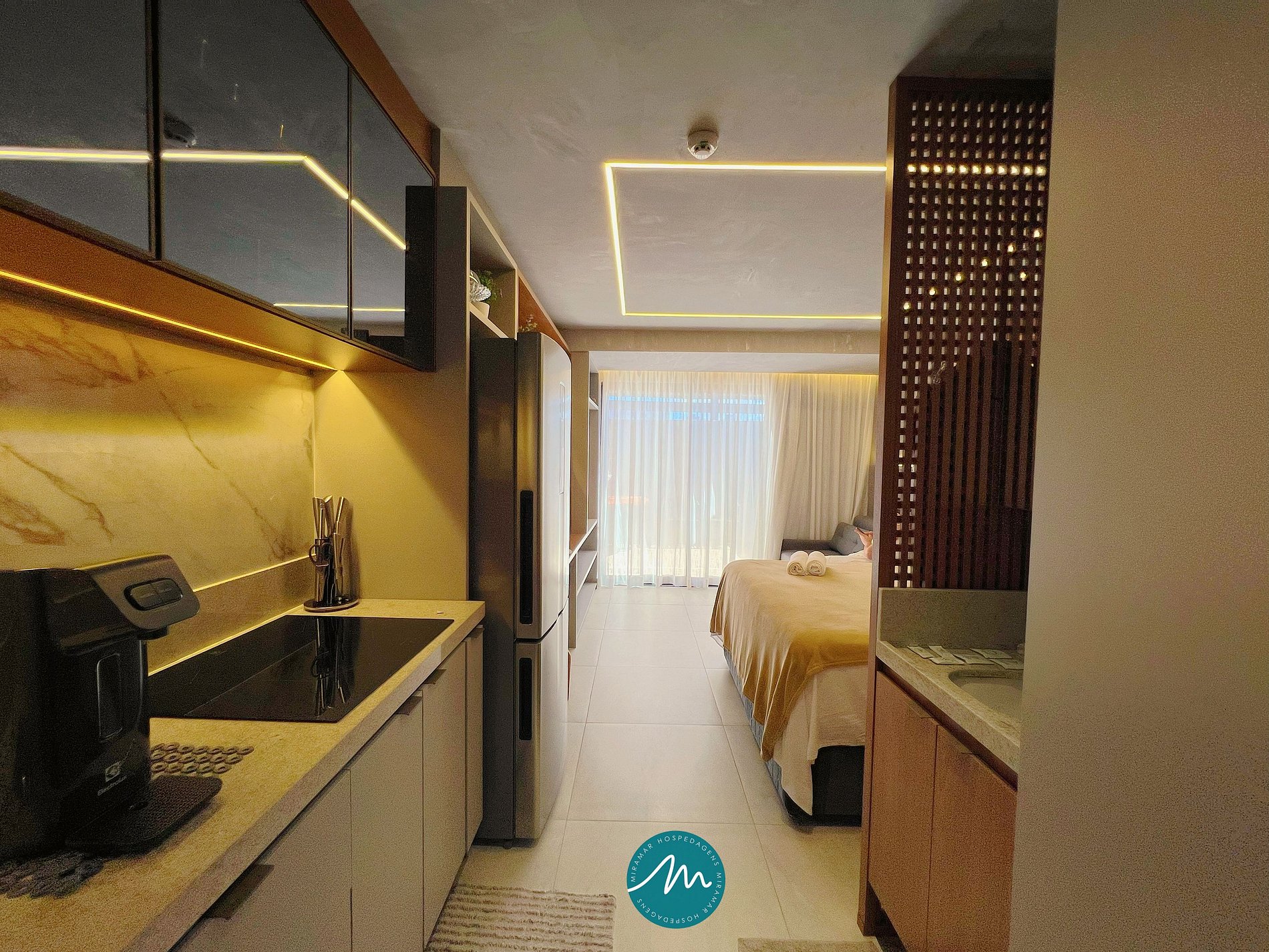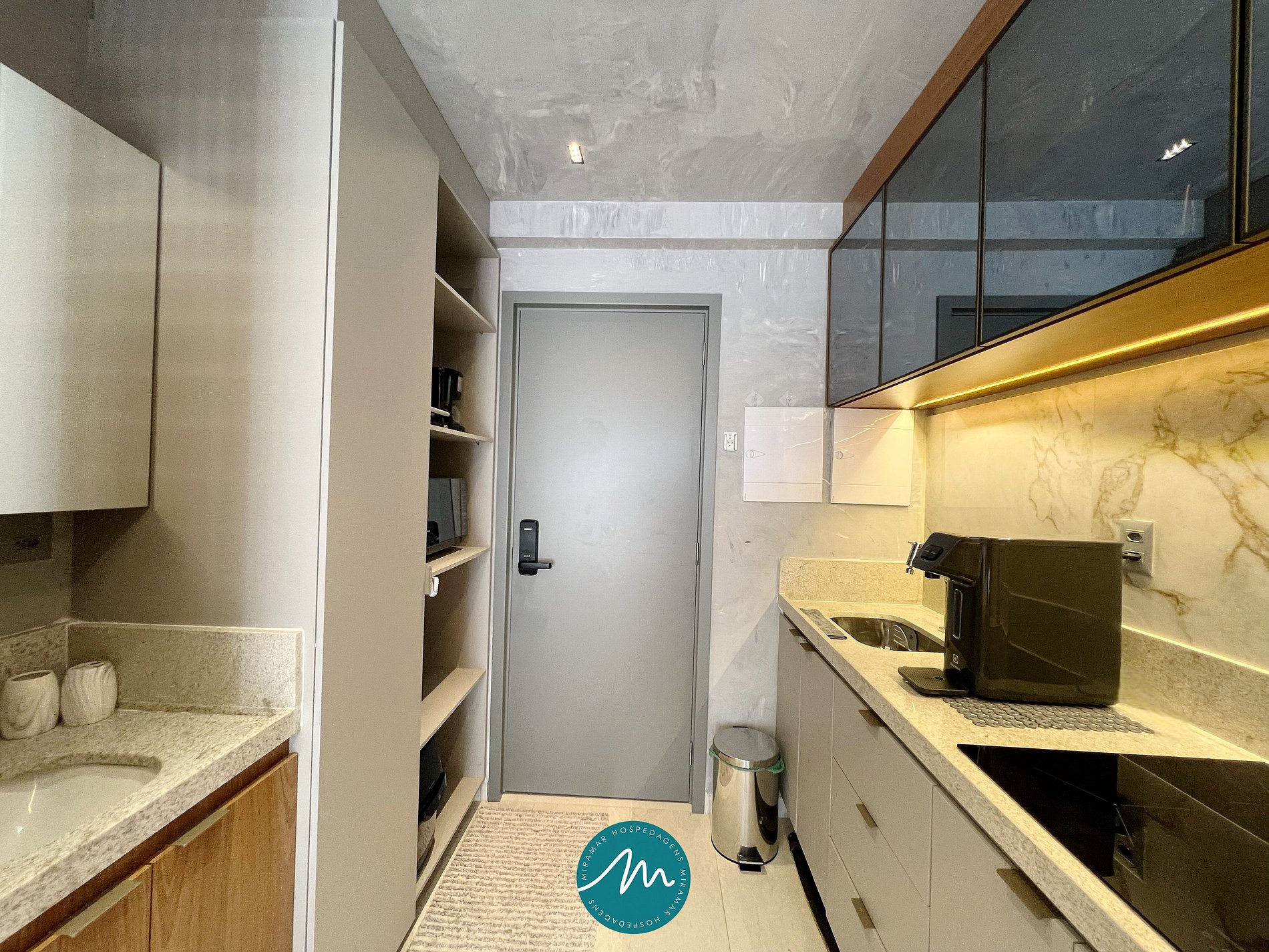 A cozinha compacta e funcional é equipada com fogão, micro-ondas, cafeteira, frigobar, liquidificador, sanduicheira, além de louças e talheres, permitindo preparar refeições com total comodidade durante a estadia.
