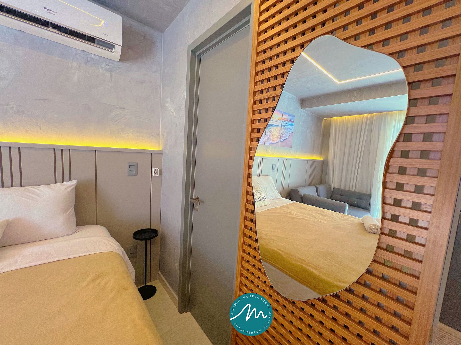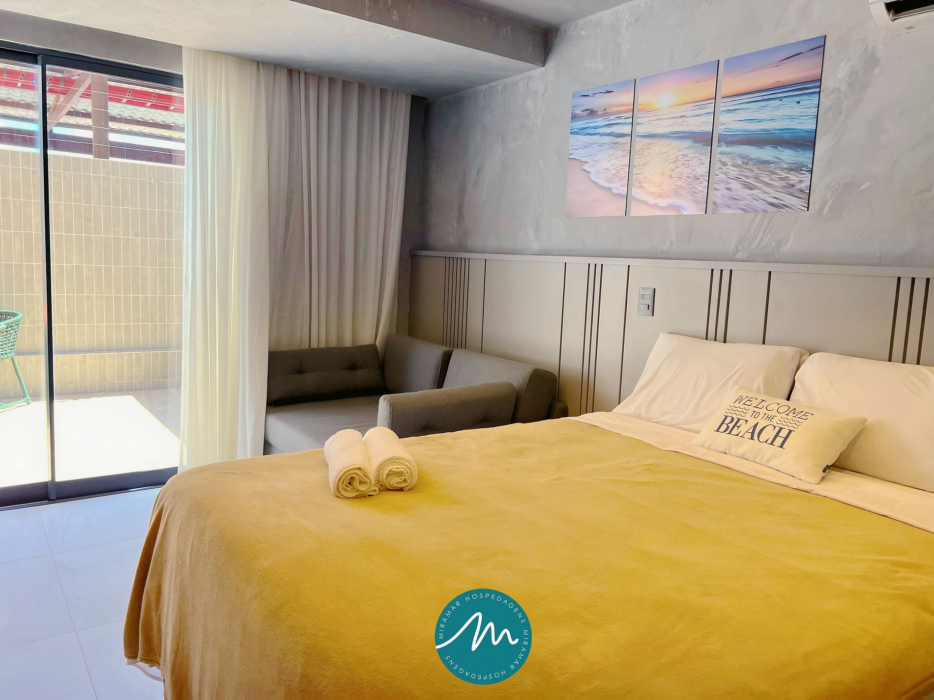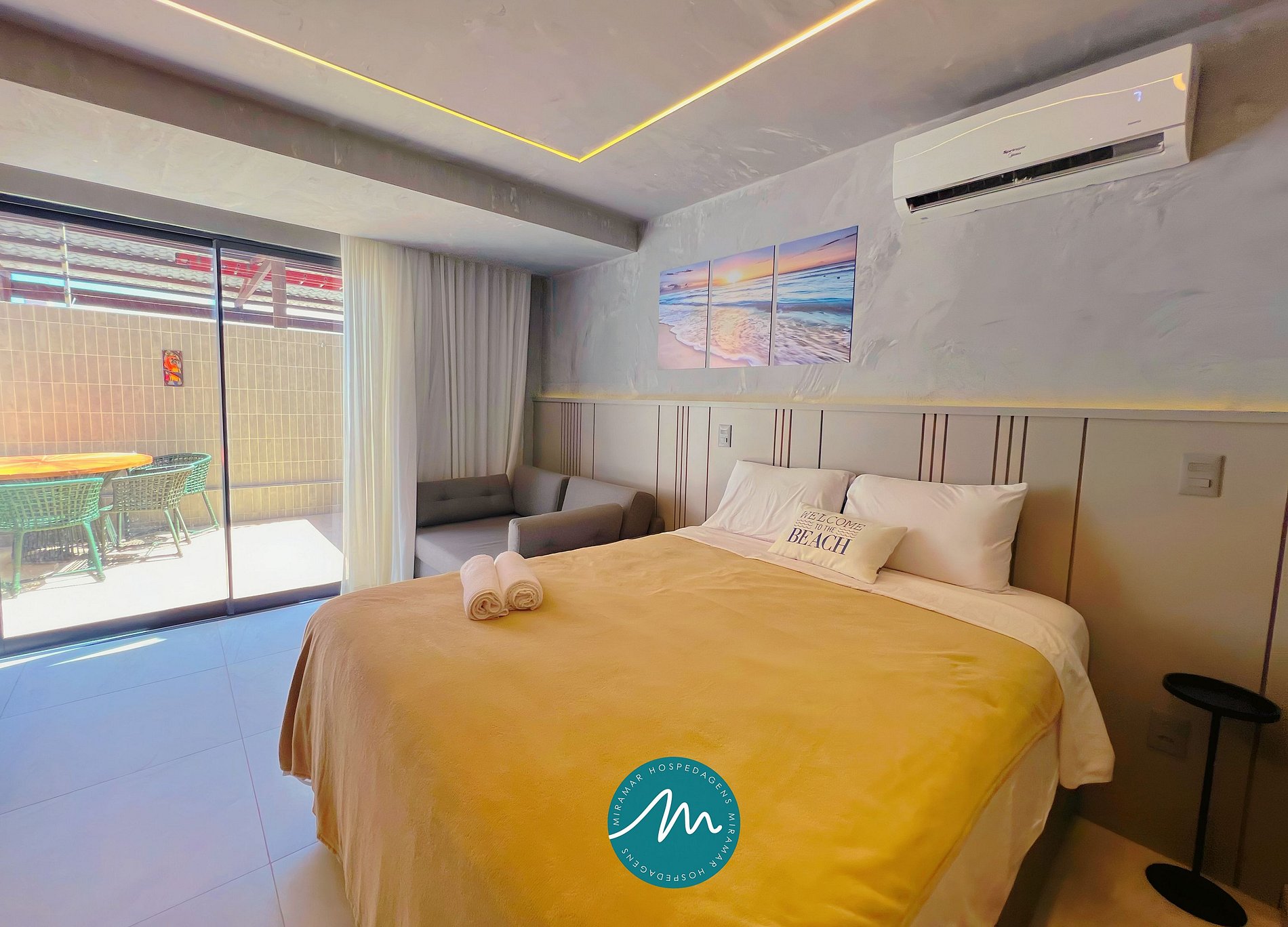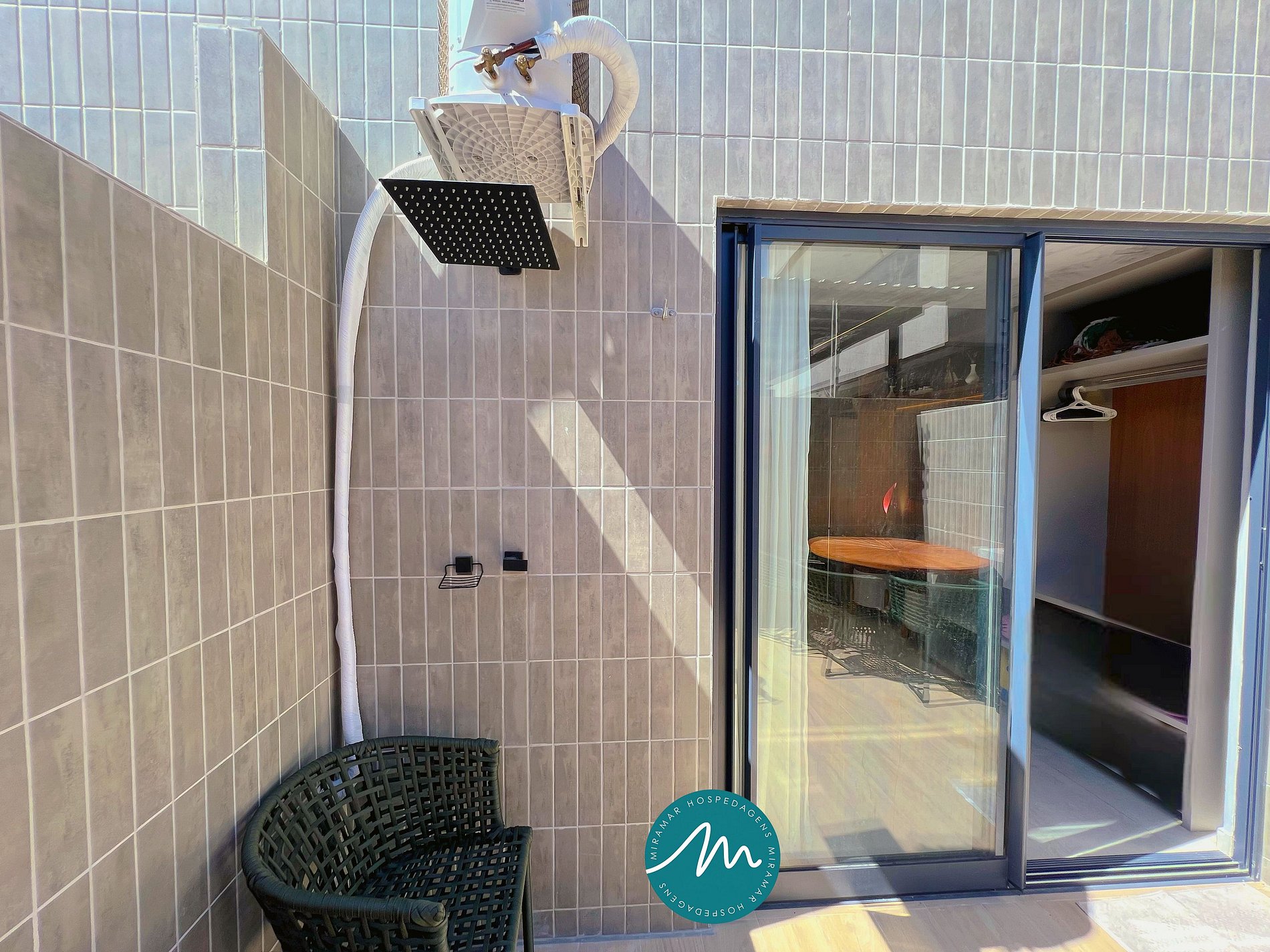 Um dos grandes diferenciais é o terraço privativo, com mesa e cadeiras, perfeito para relaxar, tomar um café pela manhã ou aproveitar momentos tranquilos ao ar livre. Para completar a experiência, o flat conta com chuveiro externo, ideal após um banho de mar ou piscina.