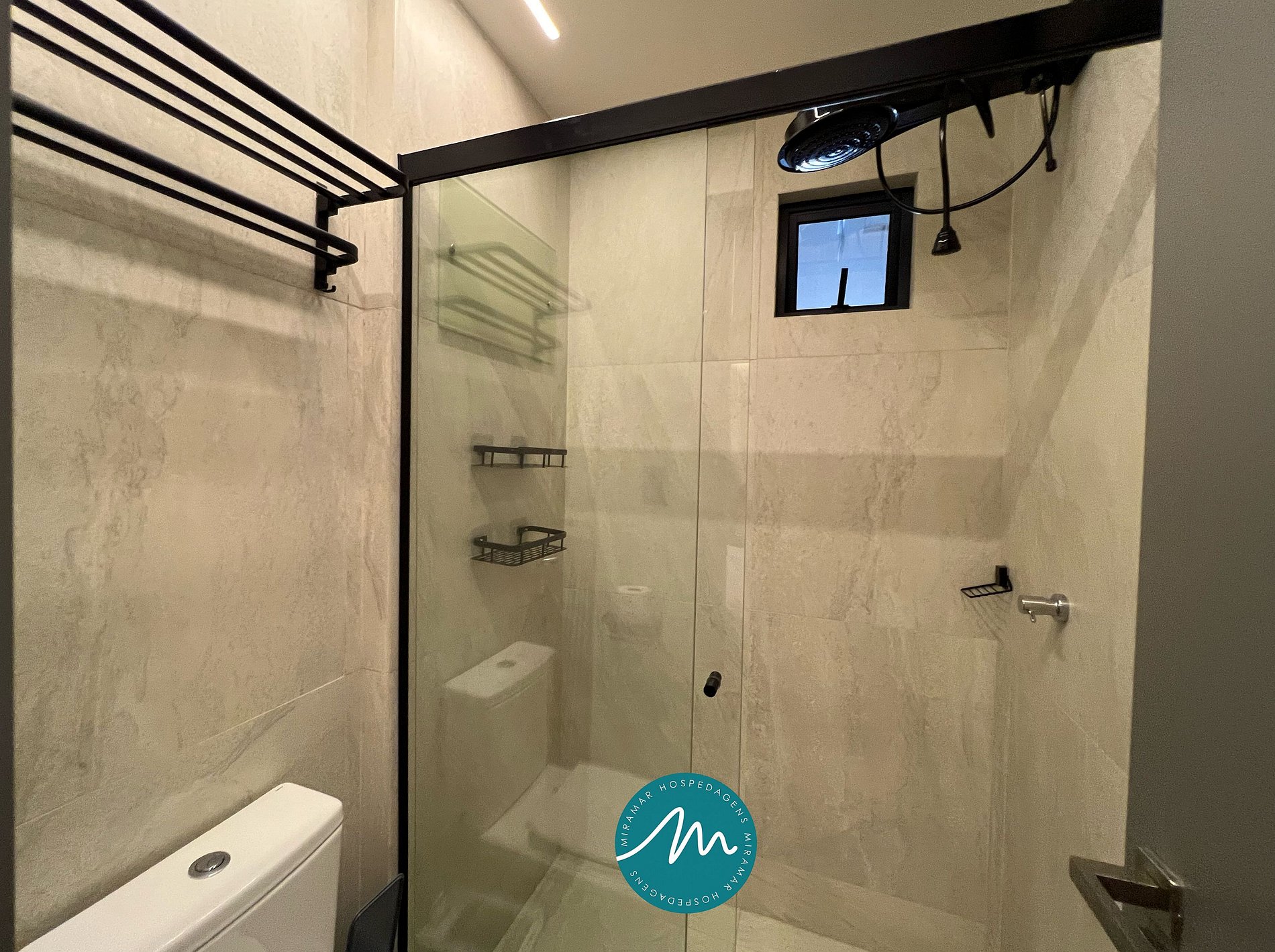 O banheiro possui box. A pia para higiene pessoal fica em área externa, com espelho em LED, trazendo um toque moderno e prático ao ambiente.