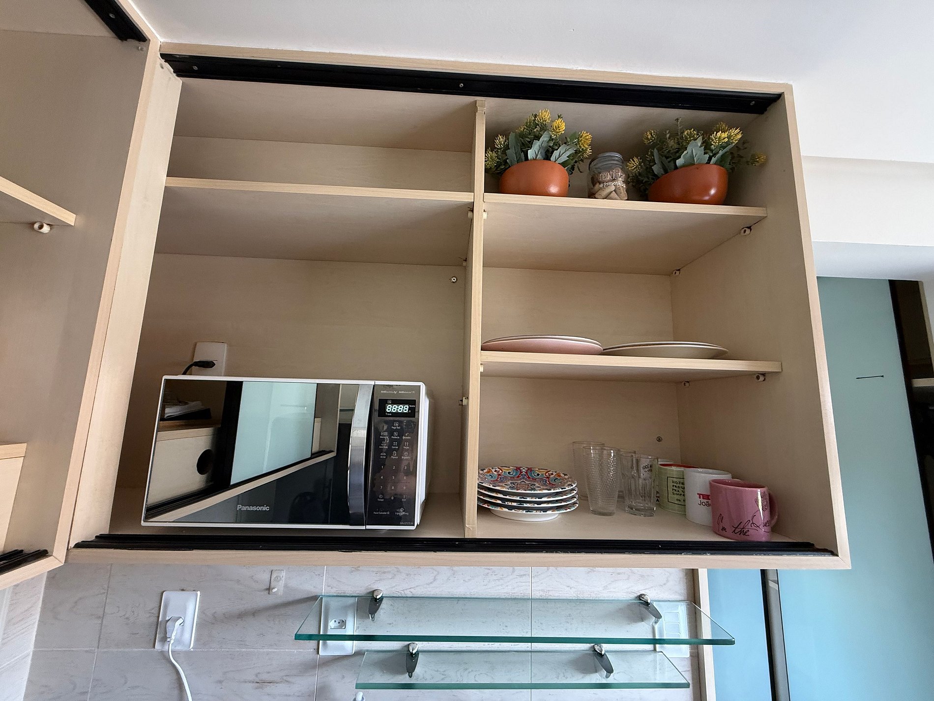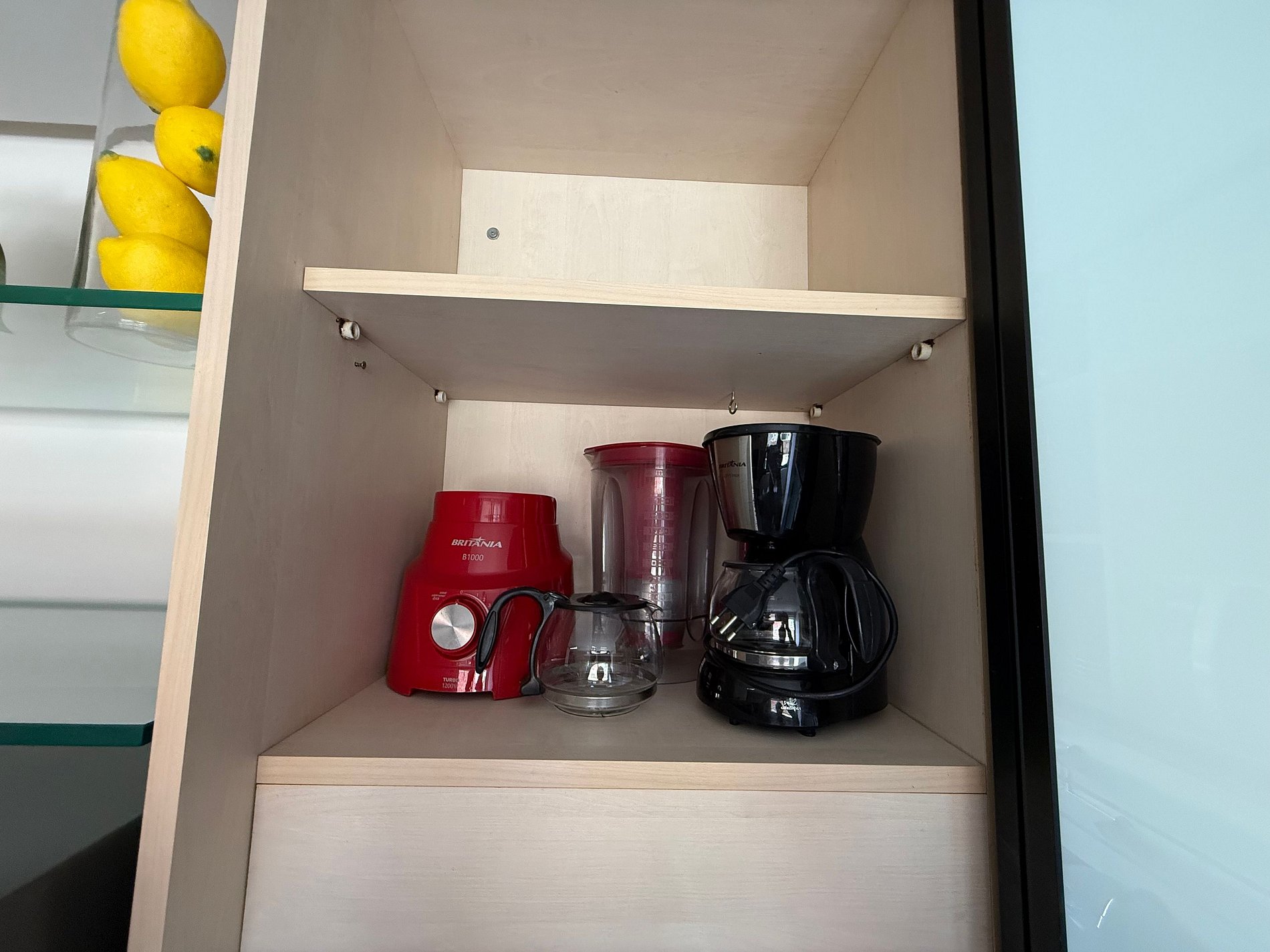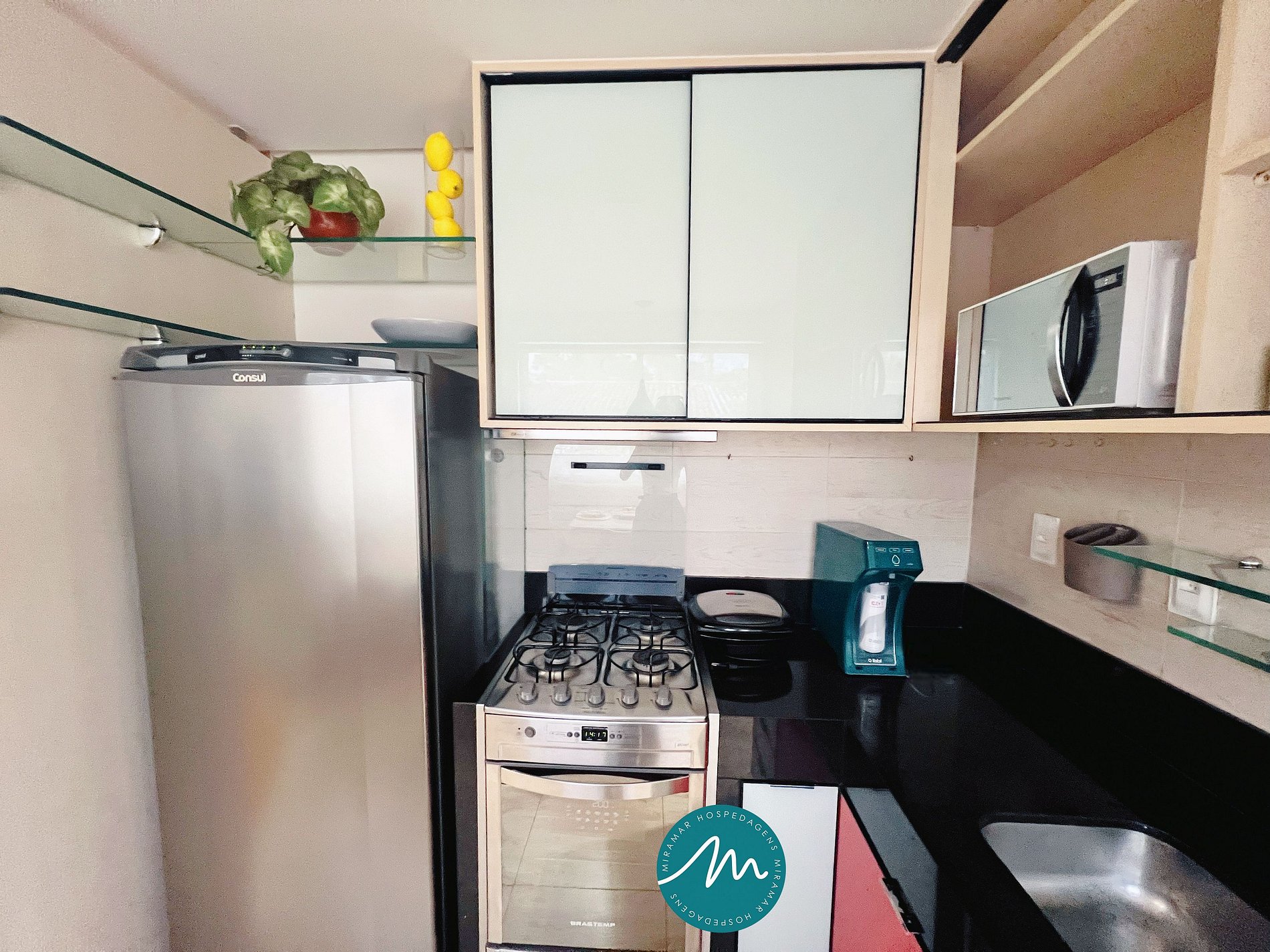A cozinha equipada dispõe de fogão, geladeira, micro-ondas, cafeteira e sanduicheira, ideal para o preparo de refeições básicas do dia a dia.