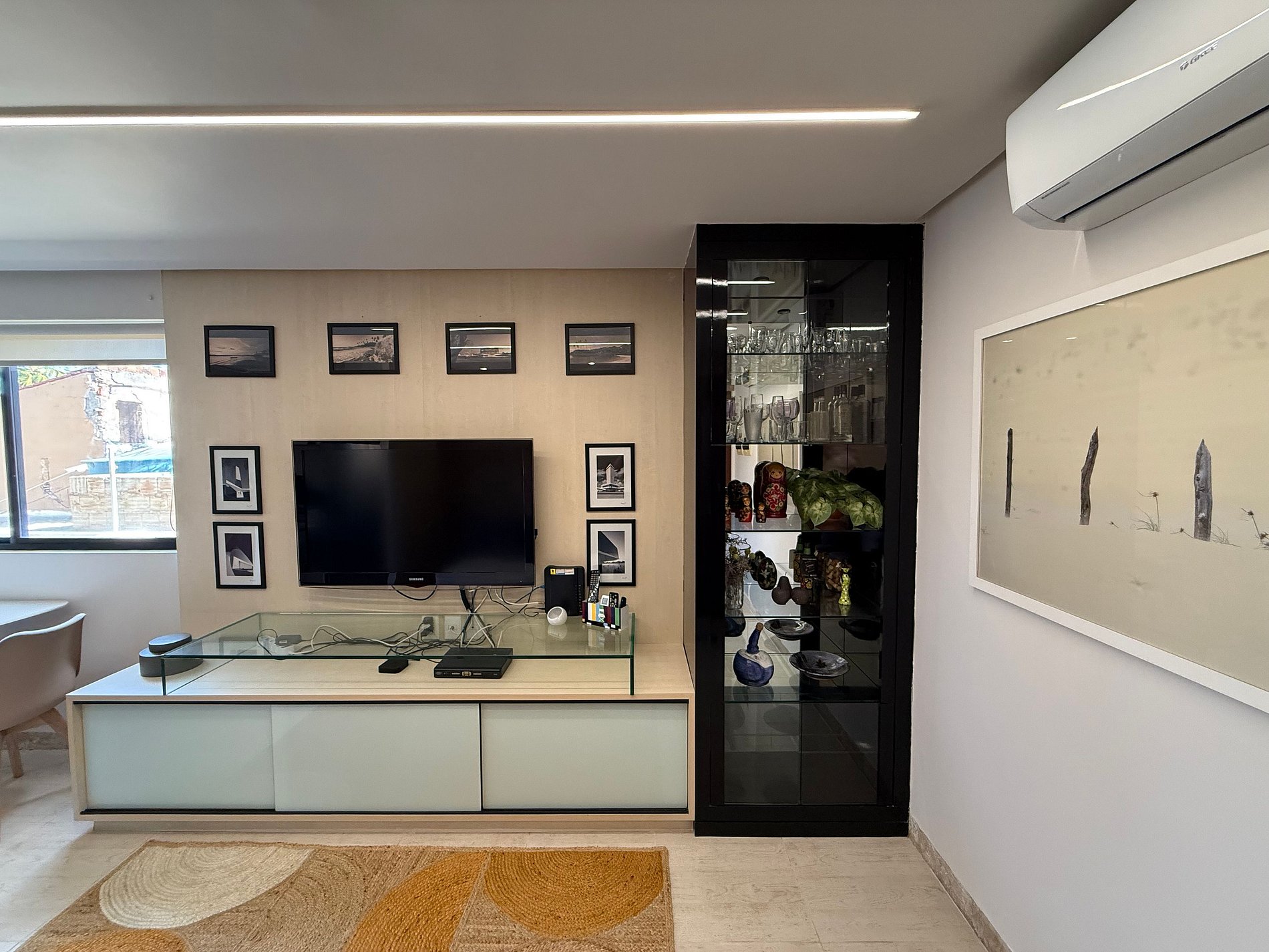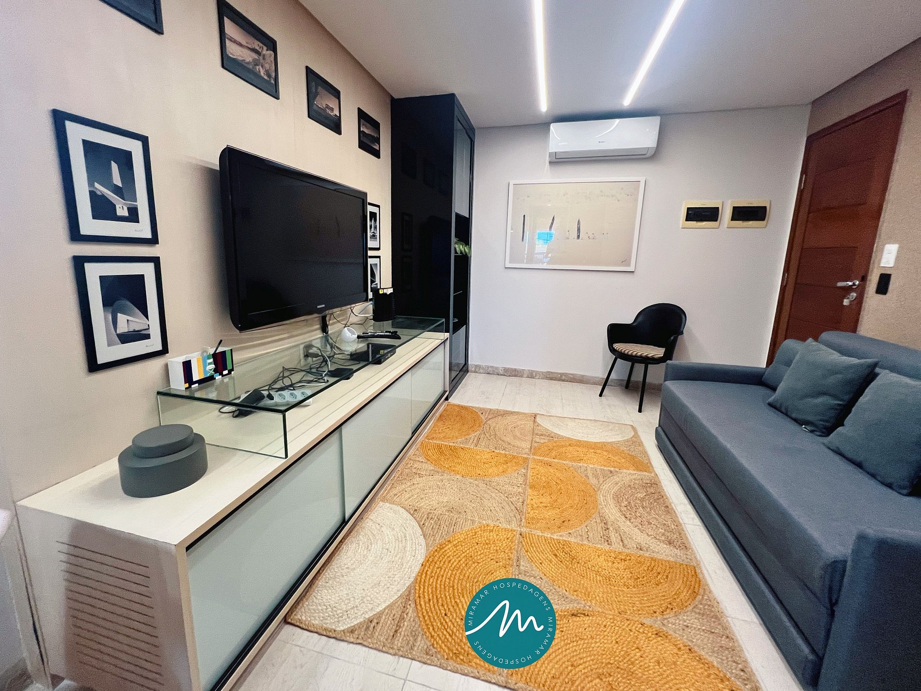 O quarto conta com uma cama confortável, decoração acolhedora e ar-condicionado, acomodando até 2 hóspedes com total conforto. Na sala, há sofá-cama, televisão e ar-condicionado, permitindo receber até 4 hóspedes no total com praticidade.