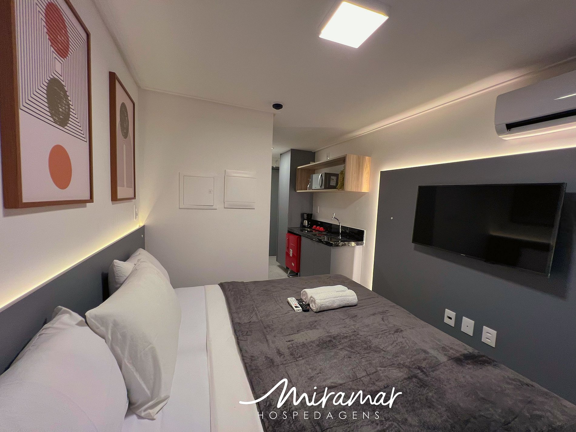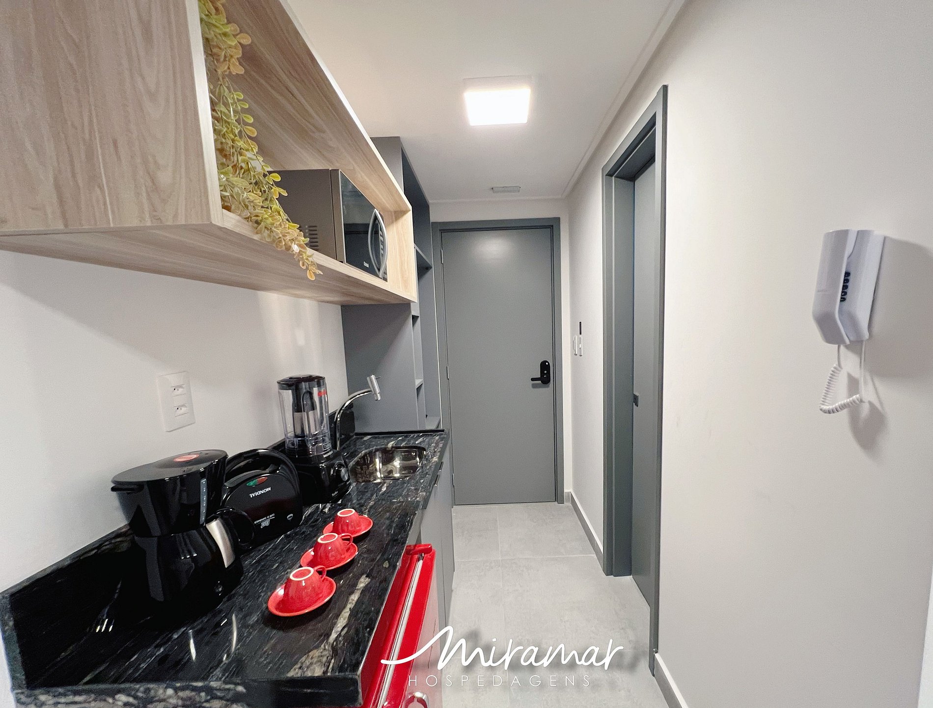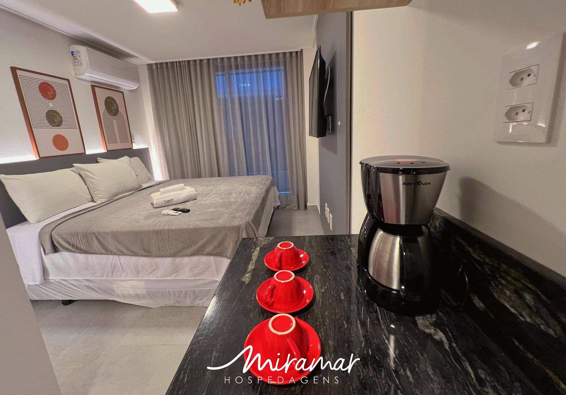 A unidade com varanda, dispõe de cama de casal e cama auxiliar de solteiro, ideal para receber uma família de 3 pessoas, com ar-condicionado e televisão, garantindo conforto durante a estadia. Conta com um ambiente destinado à cozinha, equipado com cafeteira, sanduicheira, micro-ondas, frigobar, louças e talheres, além de armários, permitindo o preparo de refeições simples no dia a dia.