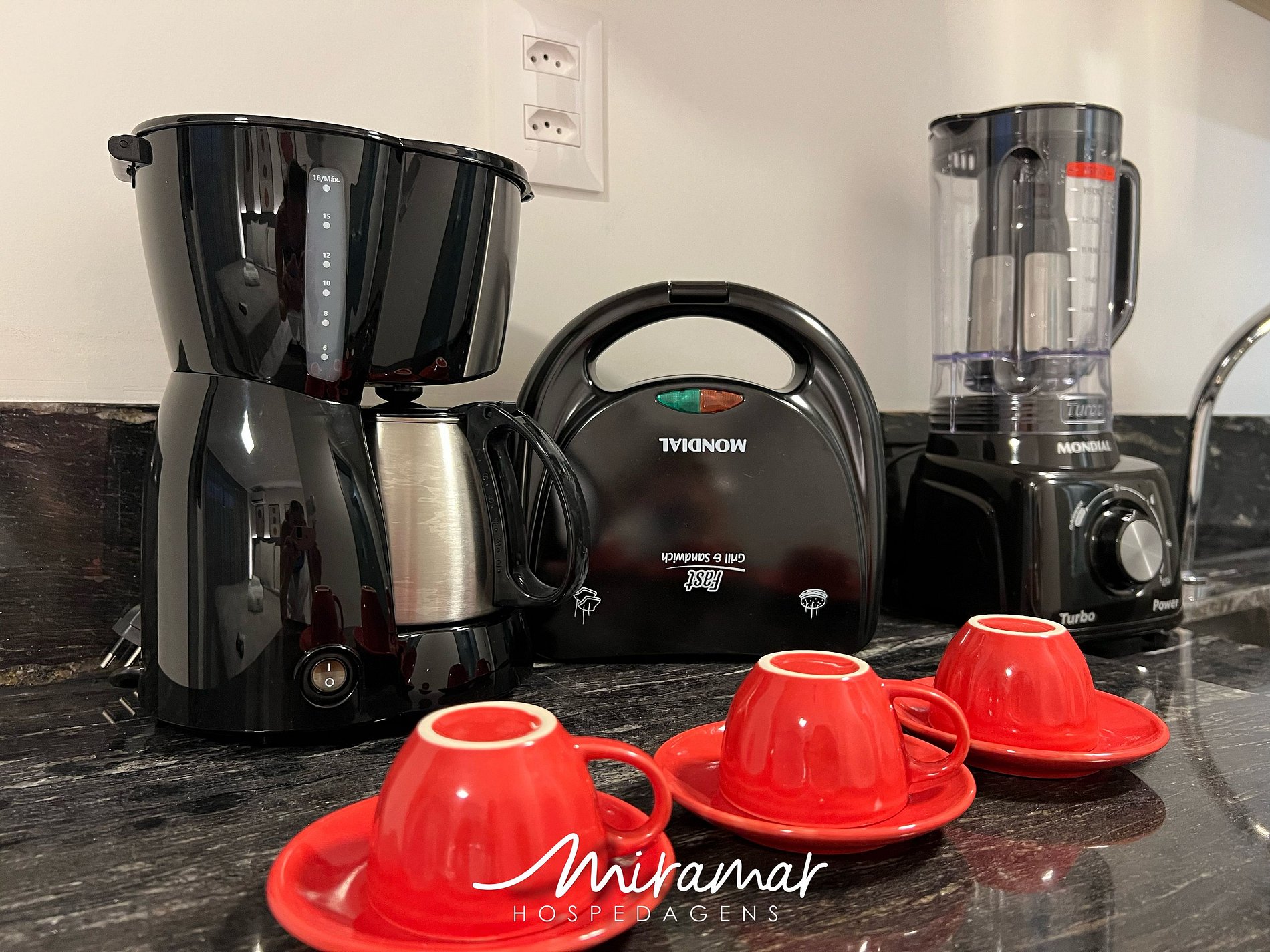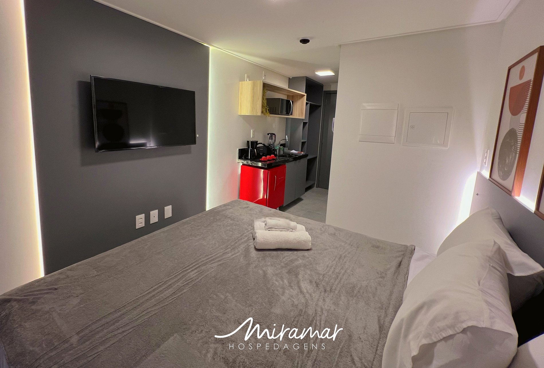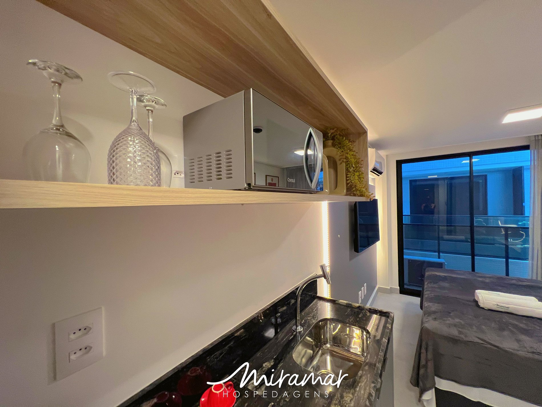 A unidade com varanda, dispõe de cama de casal e cama auxiliar de solteiro, ideal para receber uma família de 3 pessoas, com ar-condicionado e televisão, garantindo conforto durante a estadia. Conta com um ambiente destinado à cozinha, equipado com cafeteira, sanduicheira, micro-ondas, frigobar, louças e talheres, além de armários, permitindo o preparo de refeições simples no dia a dia.
