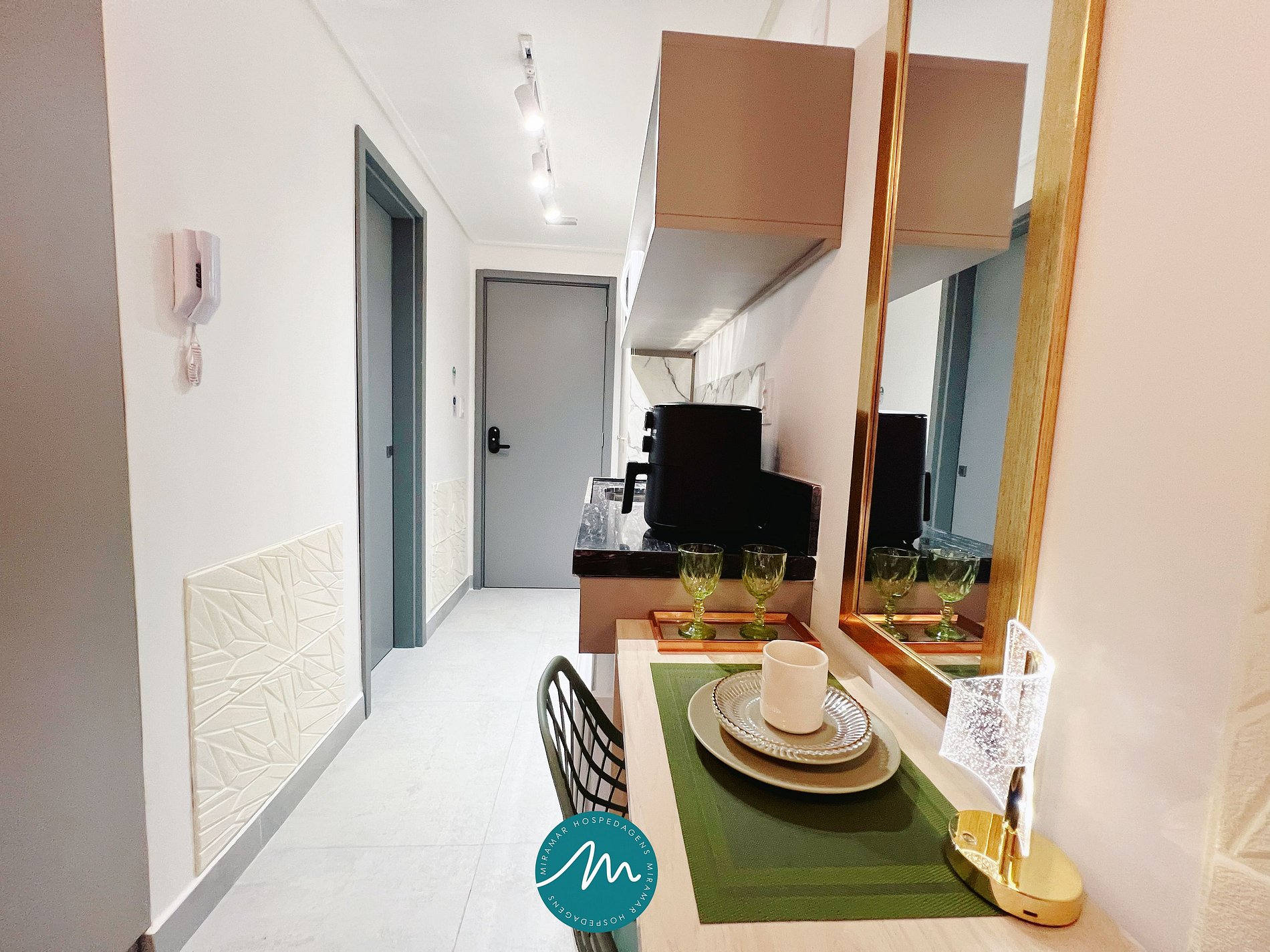 O espaço destinado à cozinha é prático e bem equipado, com airfryer, cafeteira, frigobar, micro-ondas, fogão além de louças e talheres, permitindo preparar refeições de forma simples e funcional.