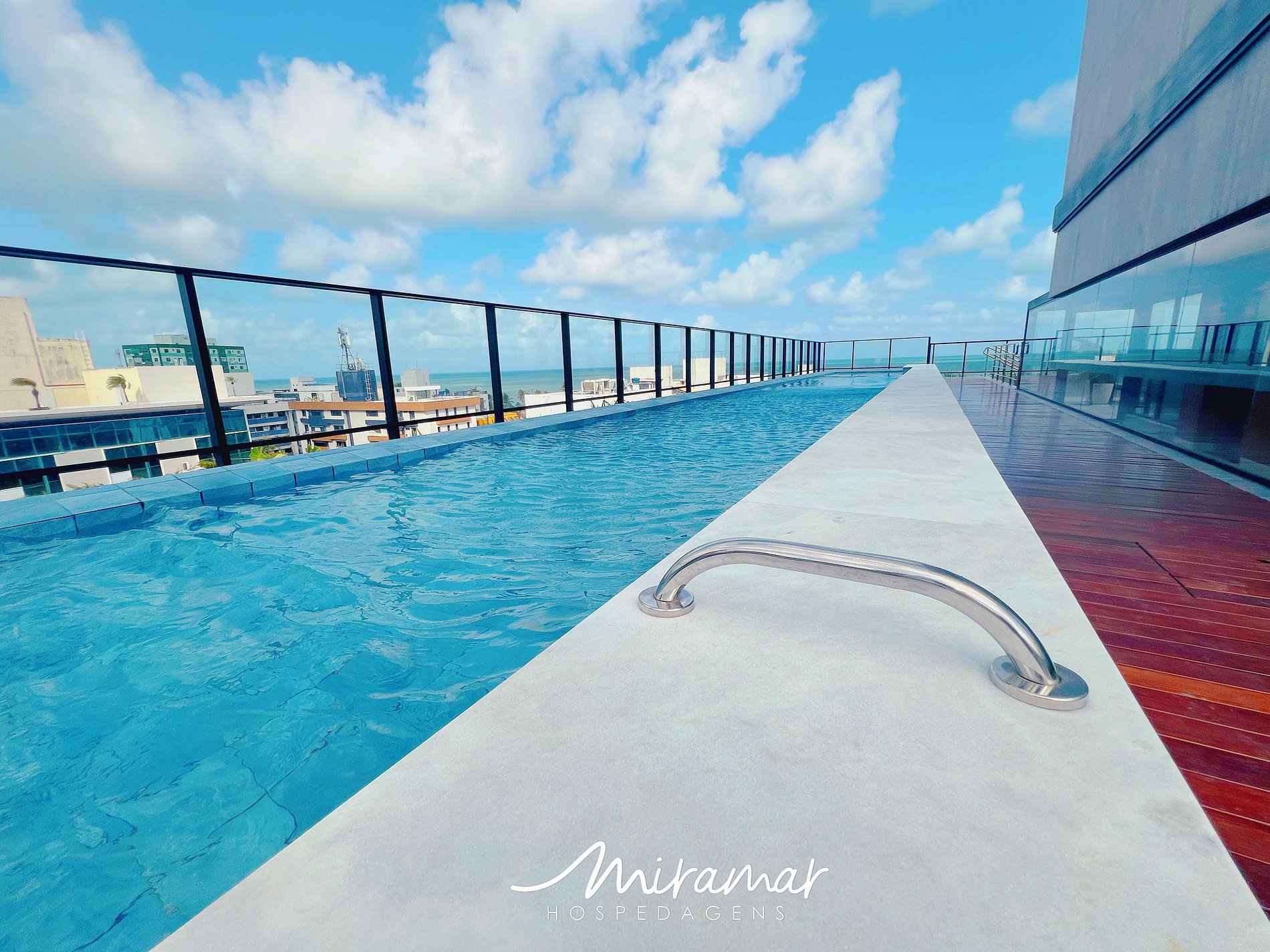 O grande destaque do empreendimento é a lindíssima piscina olímpica na cobertura, que proporciona uma vista espetacular do mar. O rooftop conta com diversas cadeiras para descanso e mesas, criando o ambiente perfeito para relaxar, aproveitar o sol e curtir o visual da orla.