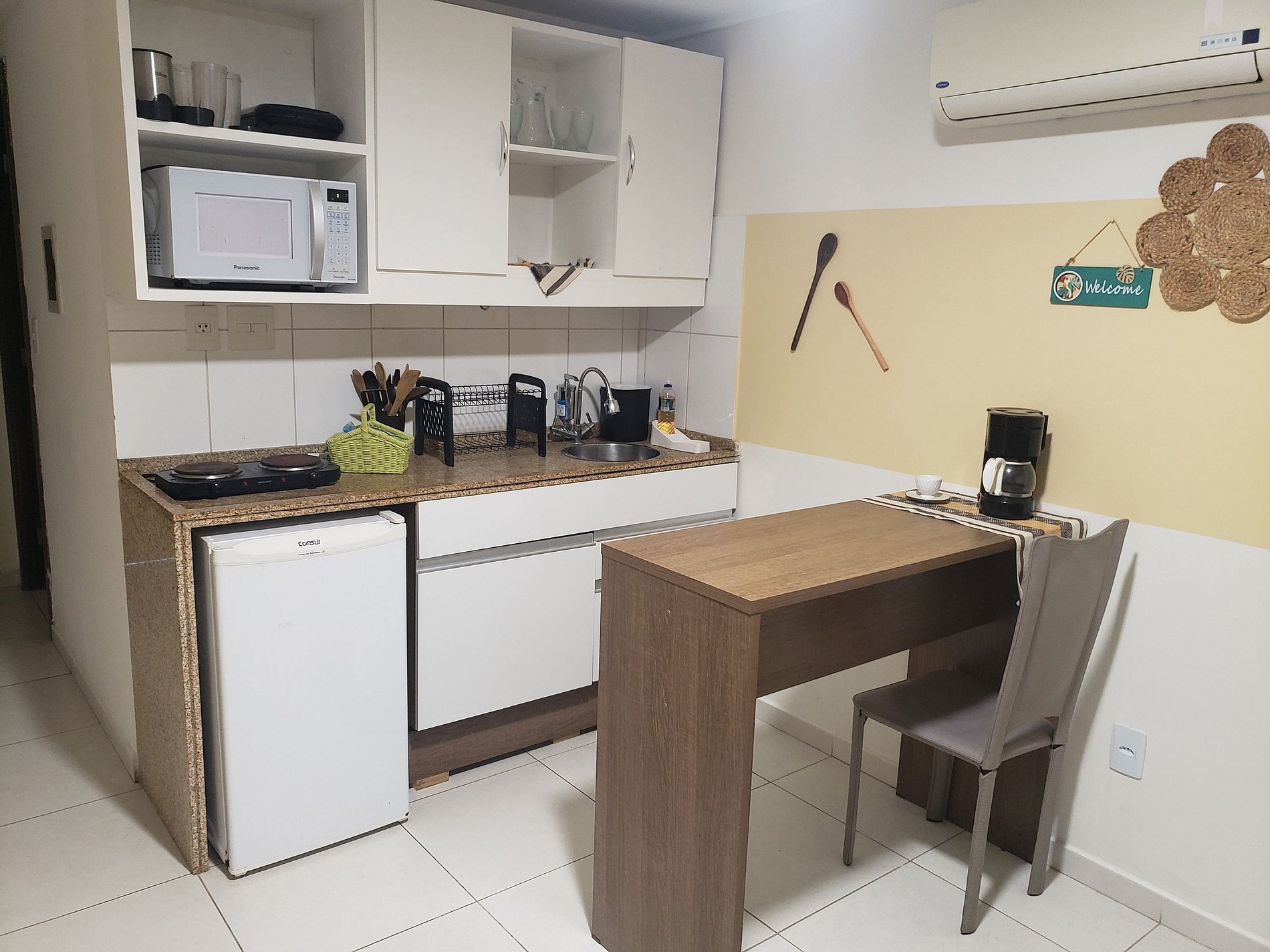 A diária da acomodação não inclui café da manhã, com o intuito de tornar o preço mais atrativo. Além disso, o apartamento dispõe de todos os eletrodomésticos e utensílios de cozinha.