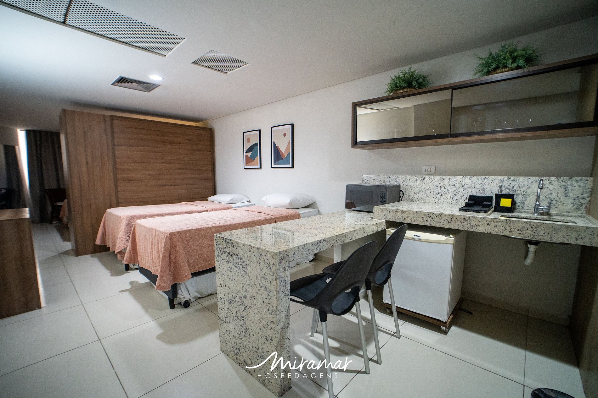 Confortável apartamento Nobile Suíte, com 3 camas: uma de casal e duas de solteiro. O ambiente é totalmente climatizado, proporcionando conforto durante sua estadia. Um guarda-roupa divide o espaço, garantindo privacidade para quem fica na cama de casal. A cozinha compacta conta com bancada e duas cadeiras, ideal para refeições rápidas ou trabalho.