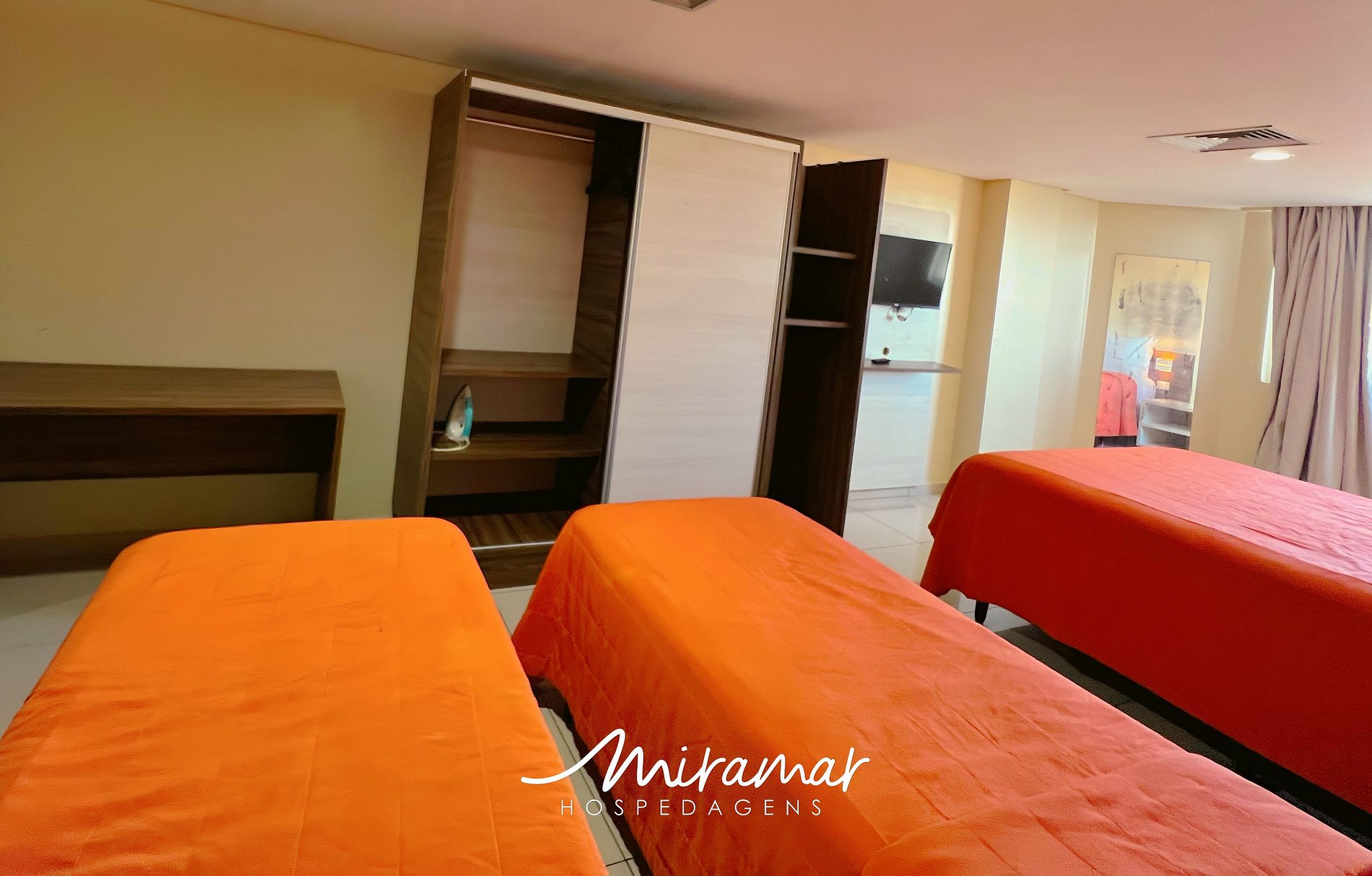A unidade é equipada com 3 camas, 1 de casal e 2 de solteiro, acomodando até 4 hóspedes. O espaço é climatizado com ar-condicionado, mantendo o clima do quarto fresco e agradável. A janela, revela uma linda vista lateral do mar porém a cortina, blackout, prepara o ambiente para uma noite de sono tranquila. Para sua comodidade, um guarda-roupas, para que possa guardar seus pertences. Além disso, ferro de passar e um varal de chão. Para momentos de entretenimento, temos uma Tv.