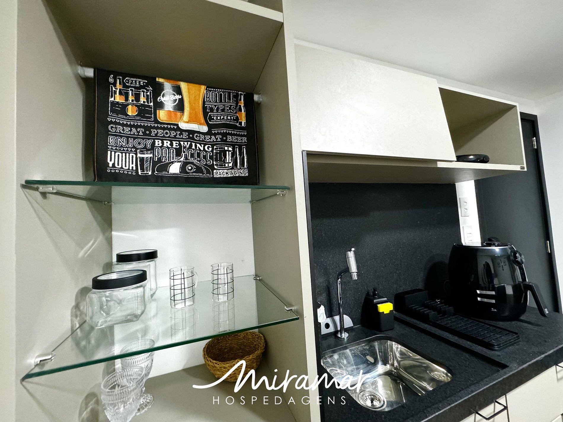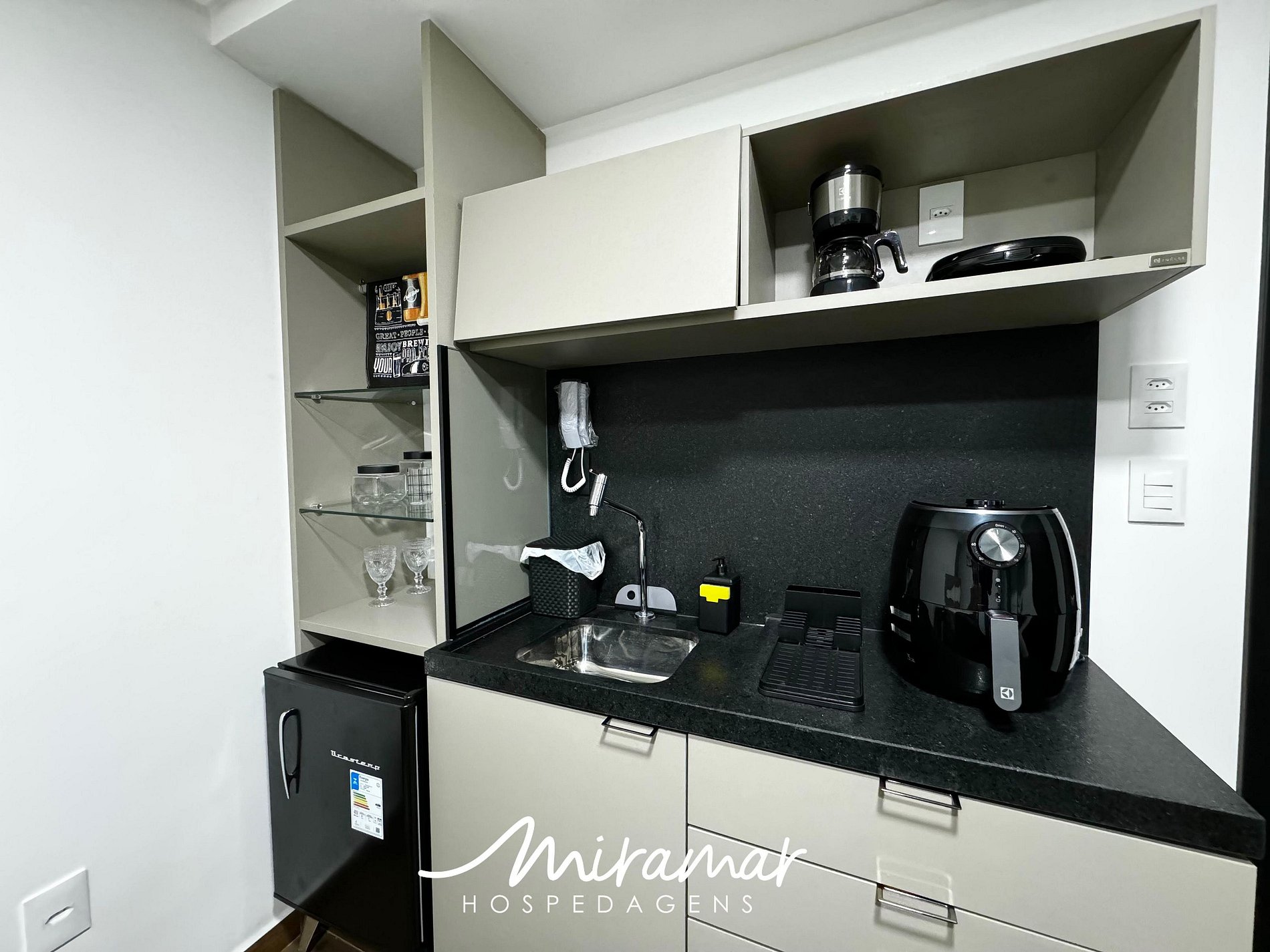 Na cozinha compacta, você encontrará todos os eletrodomésticos necessários para preparar refeições práticas, cafeteira, sanduicheira, frigobar e air fryer.