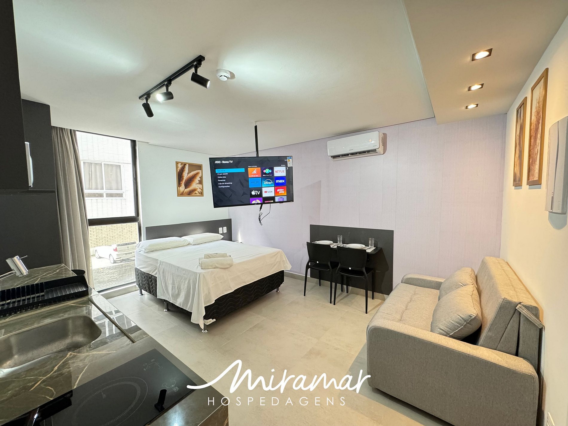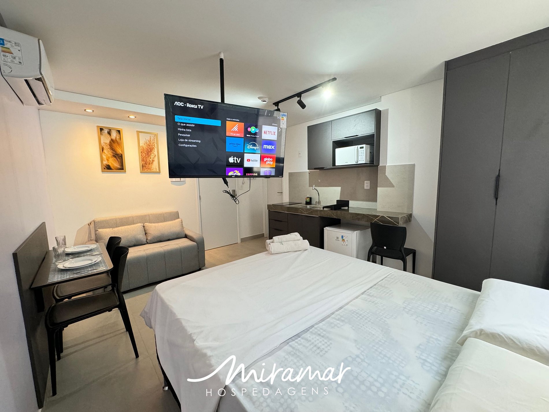 Flat equipado com smart tv; eletrodomésticos, enxoval de cama e banho, utensílios básicos domésticos. Oferecemos 1 quarto com cama de casal e sofá cama, ar condicionado, wif-fi e muito conforto.