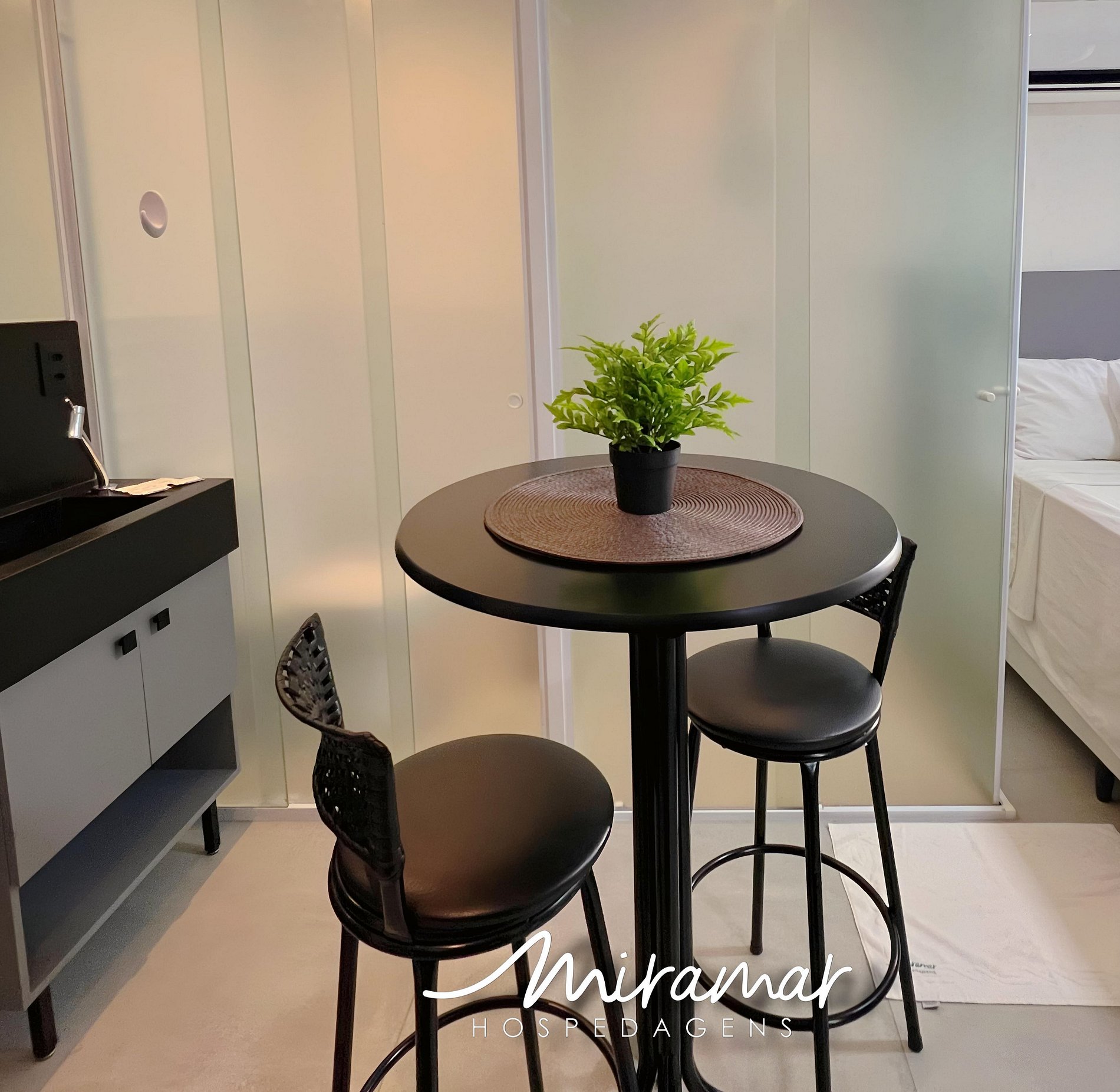 Este confortável flat é ideal para até 2 pessoas. Com uma cama de casal, ar-condicionado, TV Smart e Wi-Fi, você terá todo o conforto ao seu alcance. A cozinha compacta é equipada com micro-ondas, sanduicheira, cafeteira e frigobar, proporcionando tudo o que você precisa para preparar refeições básicas. Desfrute de momentos agradáveis na mesa central, perfeita para um brinde com vinho ou para trabalhar em seu computador.