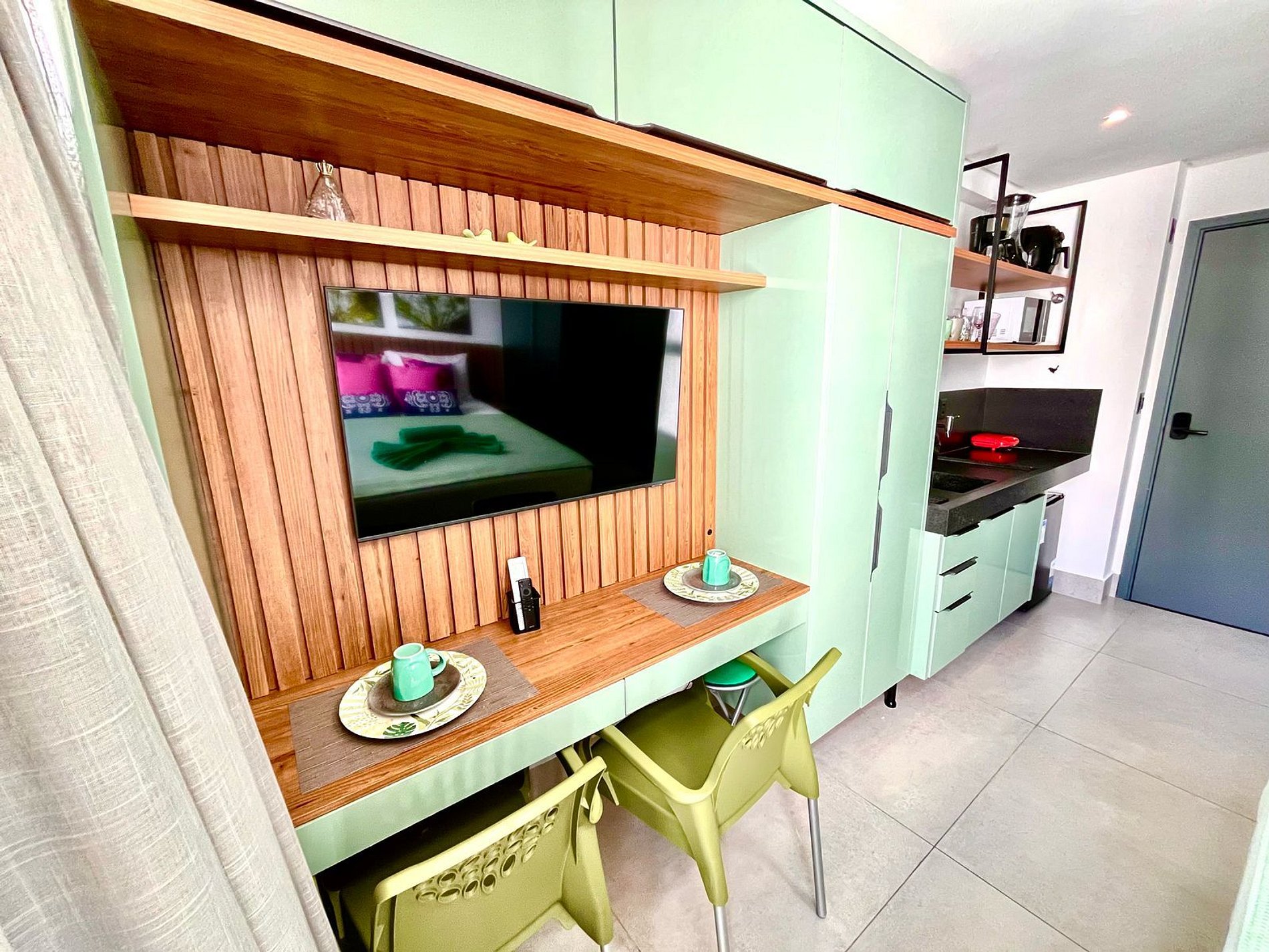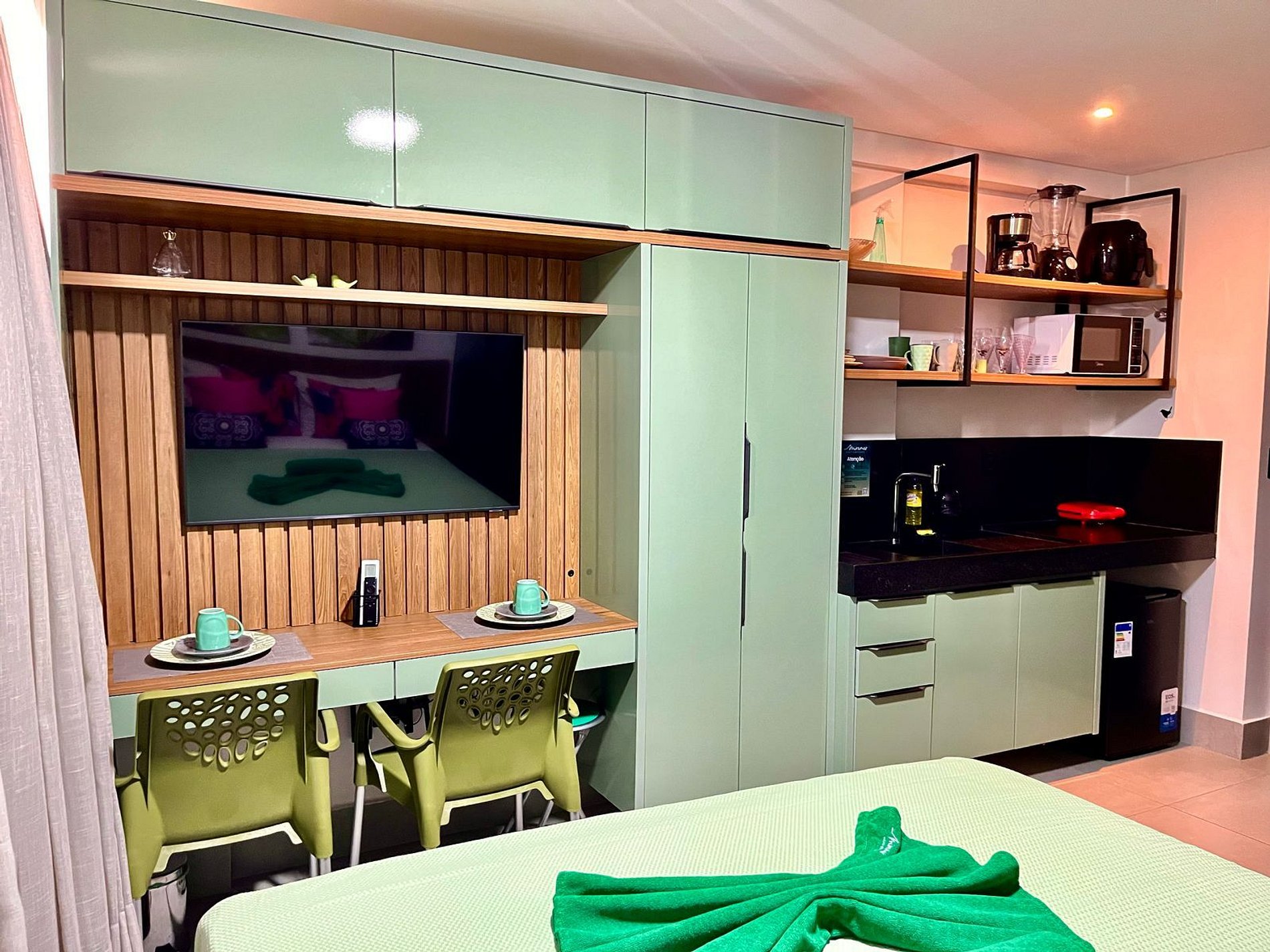 A cozinha está equipada com eletrodomésticos modernos, como frigobar, fogão electrônico e micro-ondas, tornando fácil a preparação de refeições rápidas e práticas. Adicionalmente, oferecemos um enxoval de cama e banho, incluindo lençóis e toalhas, além de utensílios básicos para preparar e desfrutar de suas refeições no conforto do seu próprio espaço.