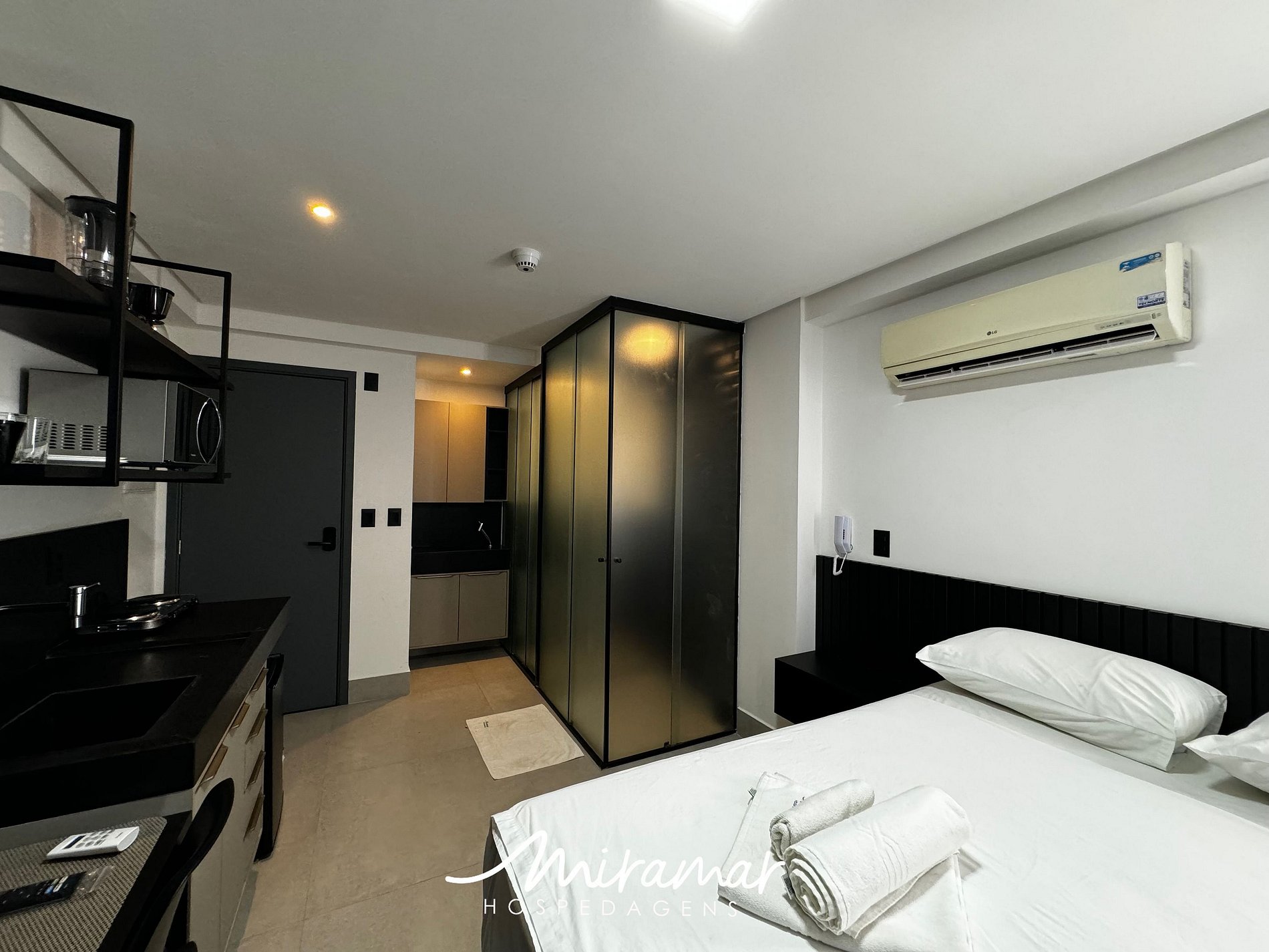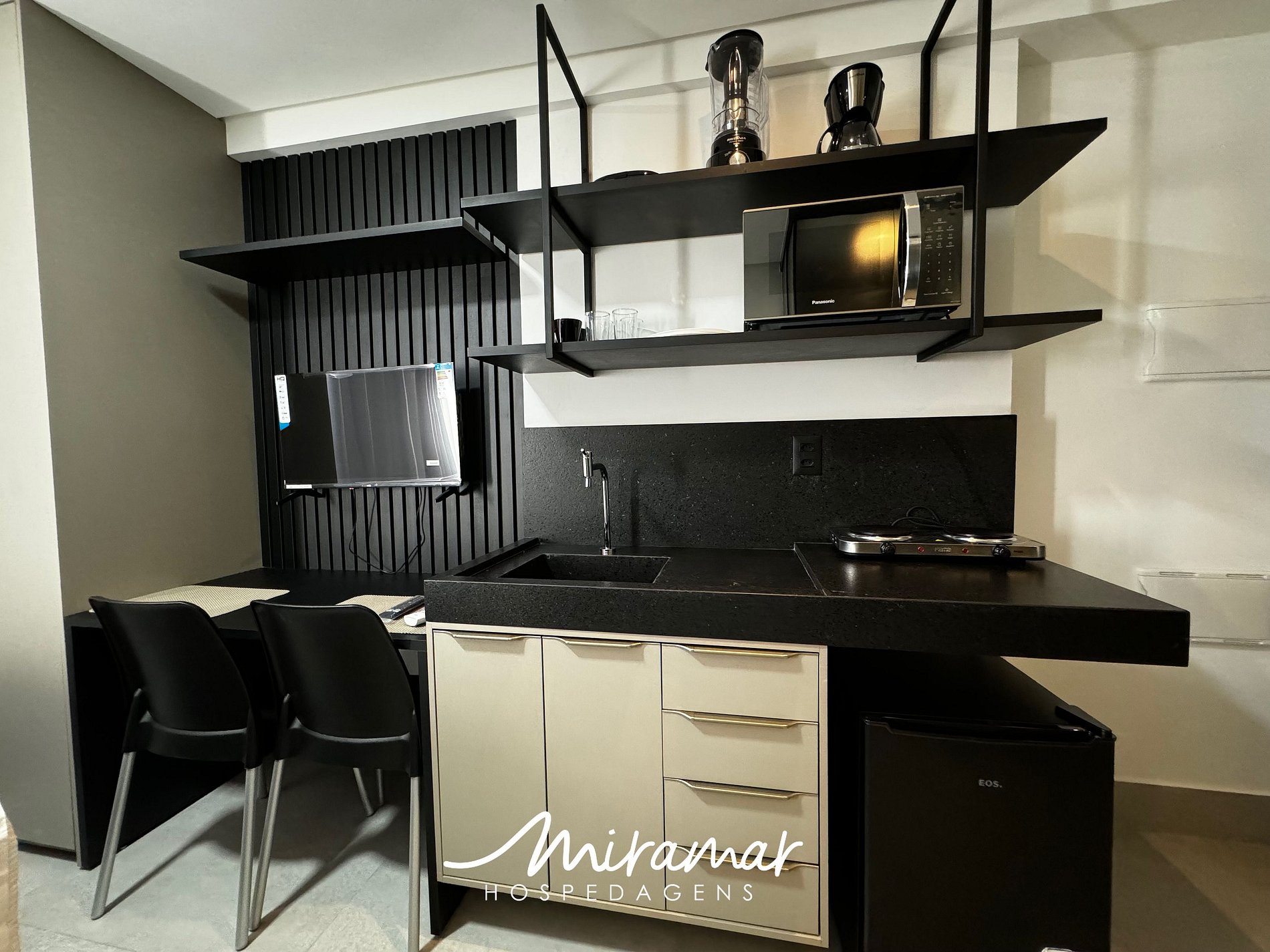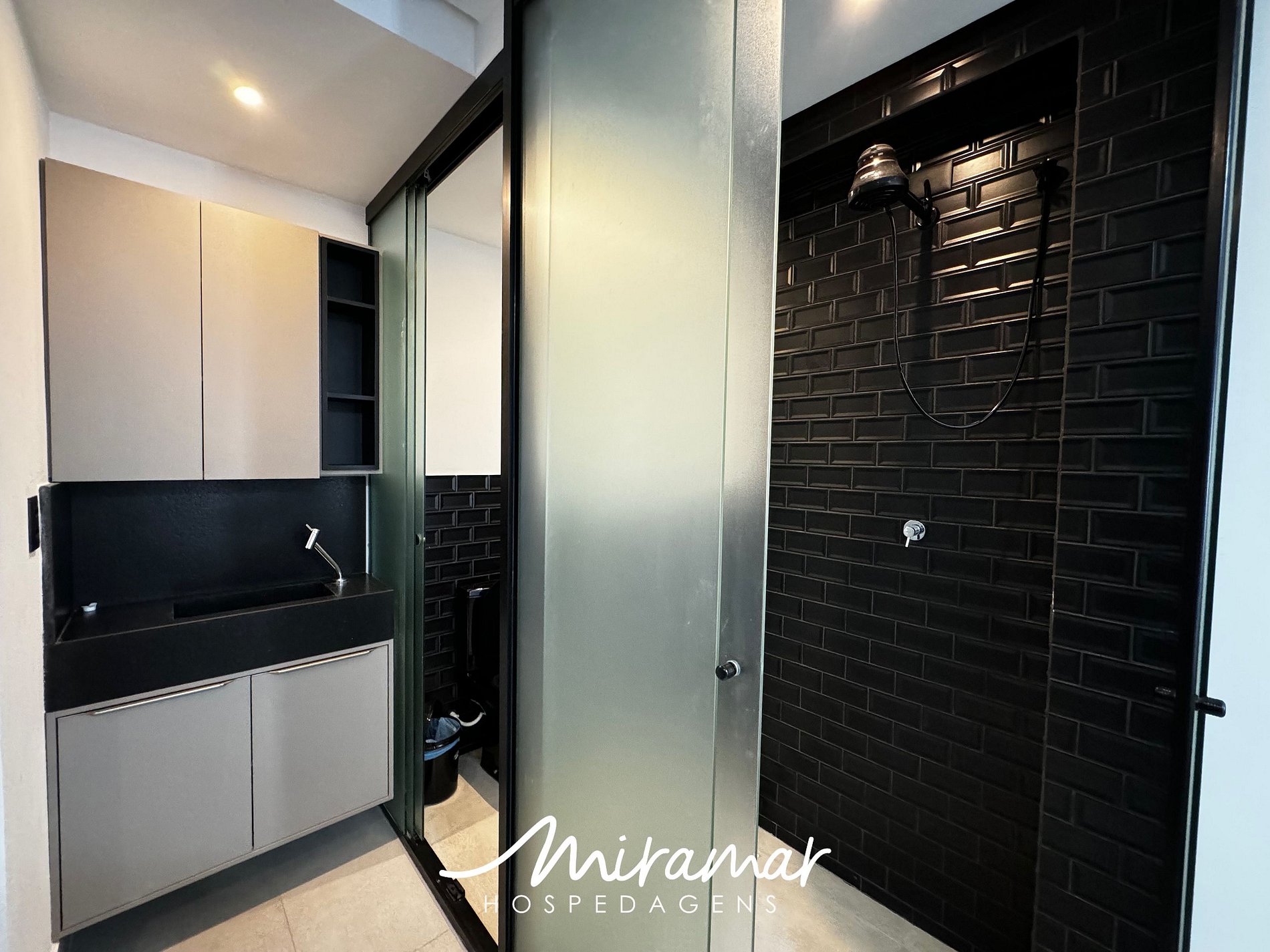 A cozinha está equipada com eletrodomésticos modernos, como frigobar, fogão electrônico e micro-ondas, tornando fácil a preparação de refeições rápidas e práticas. Adicionalmente, oferecemos um enxoval de cama e banho, incluindo lençóis e toalhas, além de utensílios básicos para preparar e desfrutar de suas refeições no conforto do seu próprio espaço.