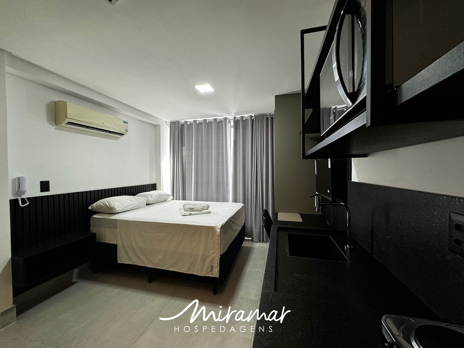 A cozinha está equipada com eletrodomésticos modernos, como frigobar, fogão electrônico e micro-ondas, tornando fácil a preparação de refeições rápidas e práticas. Adicionalmente, oferecemos um enxoval de cama e banho, incluindo lençóis e toalhas, além de utensílios básicos para preparar e desfrutar de suas refeições no conforto do seu próprio espaço.