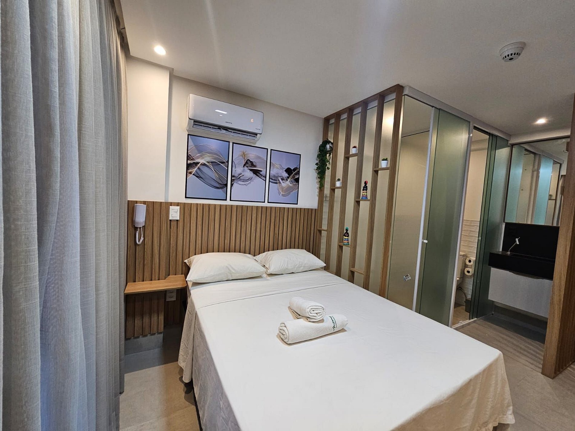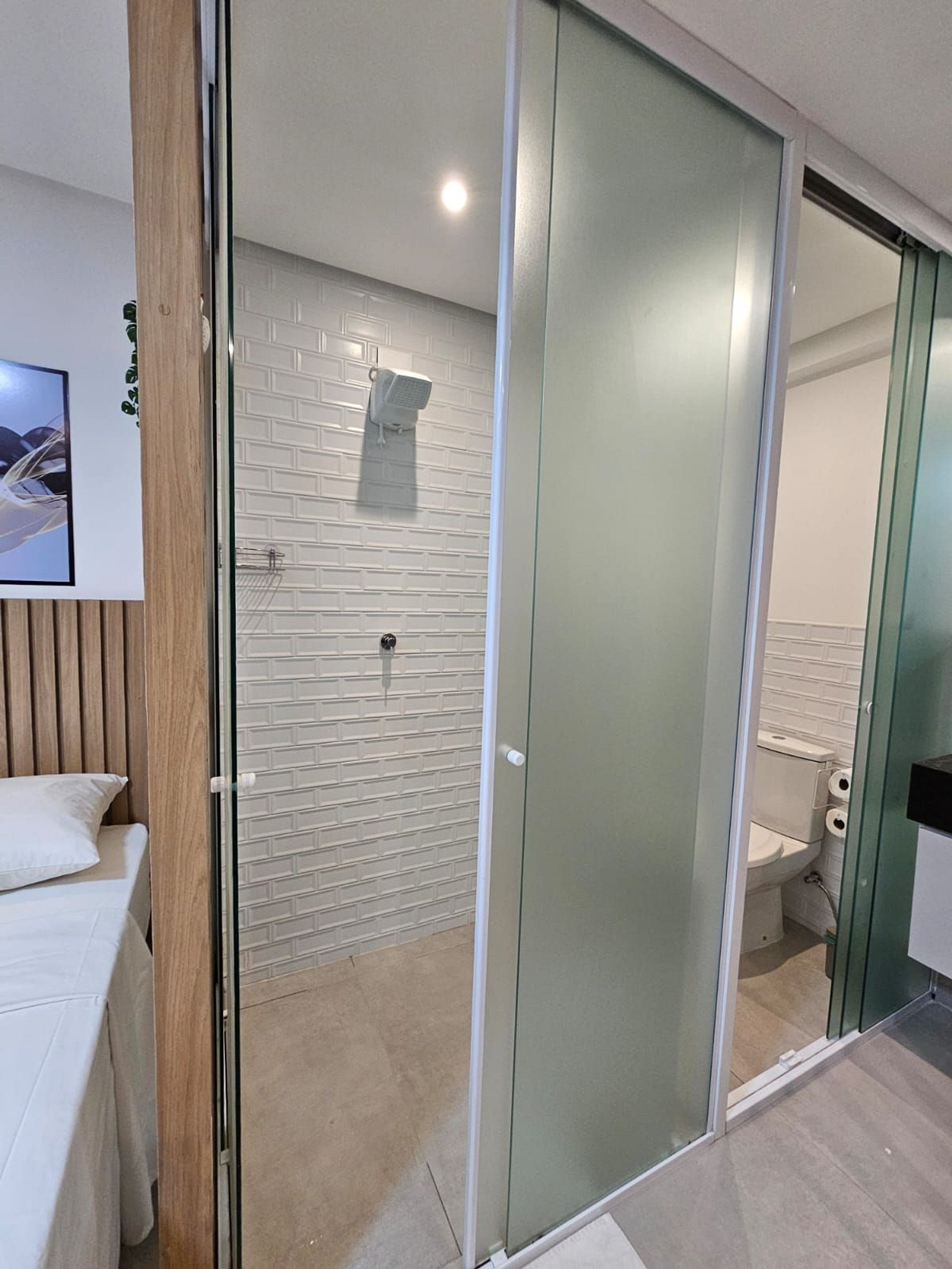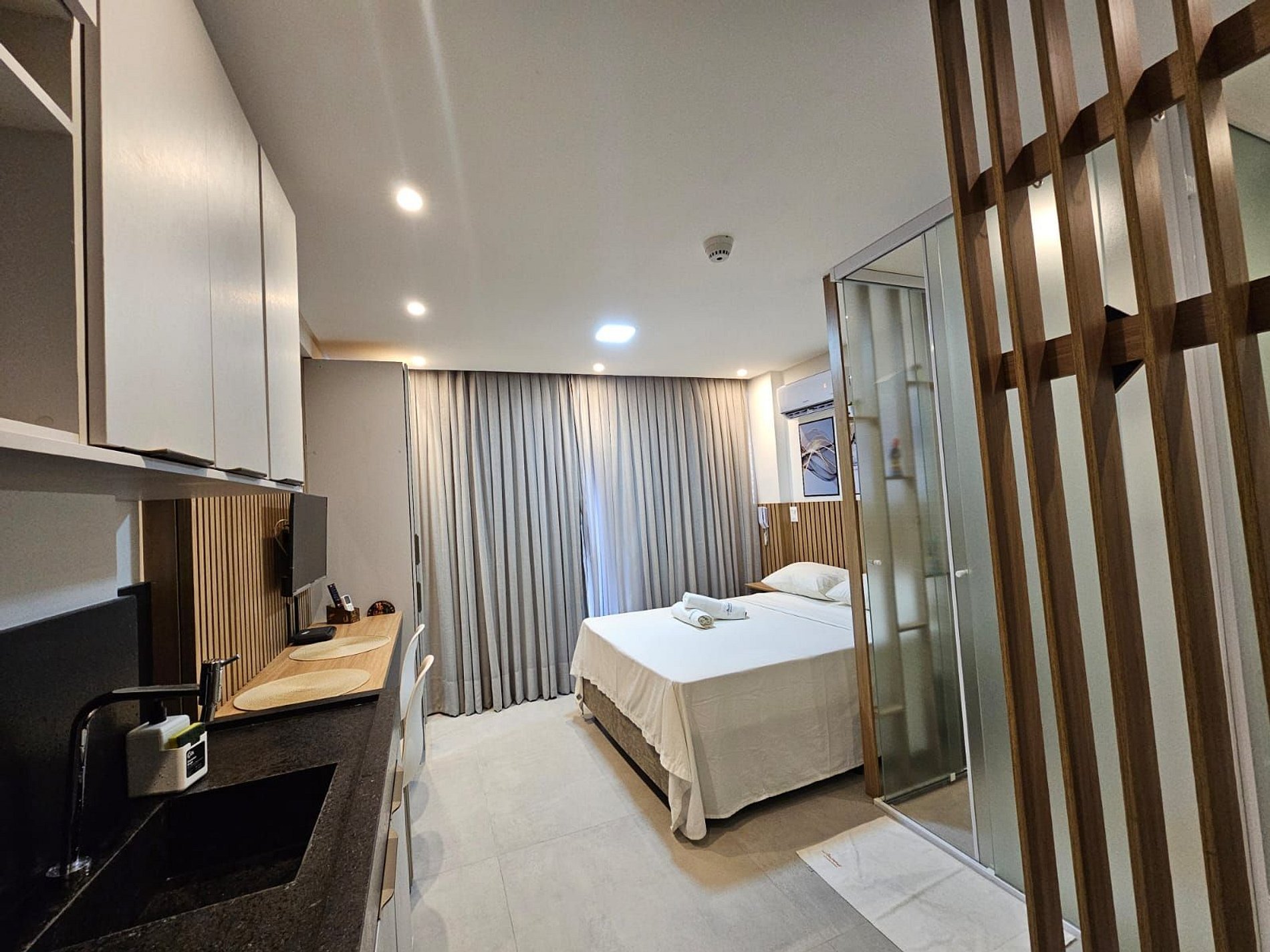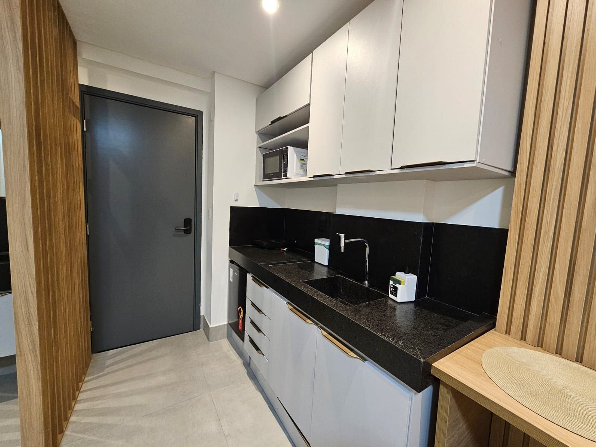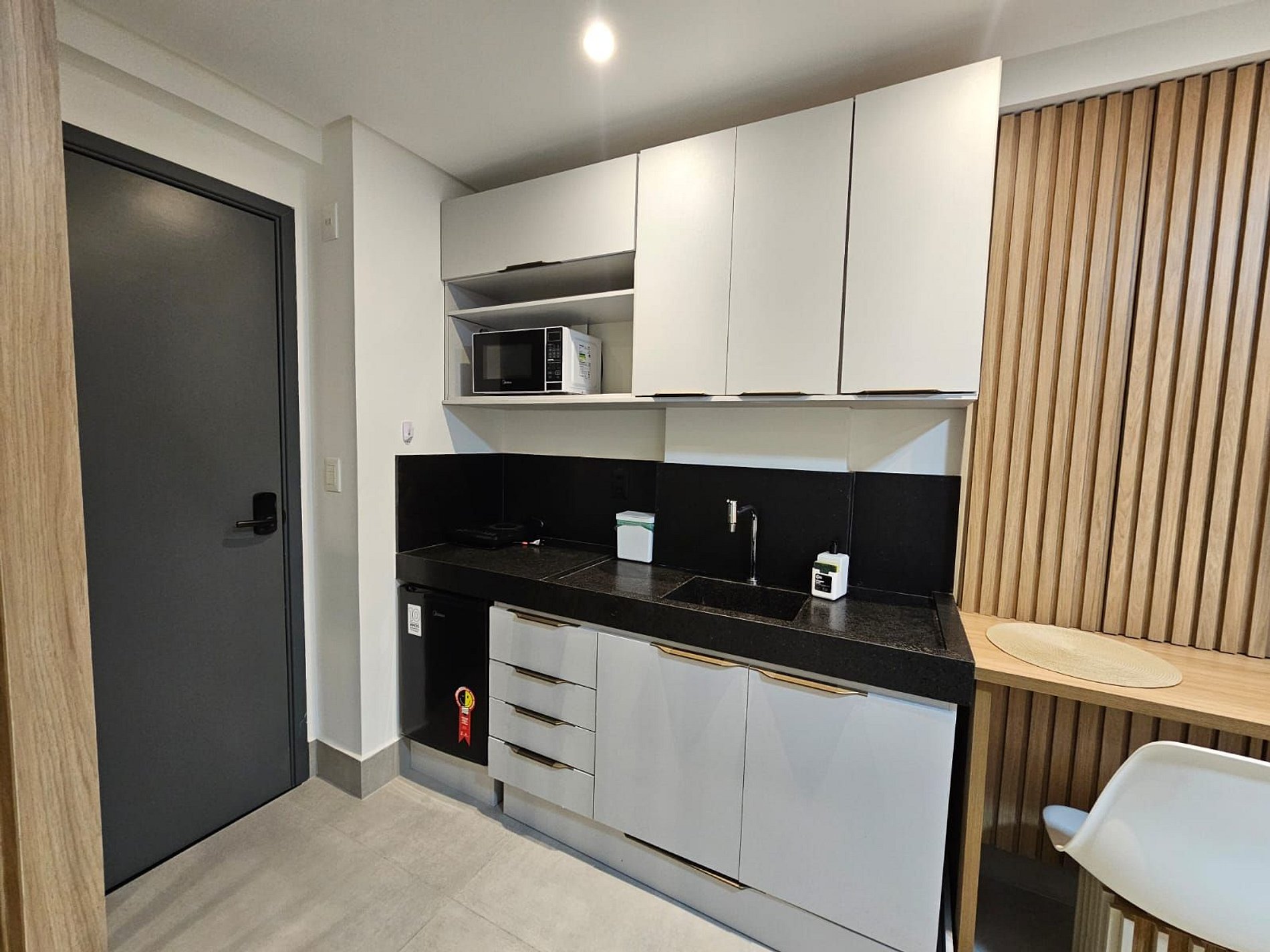 A cozinha está equipada com eletrodomésticos modernos, como frigobar, fogão, cafeteira, sanduícheira. micro-ondas, tornando fácil a preparação de refeições rápidas e práticas. Adicionalmente, oferecemos um enxoval de cama e banho, incluindo lençóis e toalhas, além de utensílios básicos para preparar e desfrutar de suas refeições no conforto do seu próprio espaço.