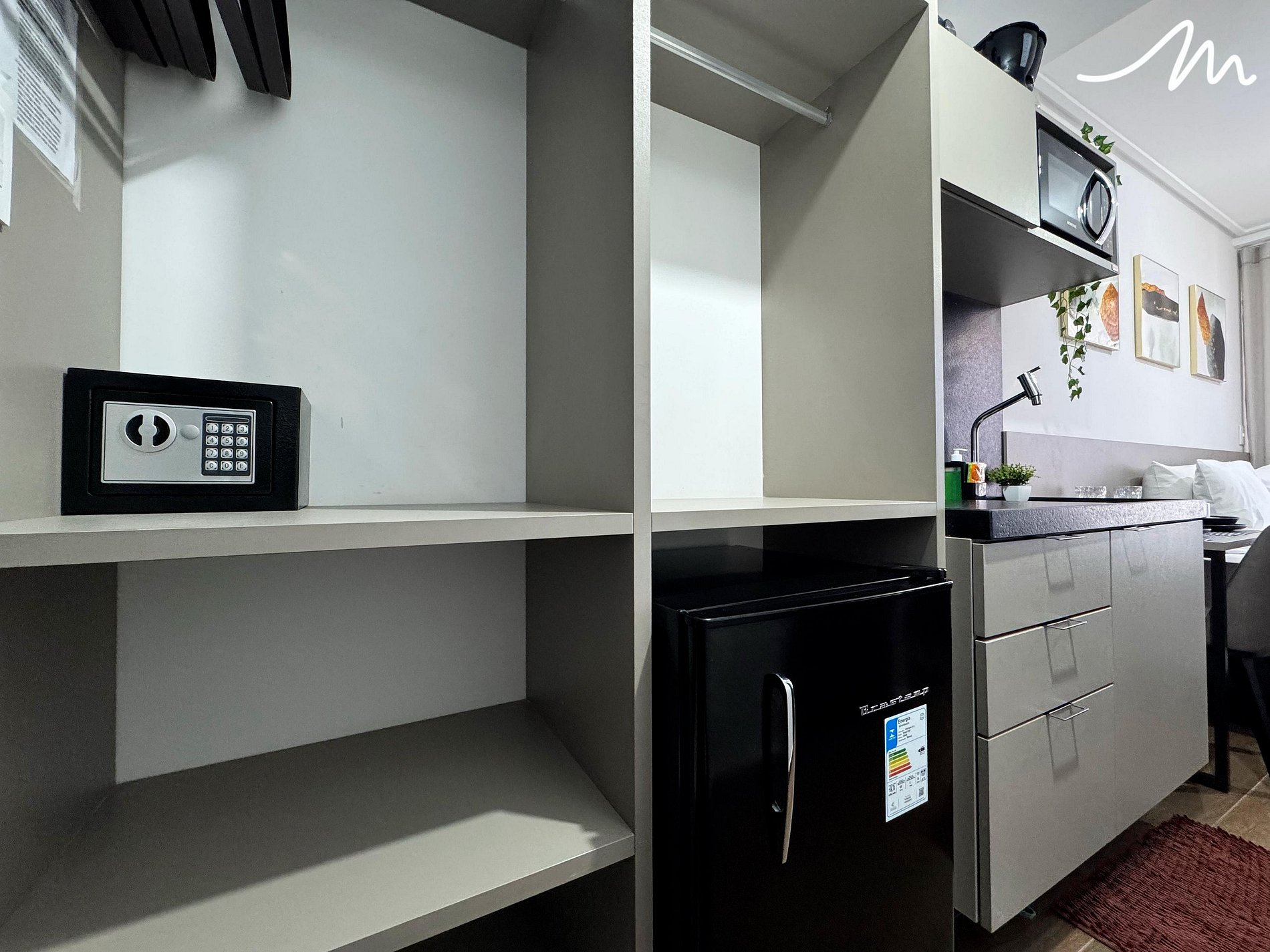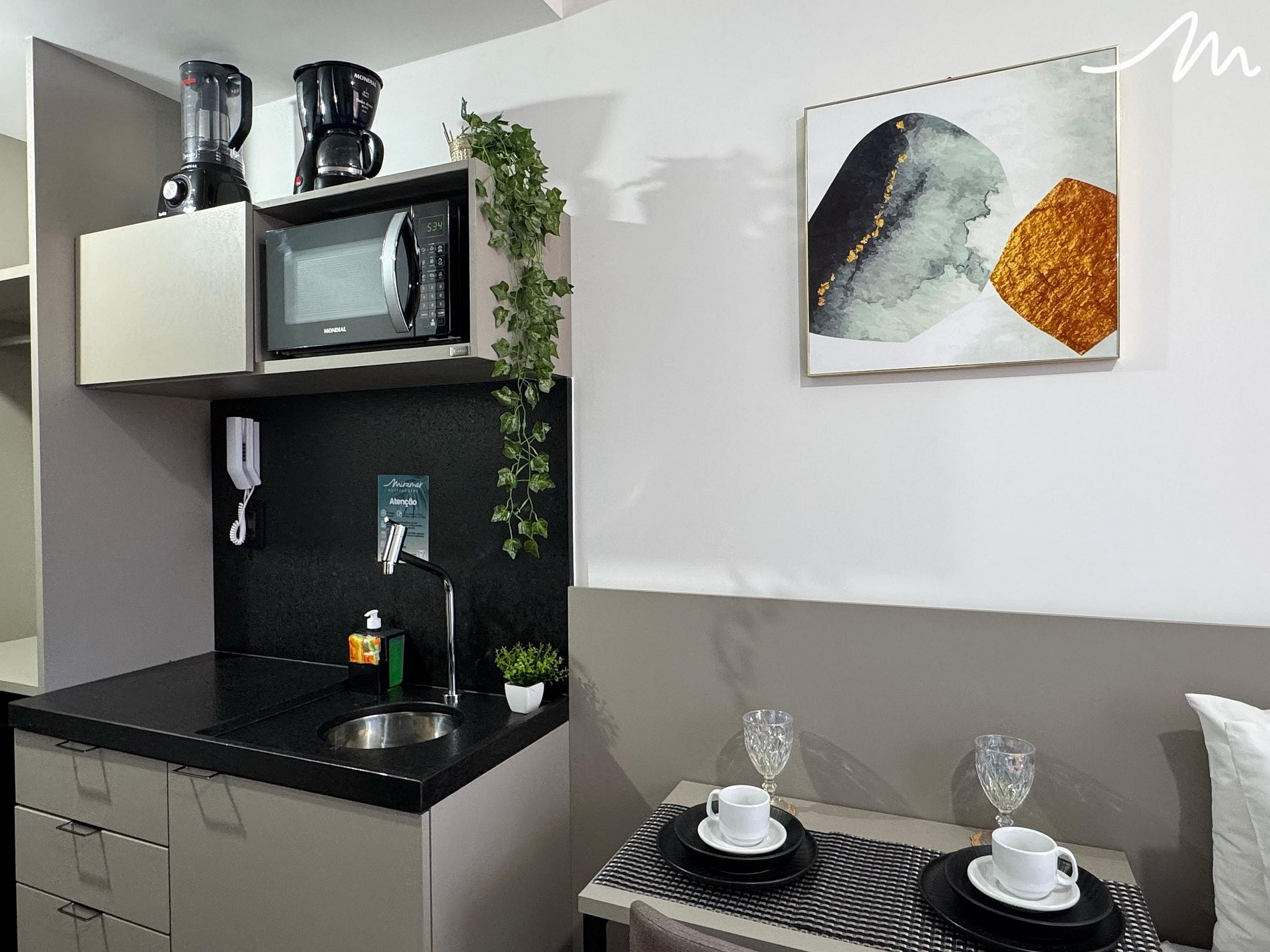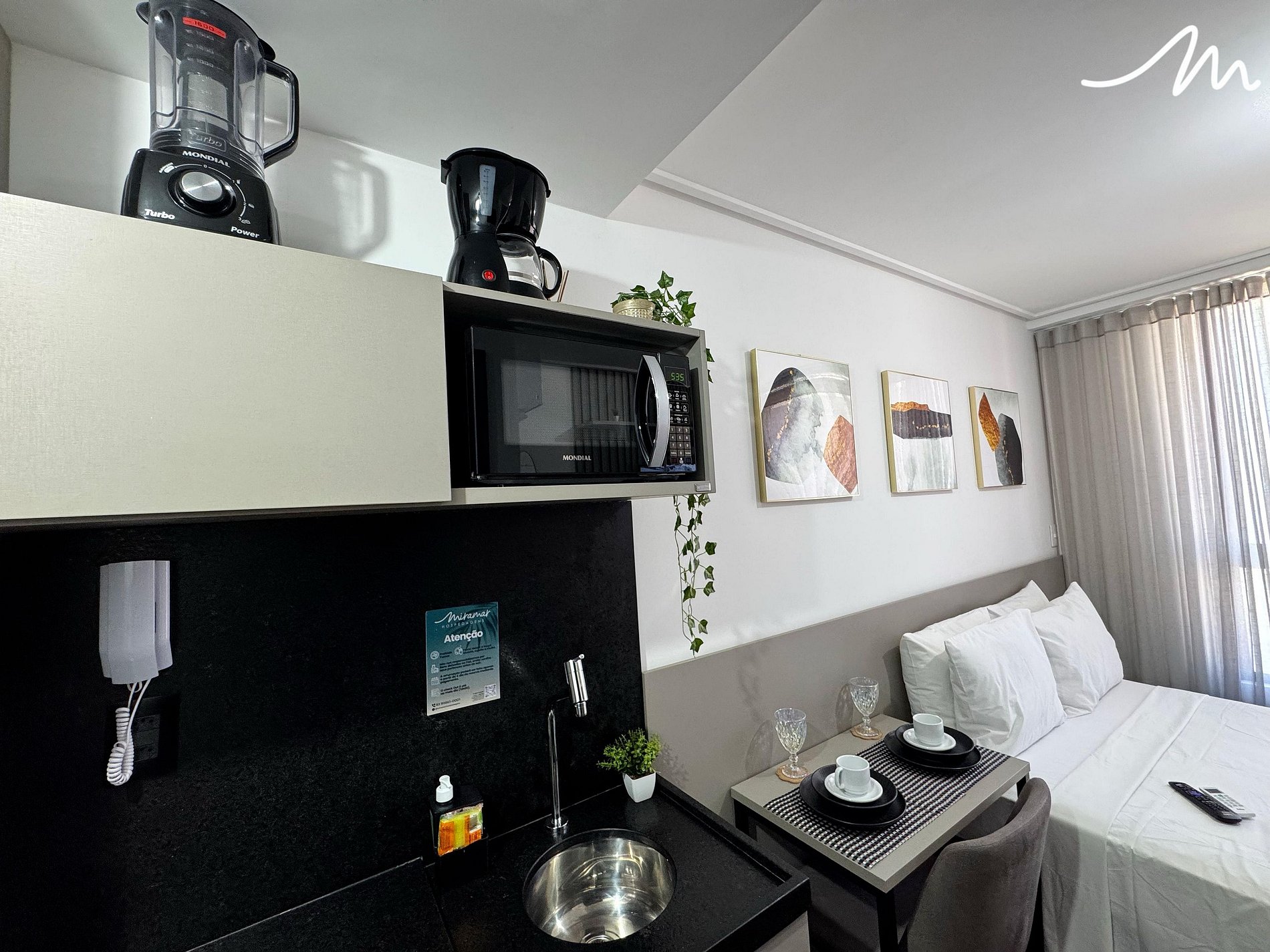 A cozinha compacta inclui frigobar, micro-ondas, liquidificador e sanduicheira.