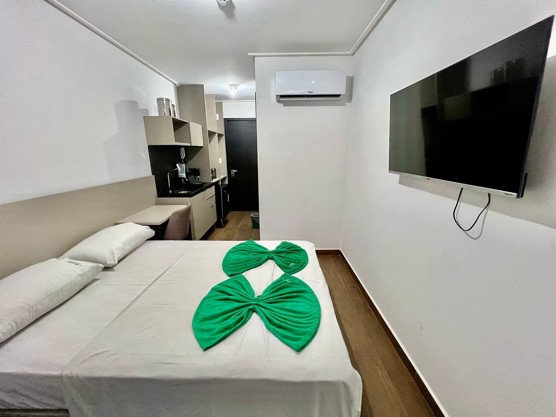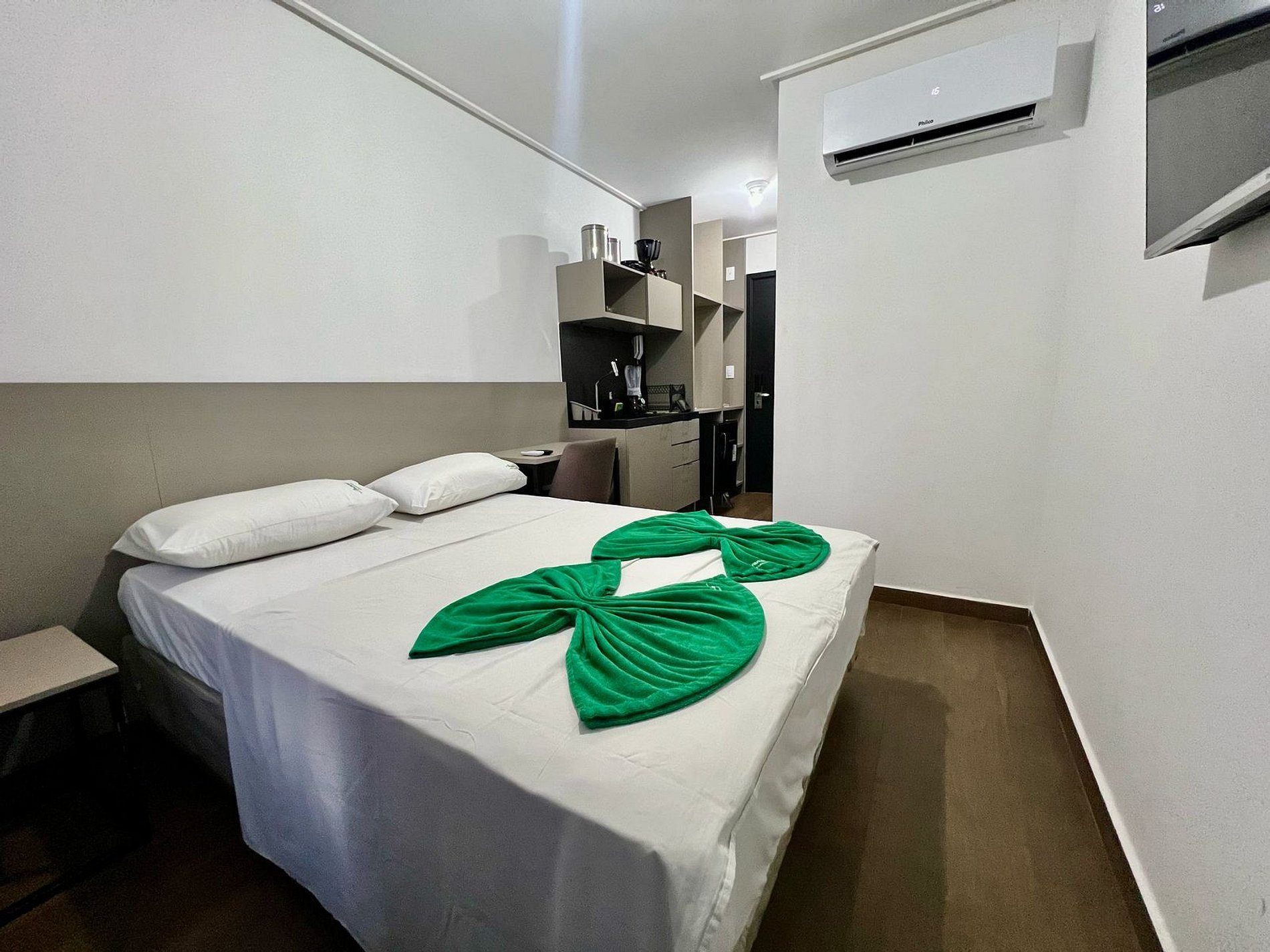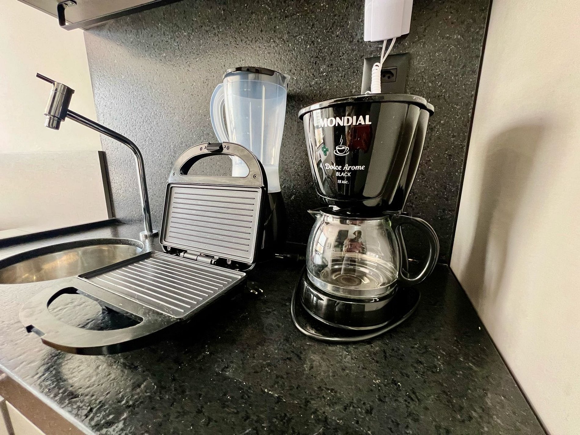 Nosso sofisticado flat proporciona uma estadia confortável e prática, com uma cama de casal, ar condicionado e uma smart TV para momentos de entretenimento e descanso. Equipado com utensílios essenciais como frigobar, sanduicheira e cafefeita, é perfeito para preparar refeições rápidas e saborosas. Combinando conveniência e conforto, nosso flat oferece uma experiência de estadia verdadeiramente excepcional.