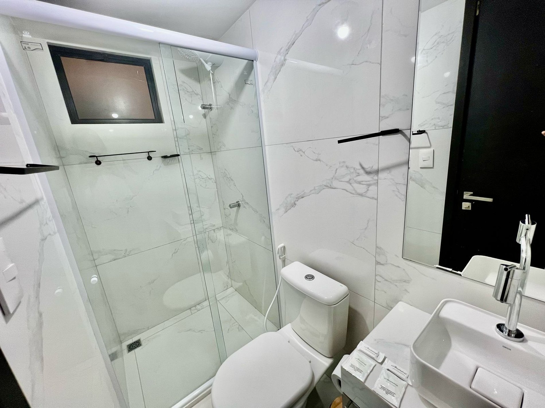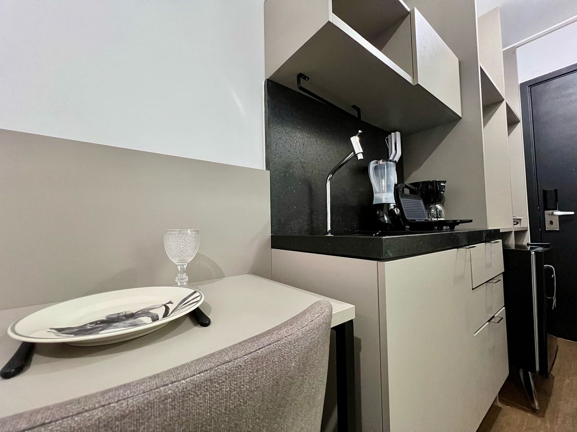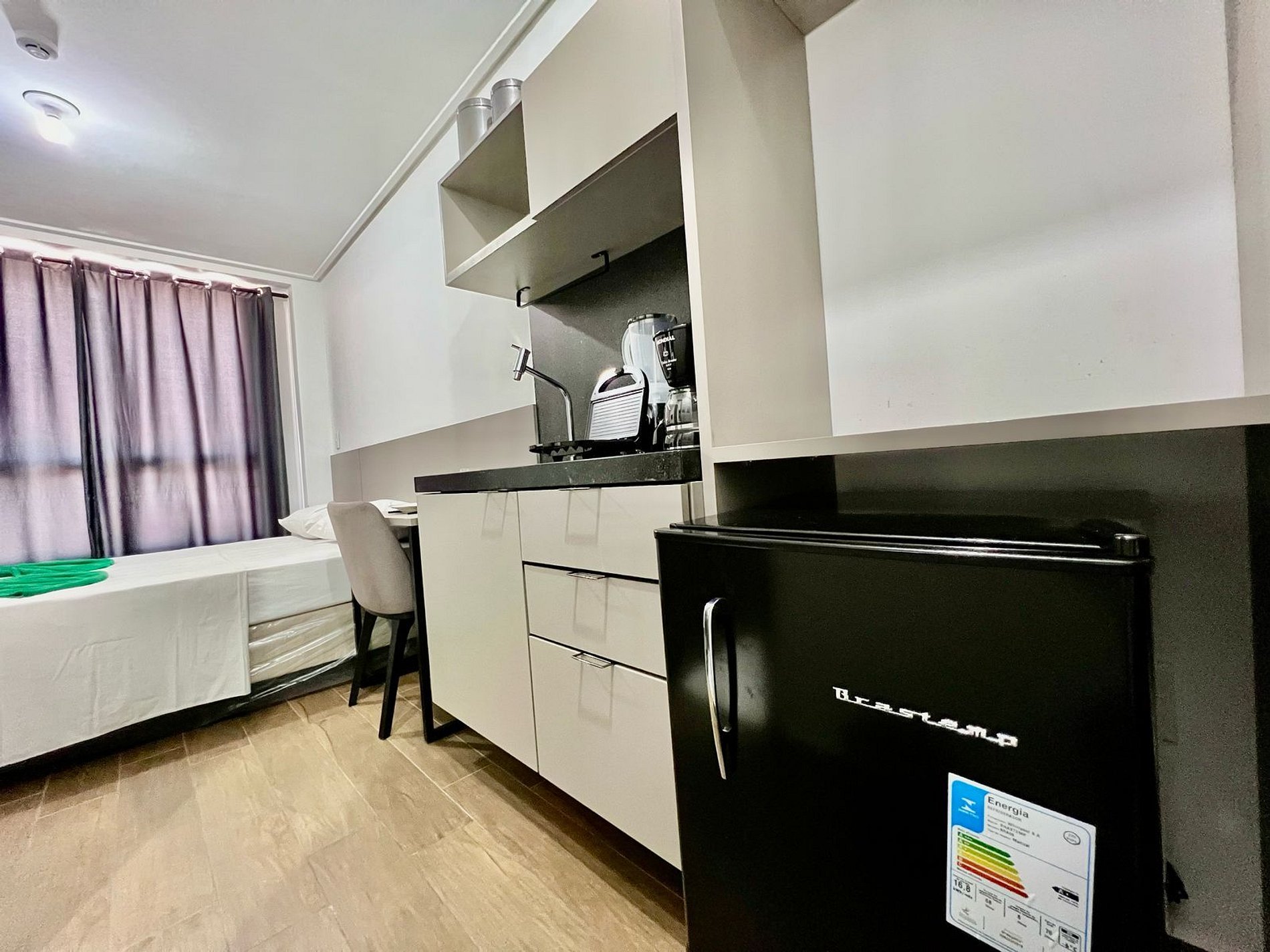 Nosso sofisticado flat proporciona uma estadia confortável e prática, com uma cama de casal, ar condicionado e uma smart TV para momentos de entretenimento e descanso. Equipado com utensílios essenciais como frigobar, sanduicheira e cafefeita, é perfeito para preparar refeições rápidas e saborosas. Combinando conveniência e conforto, nosso flat oferece uma experiência de estadia verdadeiramente excepcional.