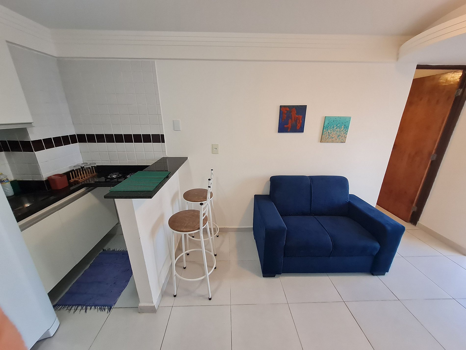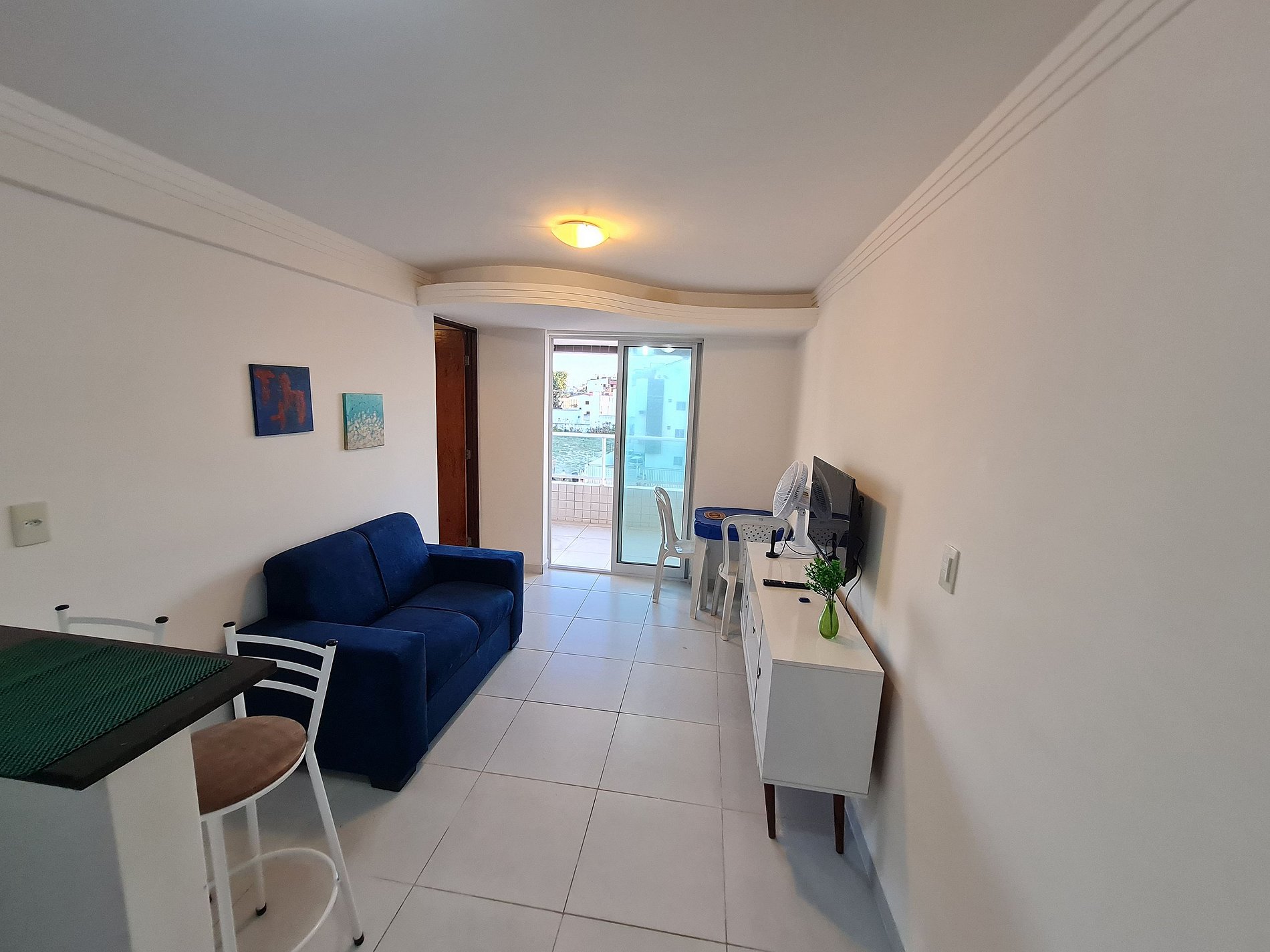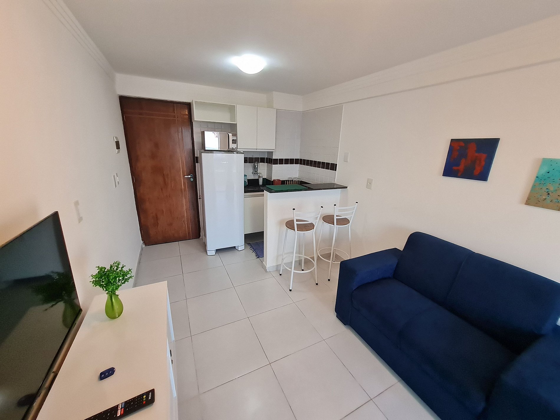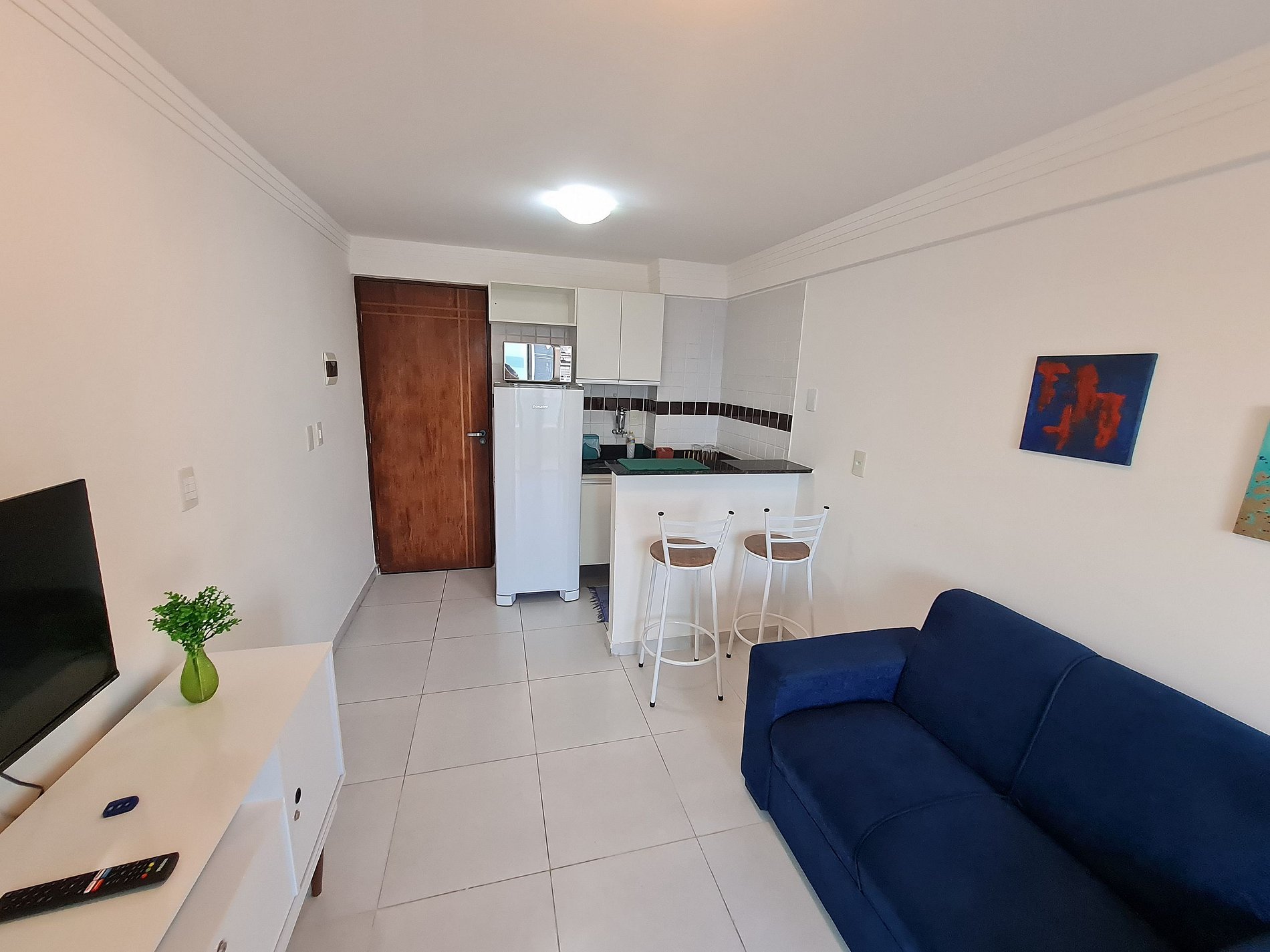 Apartamento de 1 quarto completo, possui uma cama muito confortável no quarto, ar condicionado no quarto, sala com um ótimo sofá cama e uma tv, a cozinha é equipada com geladeira, fogão, microondas, mesa, cadeiras e outros itens.