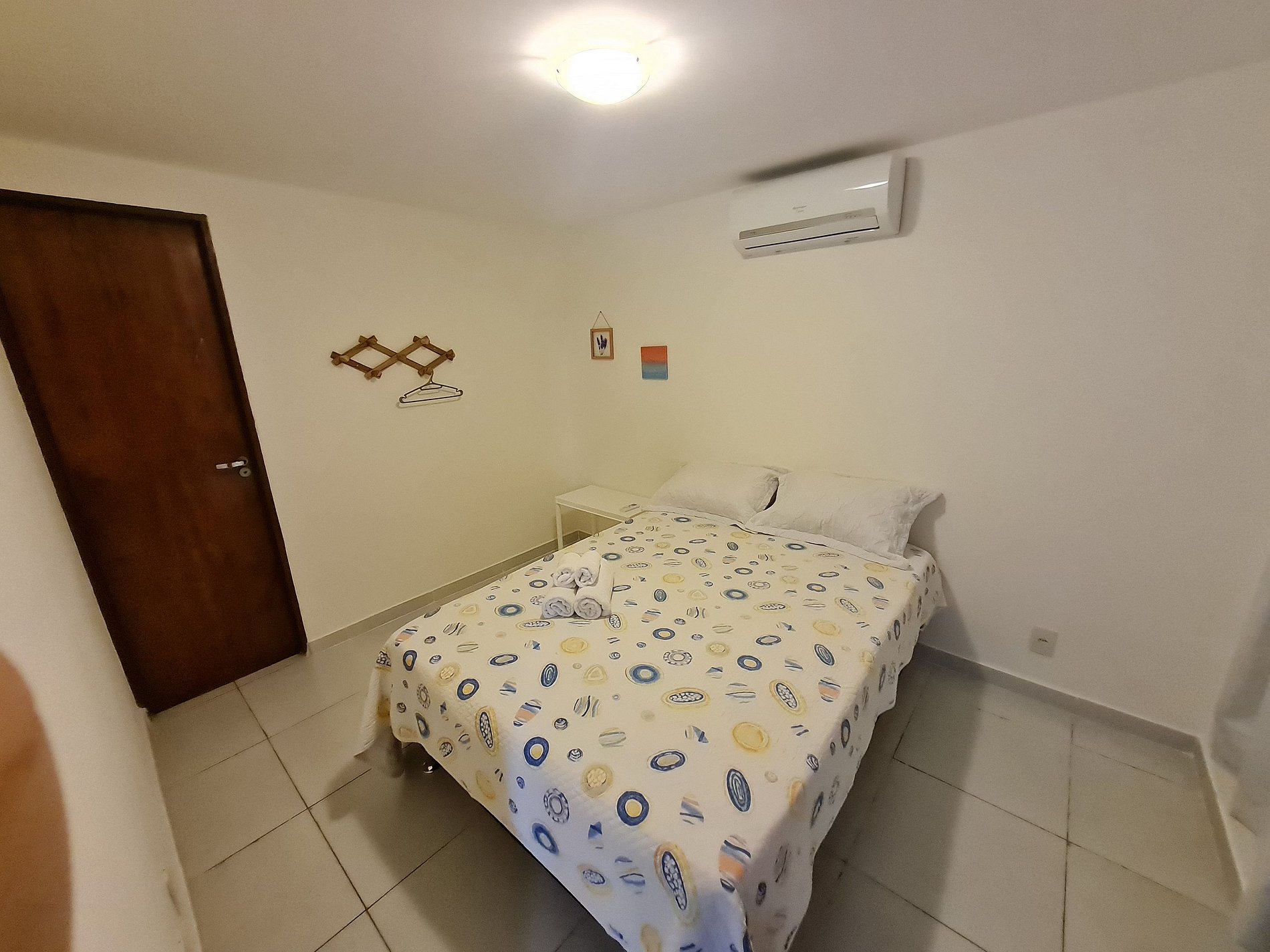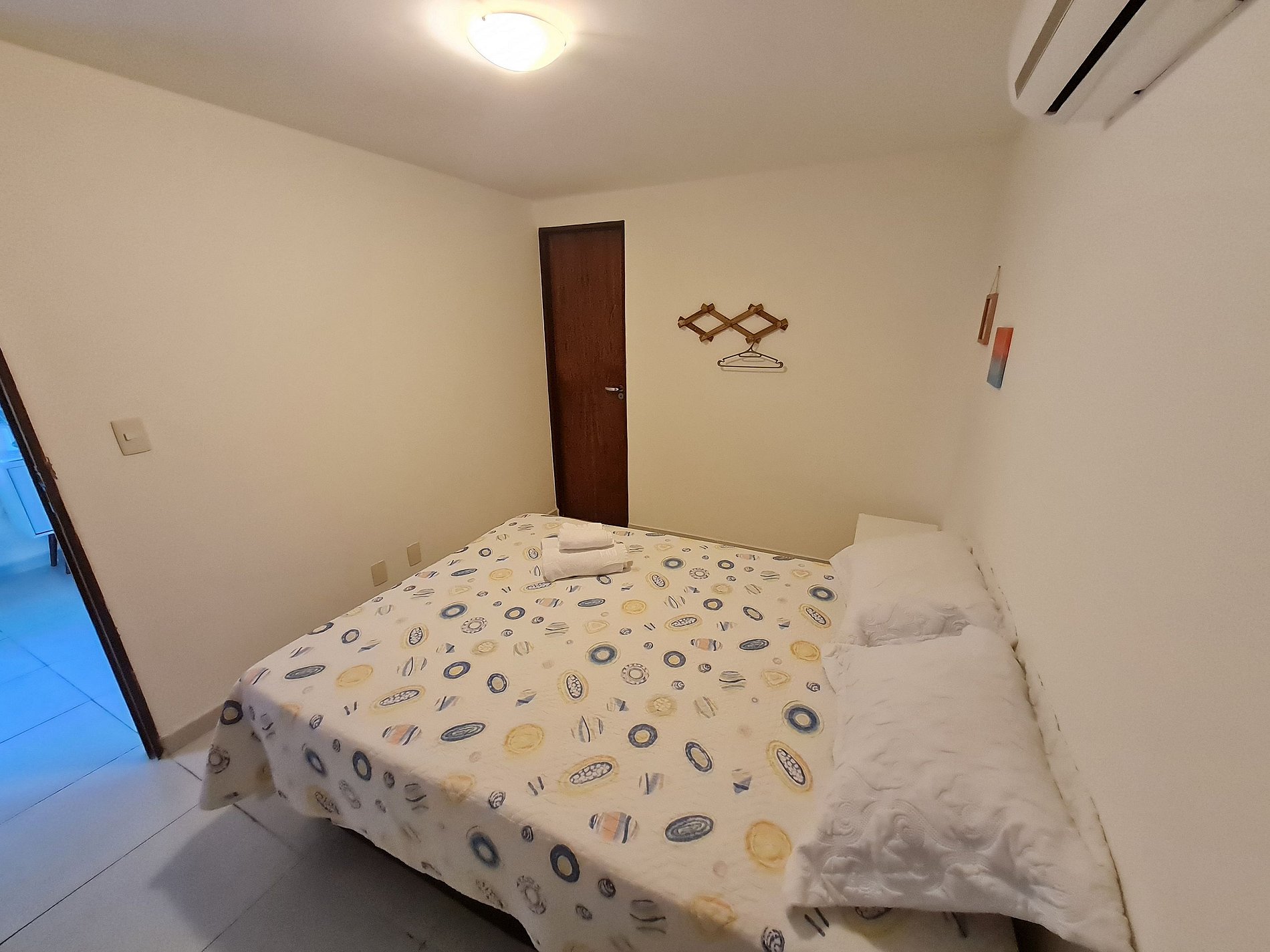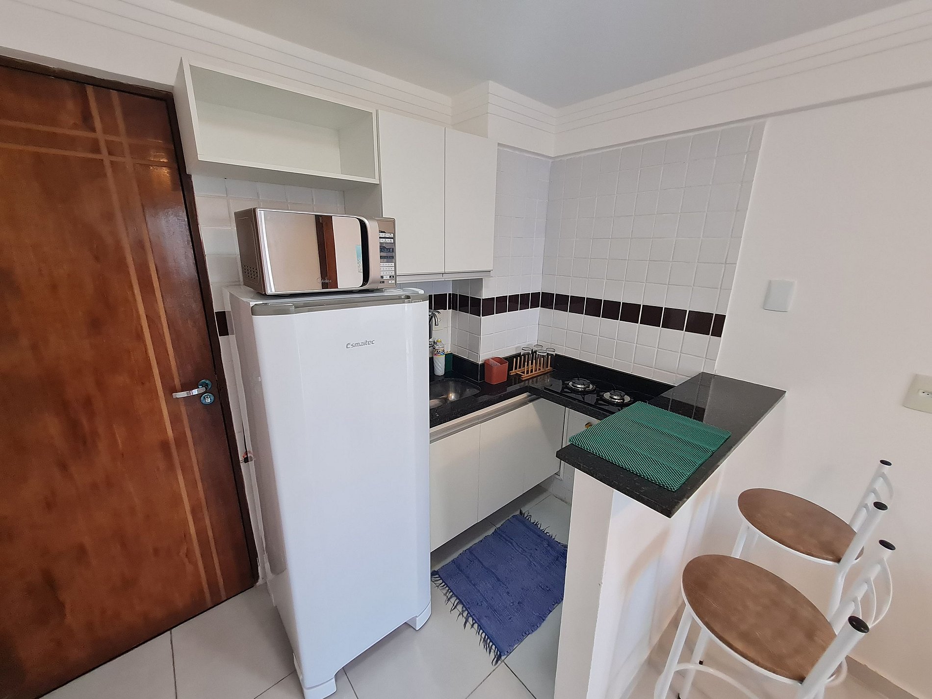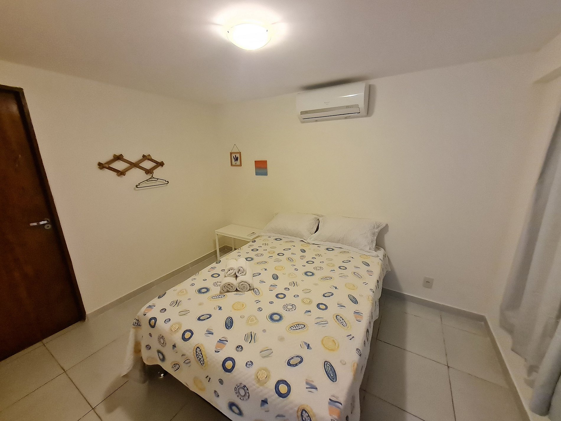 Apartamento de 1 quarto completo, possui uma cama muito confortável no quarto, ar condicionado no quarto, sala com um ótimo sofá cama e uma tv, a cozinha é equipada com geladeira, fogão, microondas, mesa, cadeiras e outros itens.